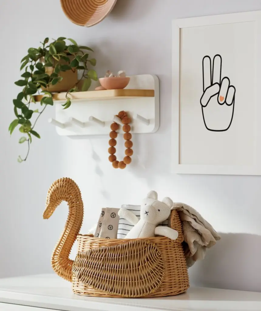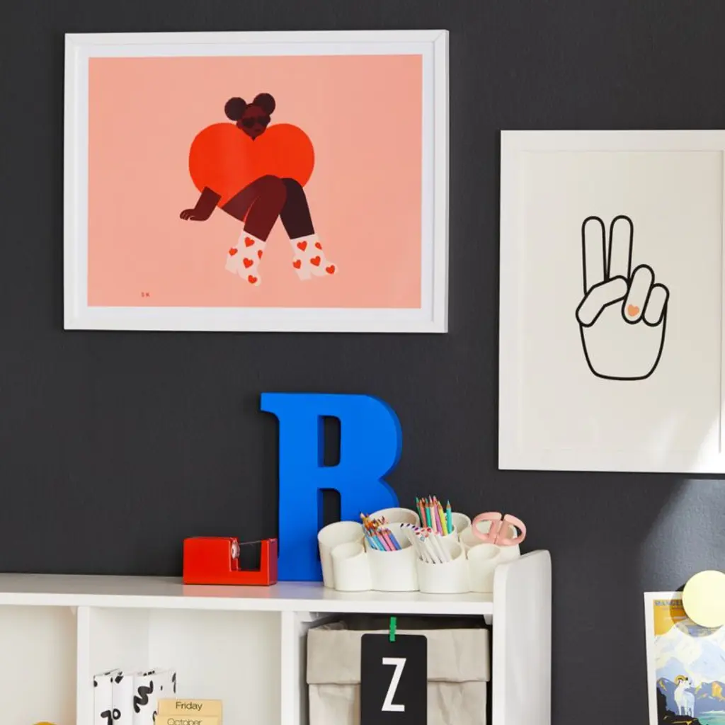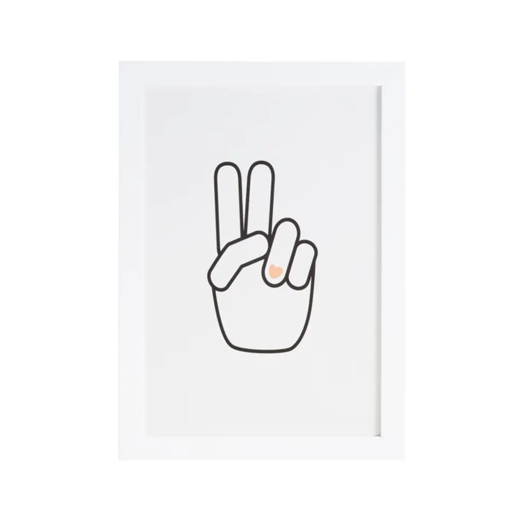 Timeless and cool, this framed wall art is adorned with a hand giving the peace sign (look closely and spot a tiny heart on its fingernail). The simply stylish graphic style and color palette allows it to match a wide variety of decor. It's especially at home in boho kids rooms or nurseries, and will spread a positive message wherever it goes.