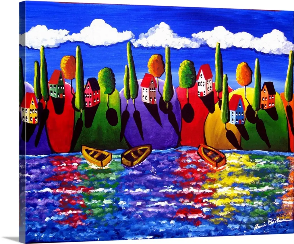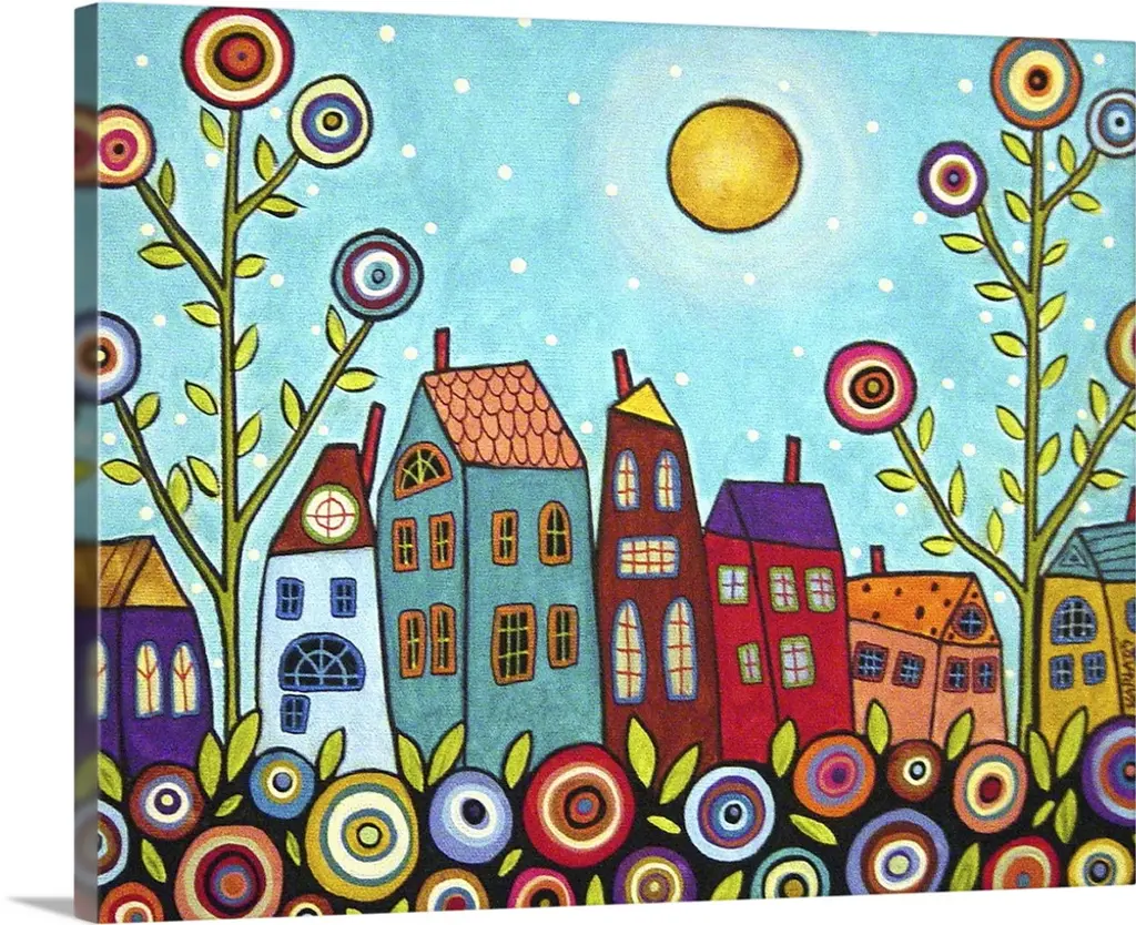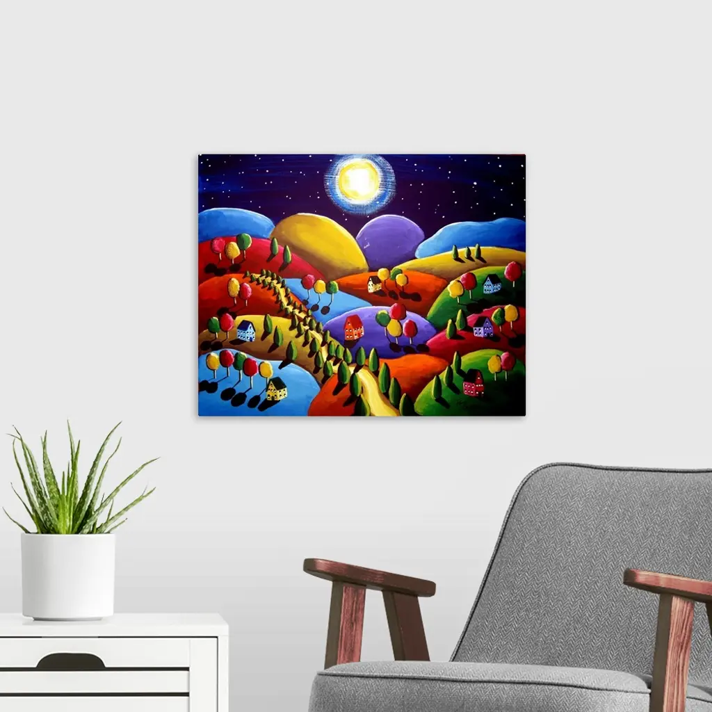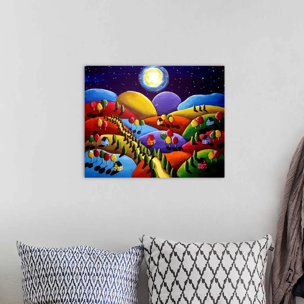 This is a lovely scene with whimsical houses and trees, with the houses done in bright colors on colorful hills. They are under a full moon.
