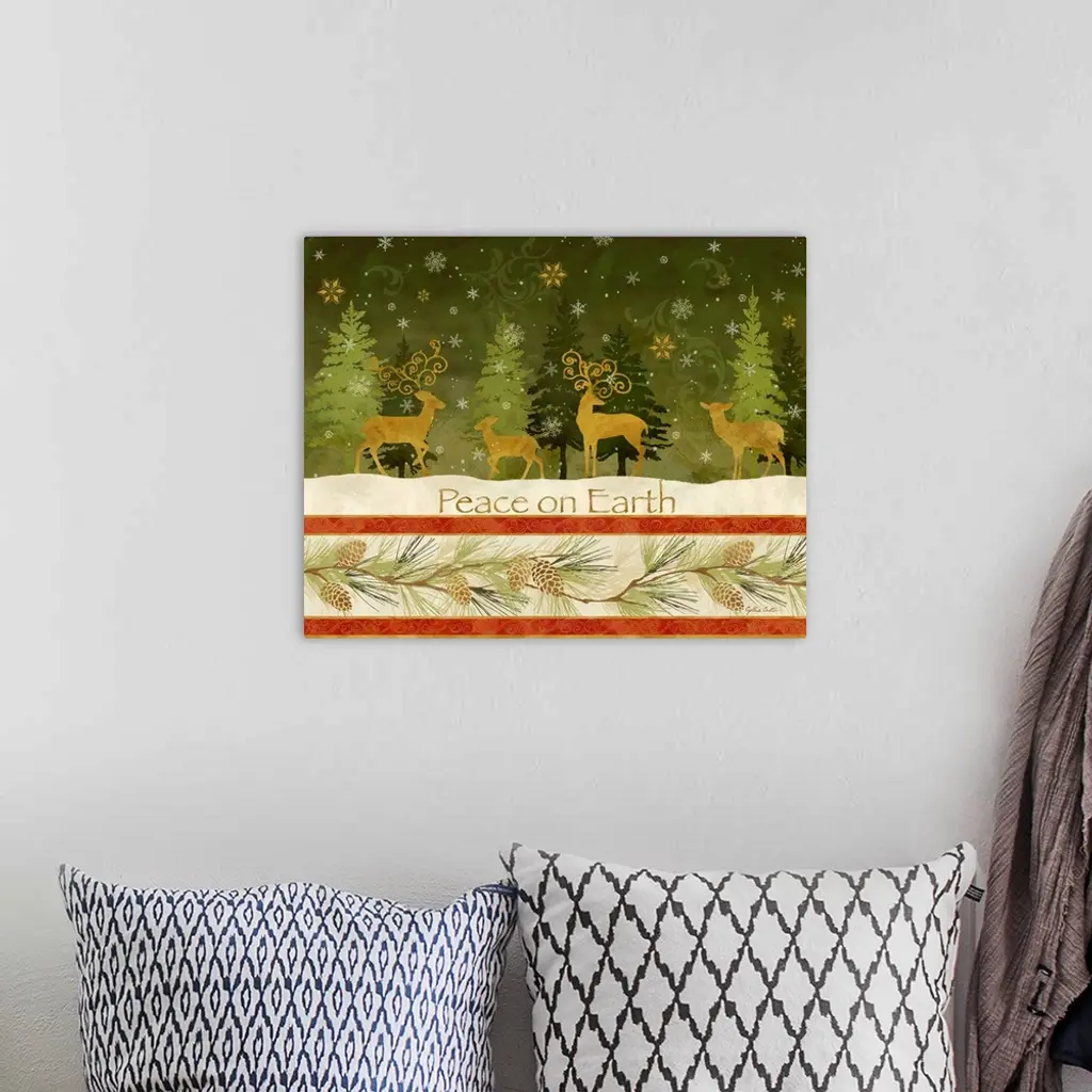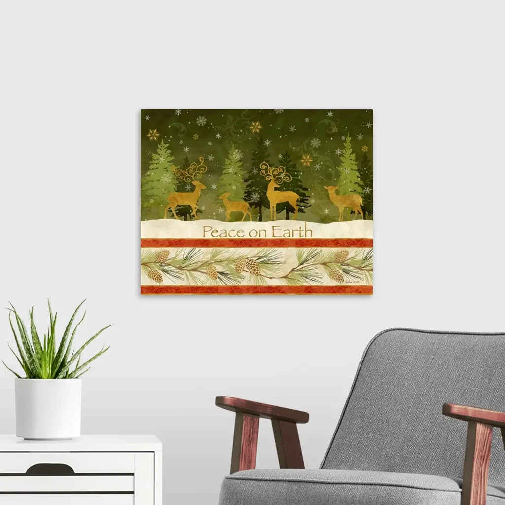 A decorative holiday design of a group of gold silhouetted deer in a forest during a snow fall with the text "Peace on Earth" below.