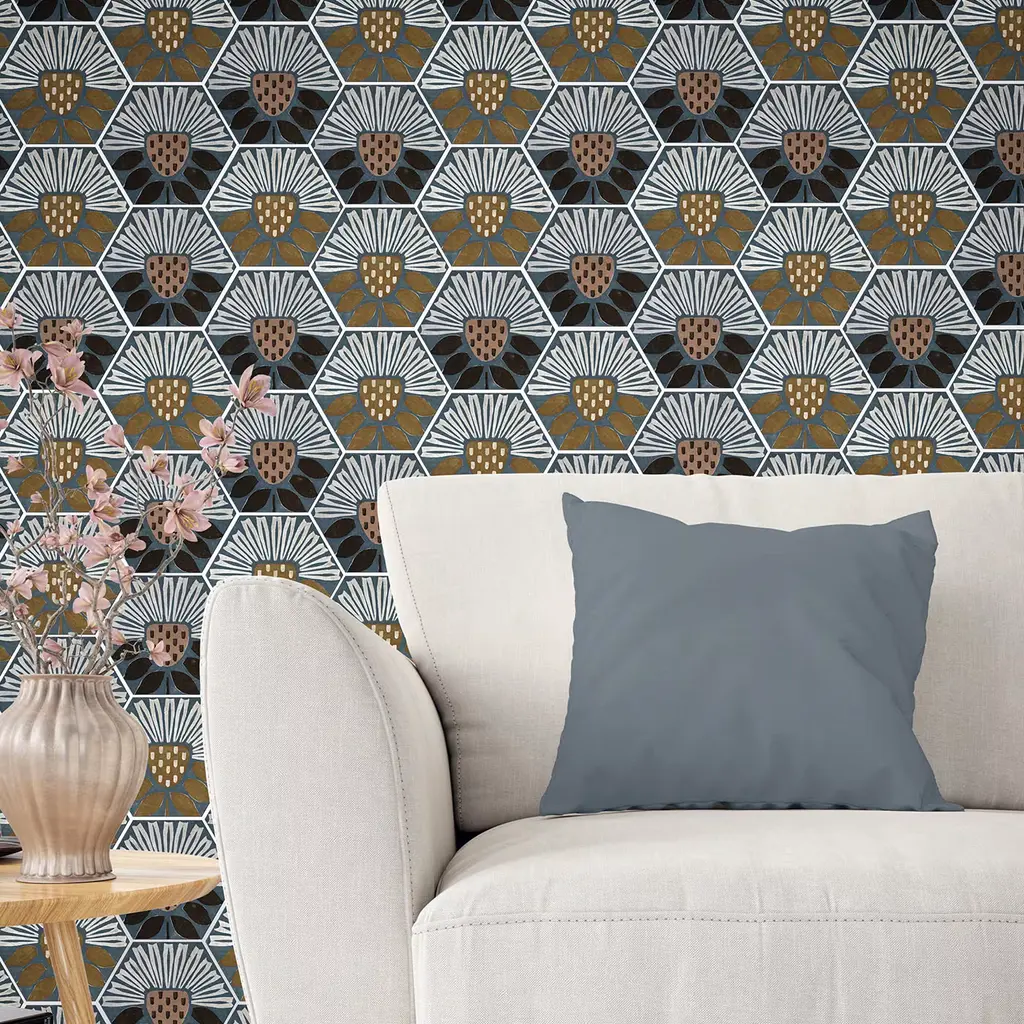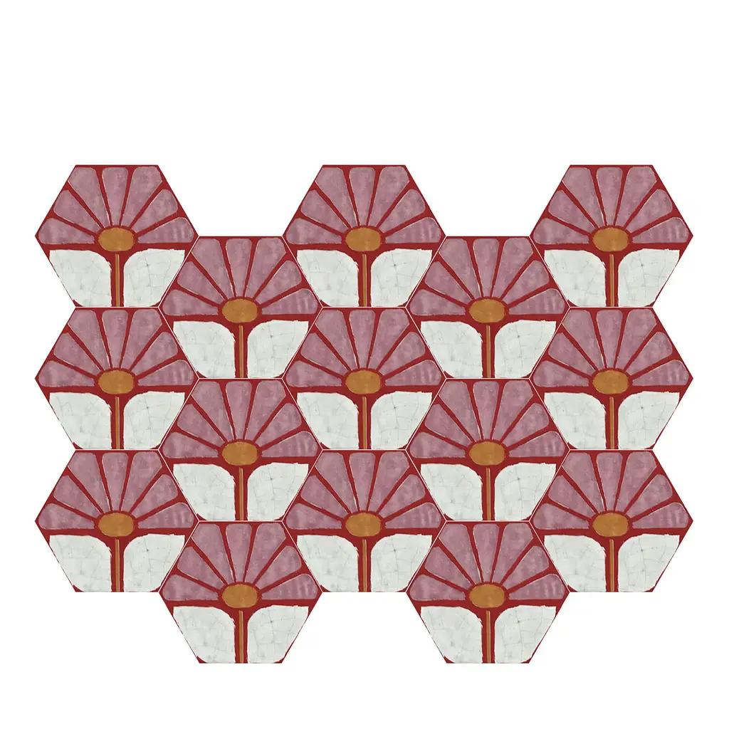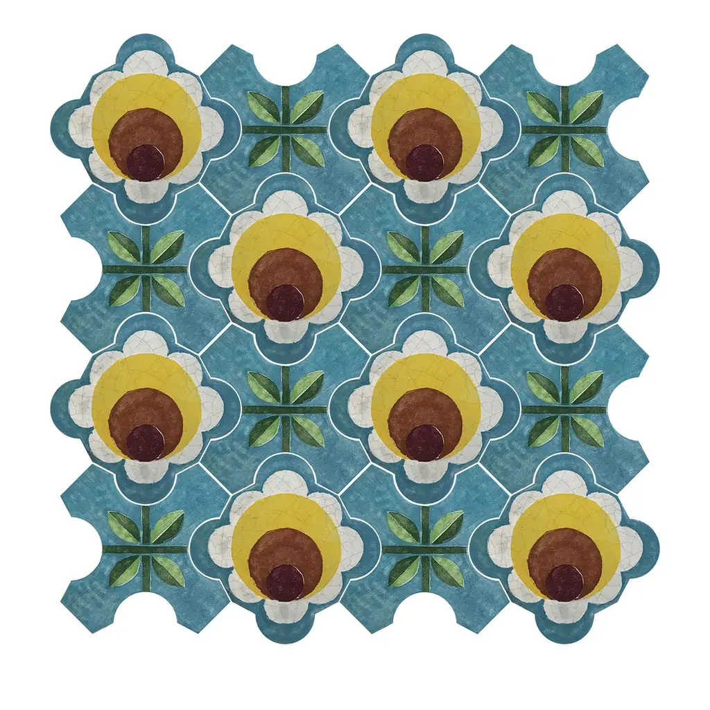 Drawing attention with its bold contrast and distinct hexagonal form, the Peace&Love ceramic tile composition brings vintage charm to kitchens, bathrooms, or entryways. Hand-painted with vibrant white petals and warm earth tones against a matte gray background, these tiles create a dynamic visual impact. Each square meter includes 31 star and 31 cross-shaped tiles, offering versatile design options. Price is per square meter. Please contact the Concierge for further technical specifications.