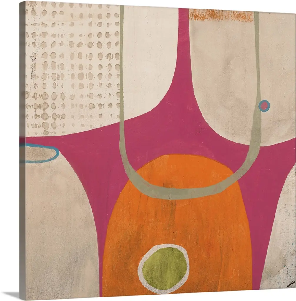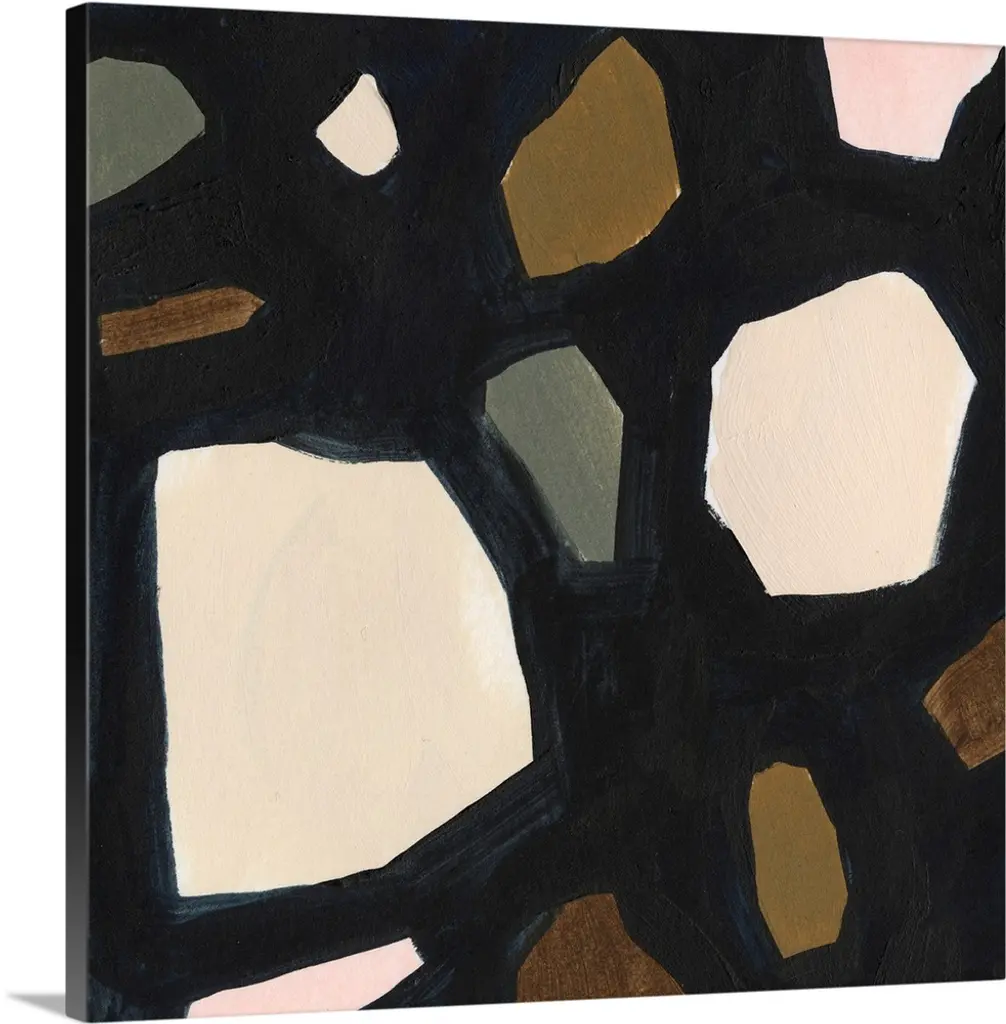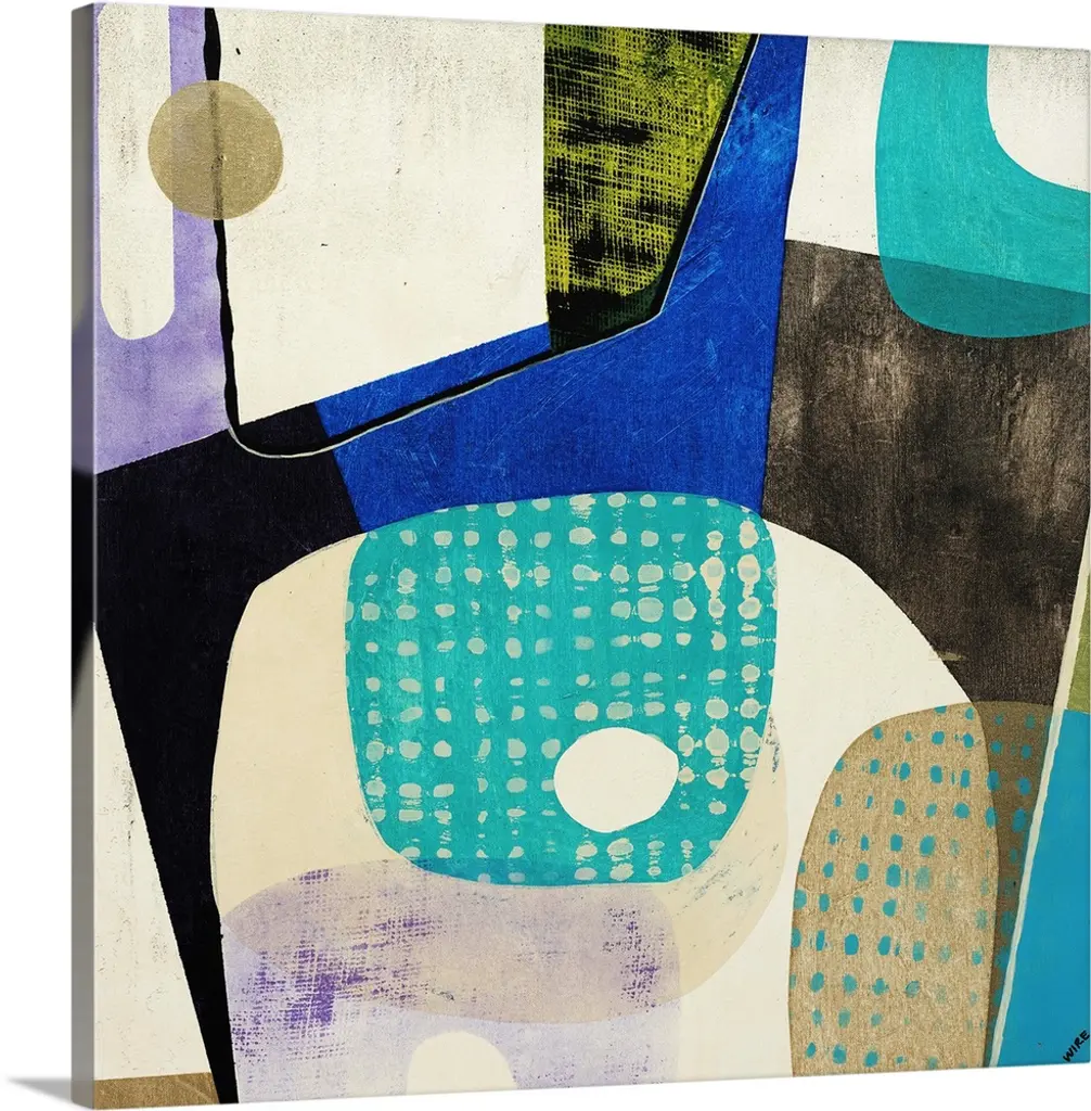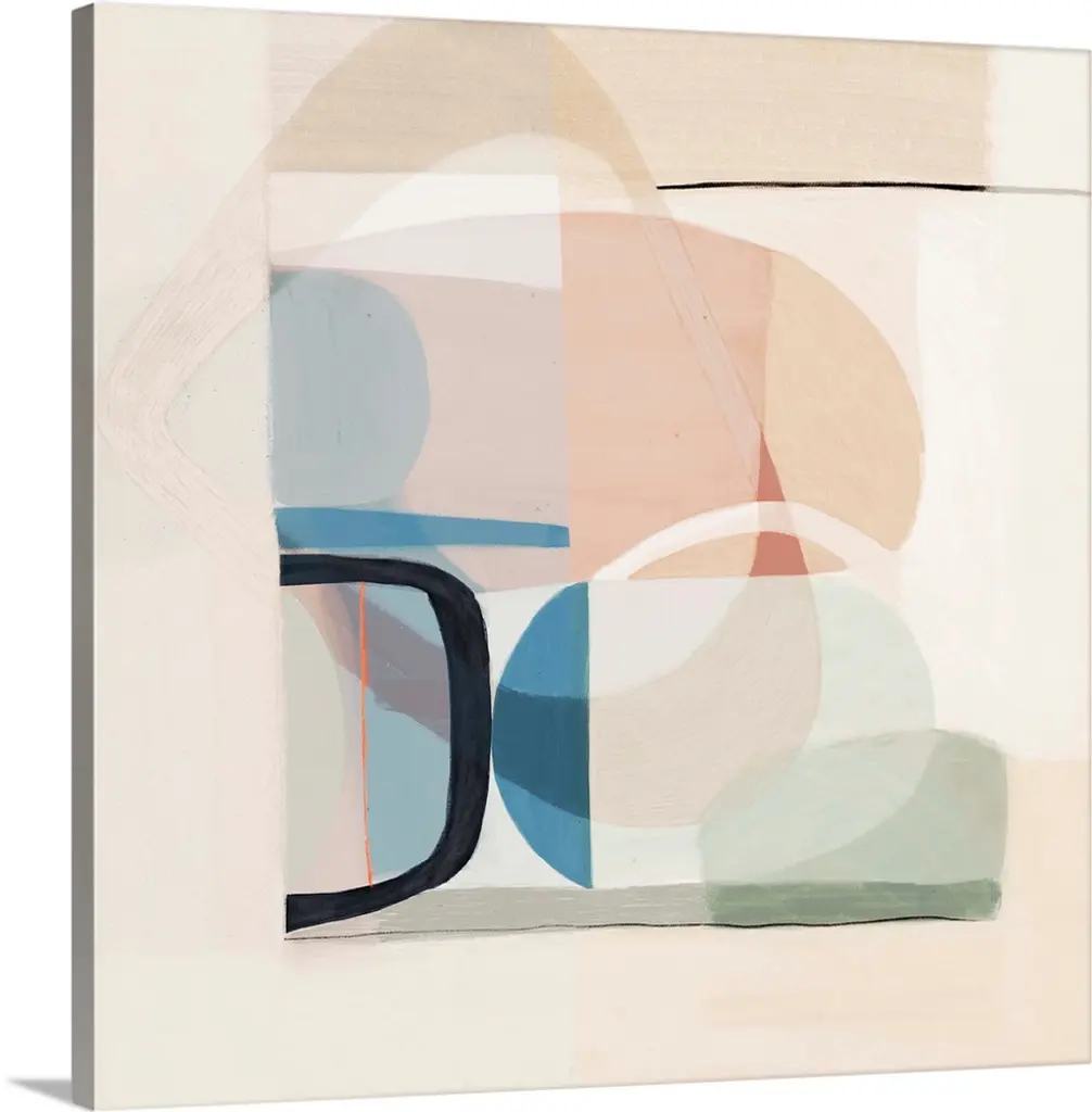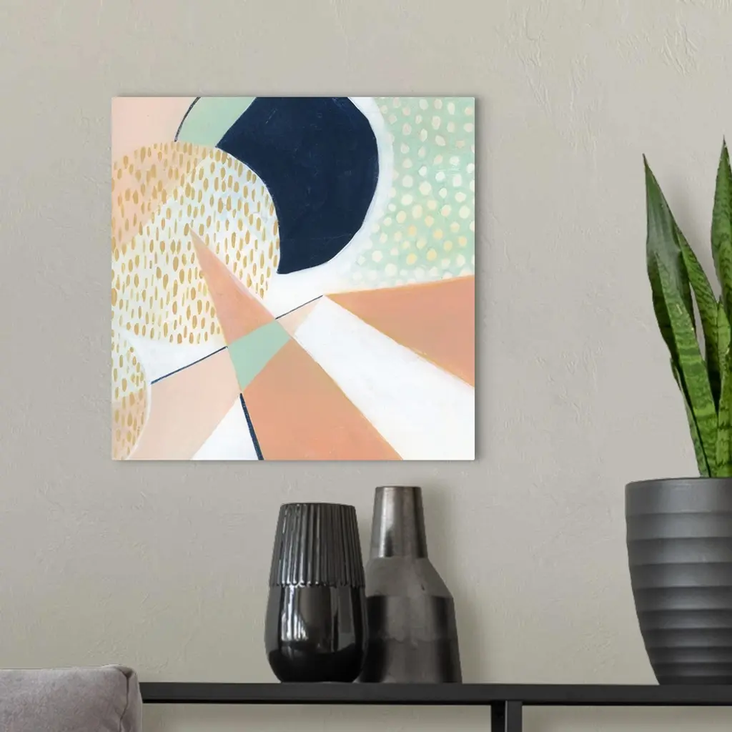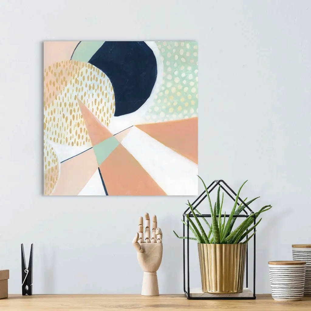 Square modern abstract of circular and triangle shapes in pastel colors with repetitive spots and navy accents.
