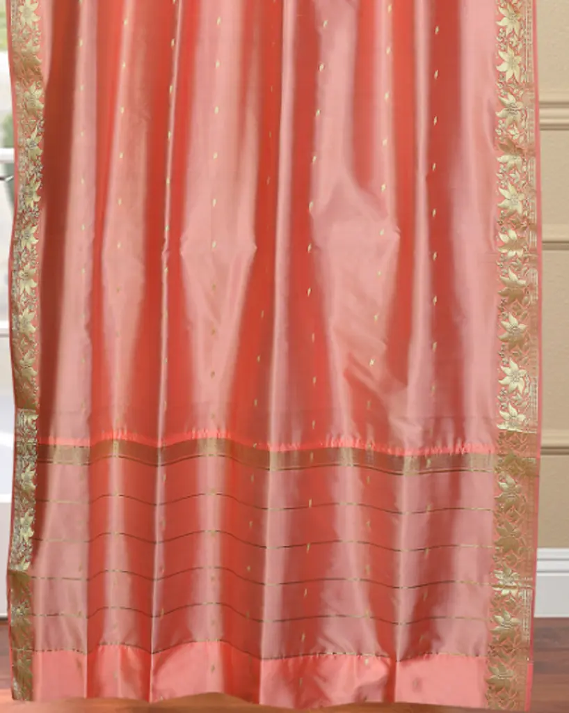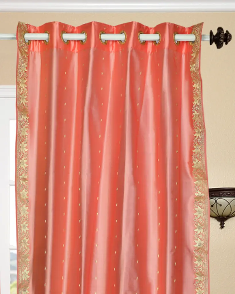 Ring-top drapery is sophisticated and contemporary. Ring-tops have decorative rings attached to the drapes. Rings create a pleated look that is crisp and modern. Sari Curtains / Drapes / Panels are the perfect choice for those looking for light, elegant drapes with a touch of luxury. It has smooth finish with a soft sheen and feels gentle and cool to the touch. Sheer curtains made of saris allow light in through windows but prevent people looking in when they are drawn. Story Behind the Art: The fabric of these curtains are weaved on a hand-loom in a small rural village in India and then hand-dyed. The artisans are a group of young hand-crafters who have moved from small villages to a big town in Central India and make various home decor items out of these exotic sari fabrics. This gives these wonderful artisans a way to have sustainable income via selling to the worldwide market on the internet. Your purchase supports local and home-based work where the artisans can easily tend to their families and pass these time-honoPeach pink skills from one generation to the next.