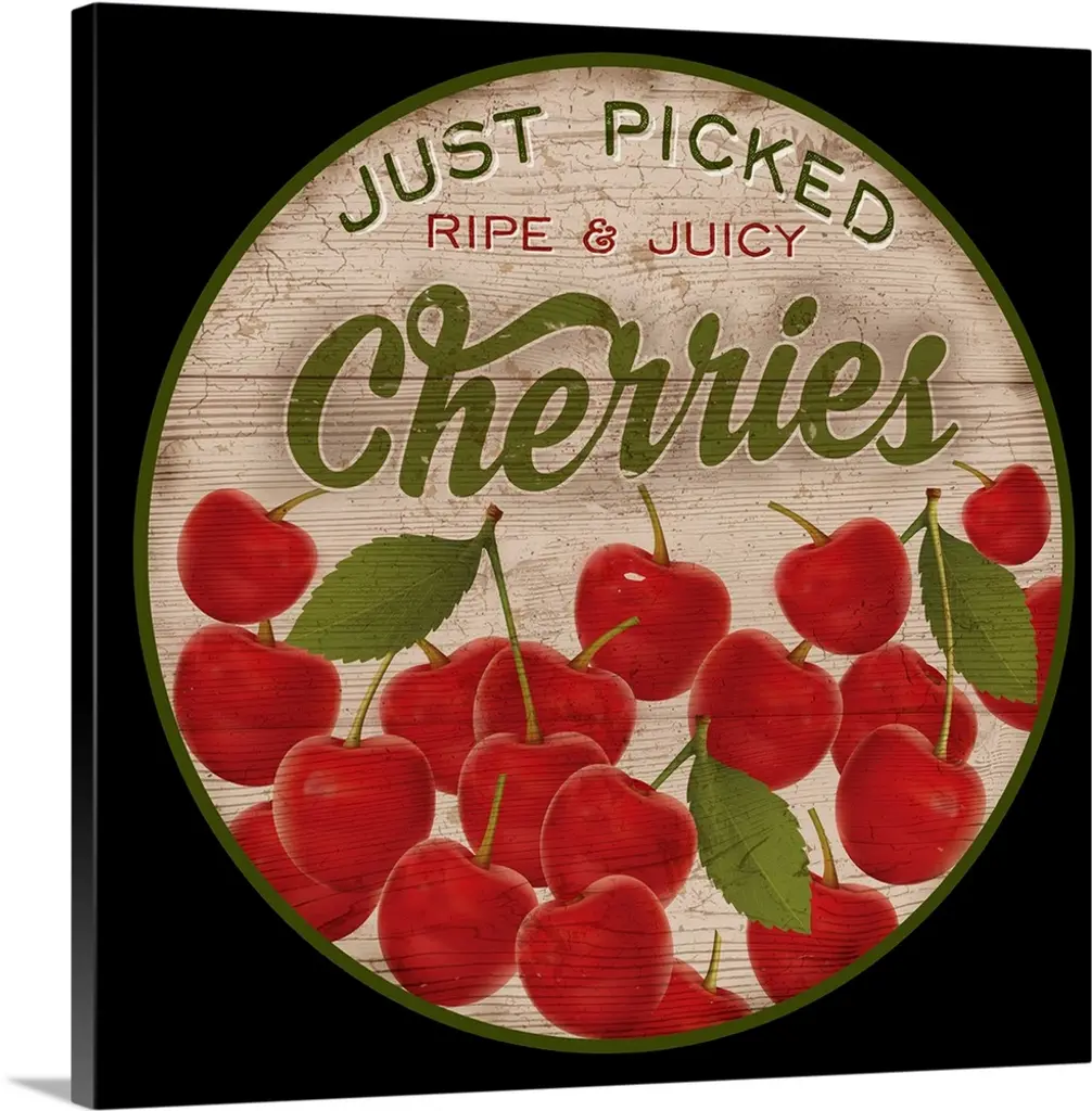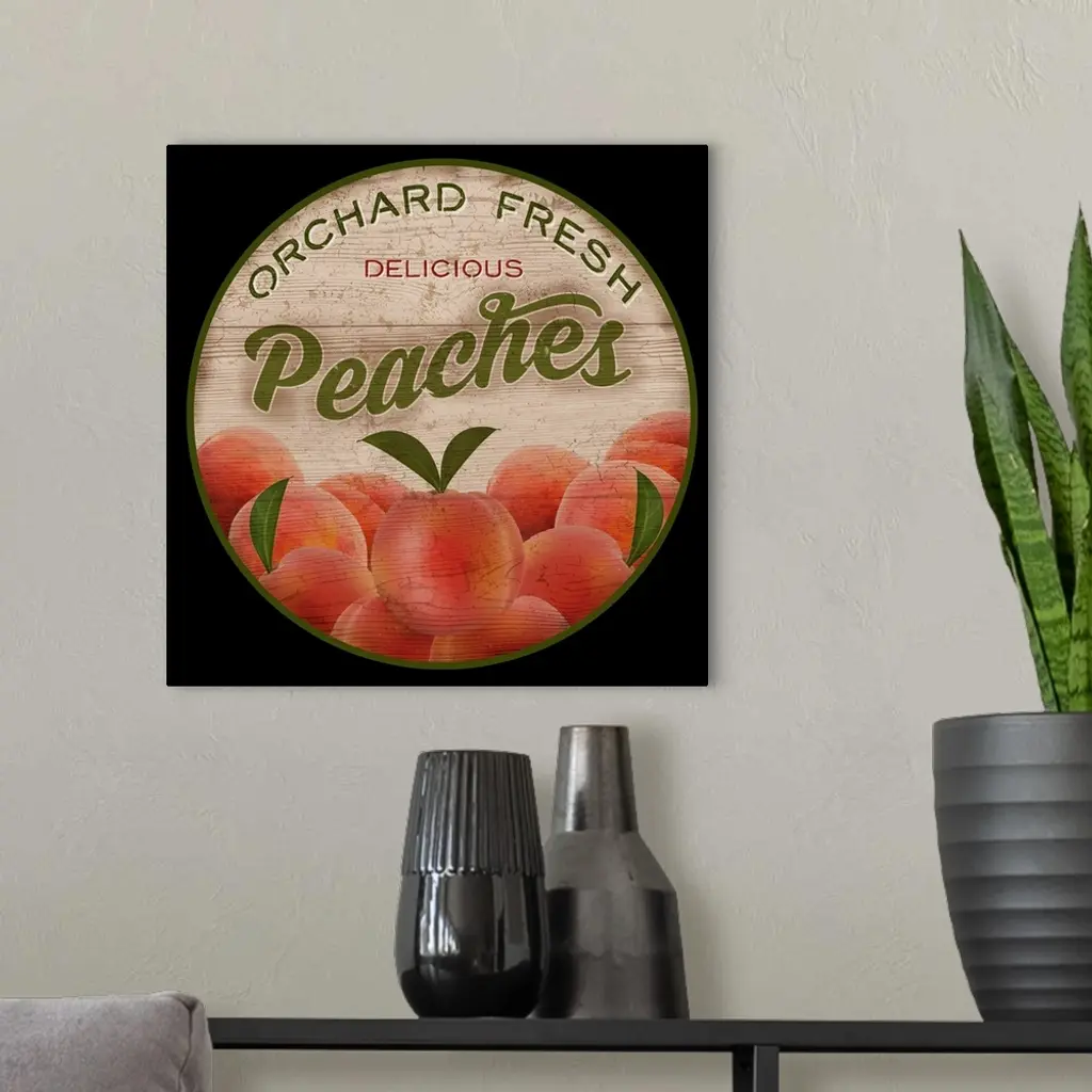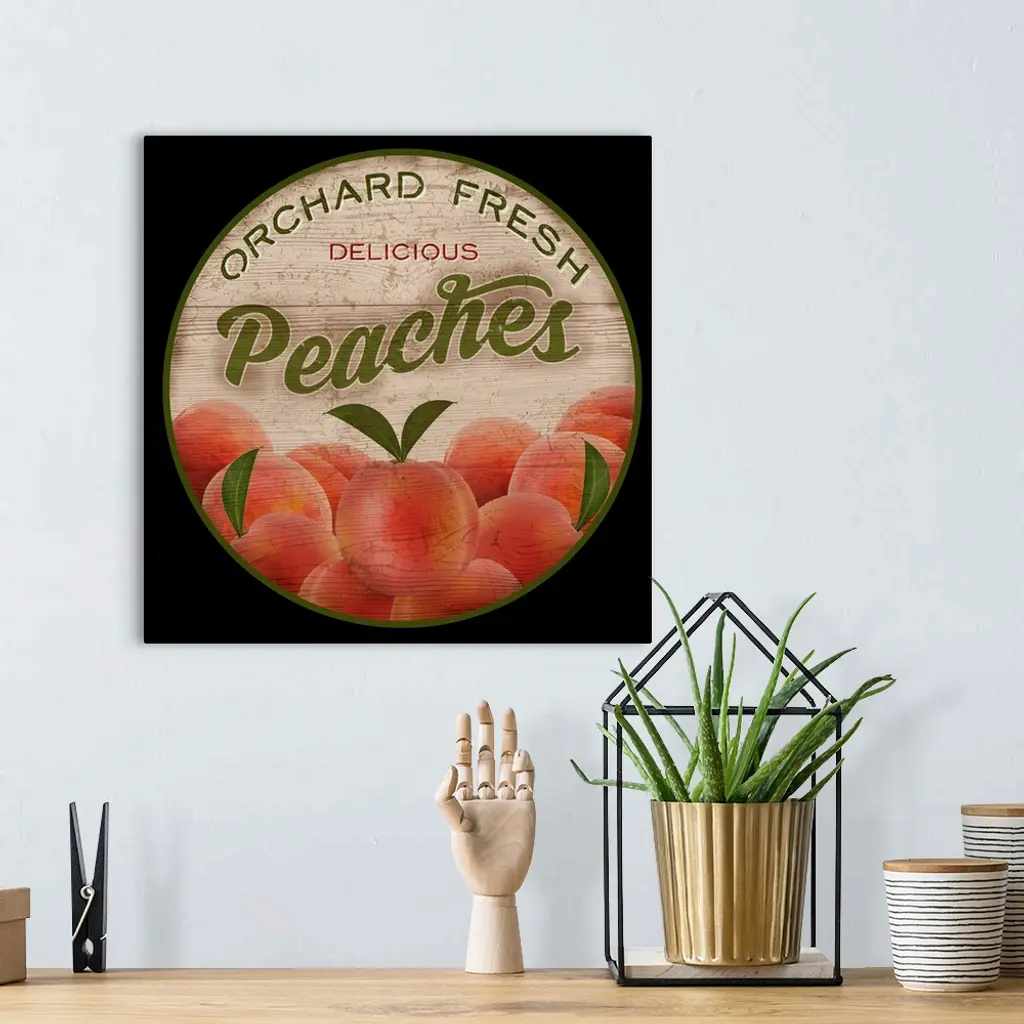 Round wooden sign for fresh peaches.