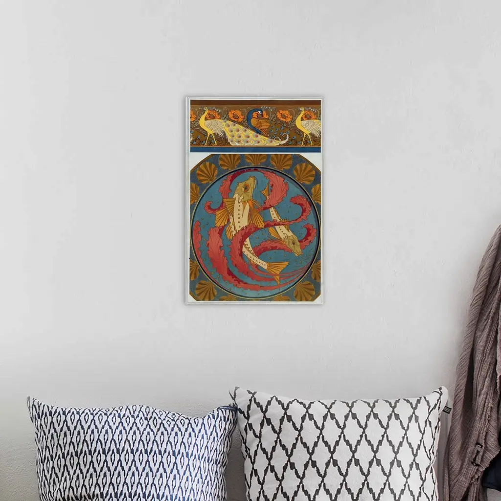 Originally a colour lithograph. Designs For Peacock And Poppy Border, And Enamel Plate With Decoration Of Gurnards And Seaweed With A Scallop Shell Suround, From 'L'Animal Dans La Decoration' By Maurice Pillard Verneuil, Pub 1897.