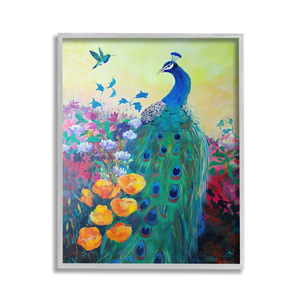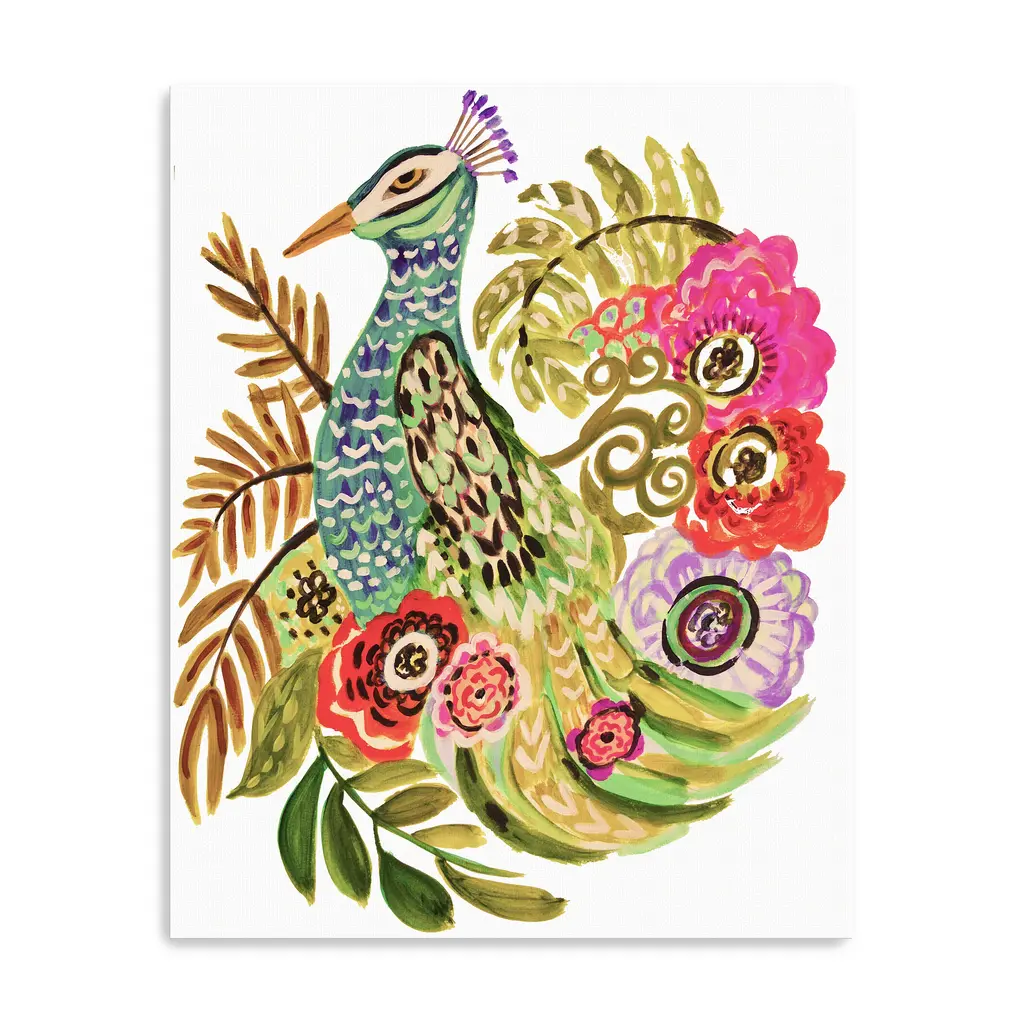 Elevate your decor with "Peacock" canvas art by Karen Fields, showcasing a vibrant peacock amidst a rich tapestry of diverse elements. The dynamic composition and lush green hues create a visually captivating experience, adding depth and elegance to any room. Perfect for both contemporary and classic interiors, this piece makes a bold statement while bringing a touch of nature's beauty indoors. Available in black frame, dark walnut frame, oak frame, or as a wrapped canvas. Our Gallery Wrap Canvas Prints are proudly assembled with high quality materials in California, USA. Each piece is printed on a thick, archival grade canvas using Giclee technology. It is then hand-stretched by our experienced artisans over solid wood bars, which will not warp over time. The final product is a piece personally crafted for you to confidently display on your wall. Care and Assembly: Ensure that the location of your piece has little to no exposure to heat, sunlight, and moisture. Wipe clean, only if needed. Each piece includes a sawtooth hanger to hang on your wall vertically.