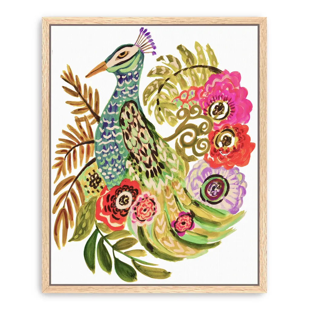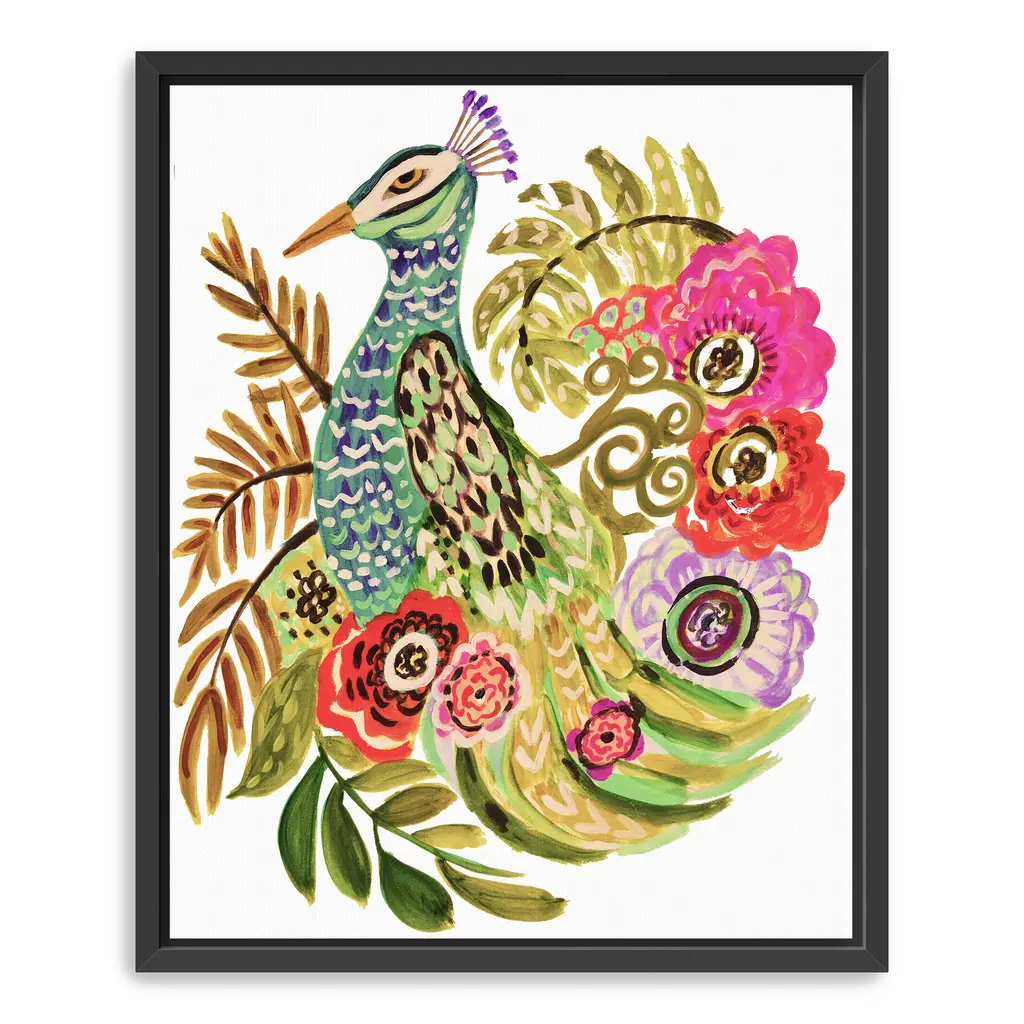Elevate your decor with "Peacock" canvas art by Karen Fields, showcasing a vibrant peacock amidst a rich tapestry of diverse elements. The dynamic composition and lush green hues create a visually captivating experience, adding depth and elegance to any room. Perfect for both contemporary and classic interiors, this piece makes a bold statement while bringing a touch of nature's beauty indoors. Available in black frame, dark walnut frame, oak frame, or as a wrapped canvas. Our Gallery Wrap Canvas Prints are proudly assembled with high quality materials in California, USA. Each piece is printed on a thick, archival grade canvas using Giclee technology. It is then hand-stretched by our experienced artisans over solid wood bars, which will not warp over time. The final product is a piece personally crafted for you to confidently display on your wall. Care and Assembly: Ensure that the location of your piece has little to no exposure to heat, sunlight, and moisture. Wipe clean, only if needed. Each piece includes a sawtooth hanger to hang on your wall vertically.
