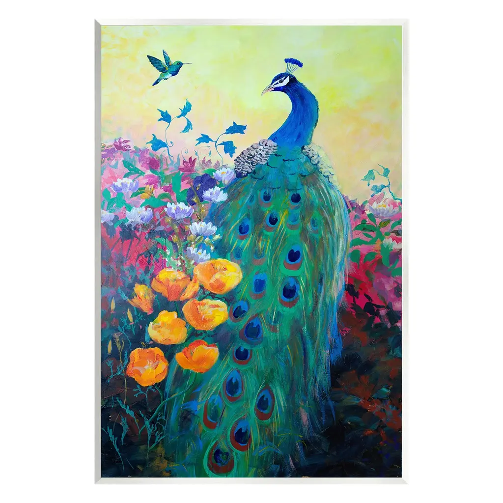 Elevate your decor with "Peacock" canvas art by Karen Fields, showcasing a vibrant peacock amidst a rich tapestry of diverse elements. The dynamic composition and lush green hues create a visually captivating experience, adding depth and elegance to any room. Perfect for both contemporary and classic interiors, this piece makes a bold statement while bringing a touch of nature's beauty indoors. Available in black frame, dark walnut frame, oak frame, or as a wrapped canvas. Our Gallery Wrap Canvas Prints are proudly assembled with high quality materials in California, USA. Each piece is printed on a thick, archival grade canvas using Giclee technology. It is then hand-stretched by our experienced artisans over solid wood bars, which will not warp over time. The final product is a piece personally crafted for you to confidently display on your wall. Care and Assembly: Ensure that the location of your piece has little to no exposure to heat, sunlight, and moisture. Wipe clean, only if needed. Each piece includes a sawtooth hanger to hang on your wall vertically.