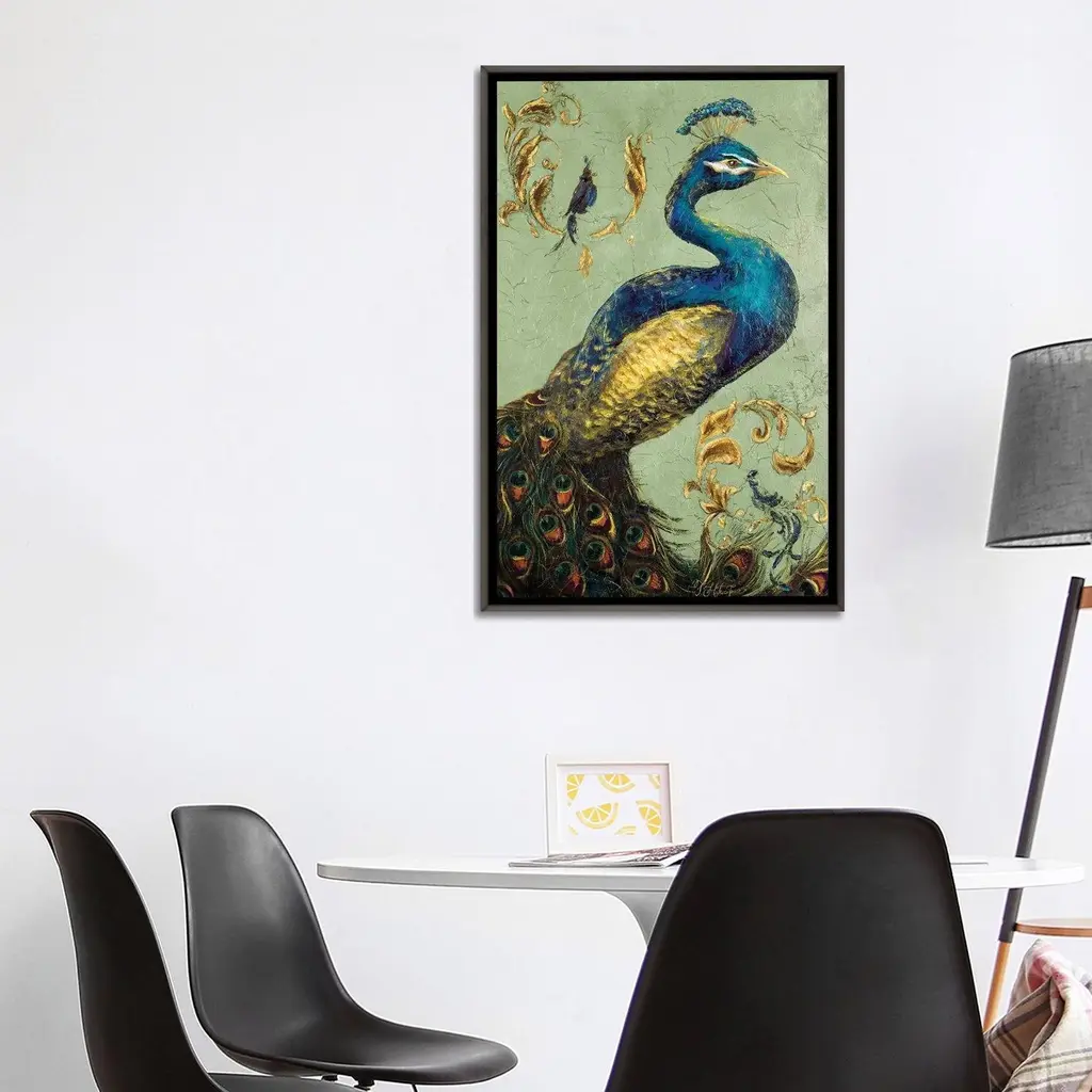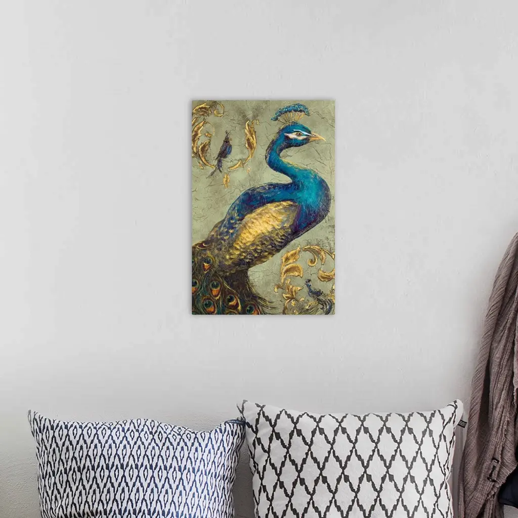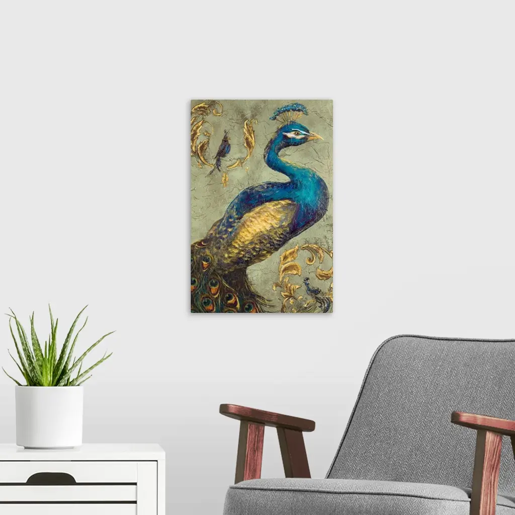 This large vertical canvas shows a beautiful peacock with golden feathers.