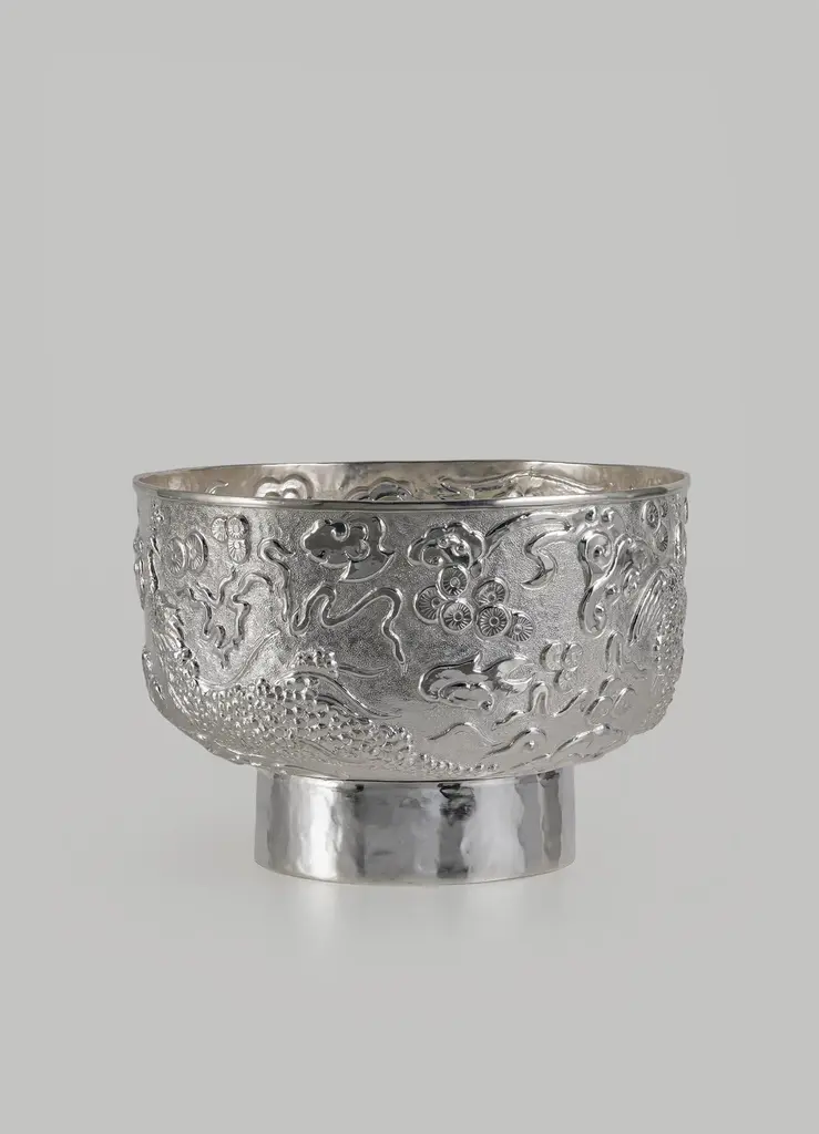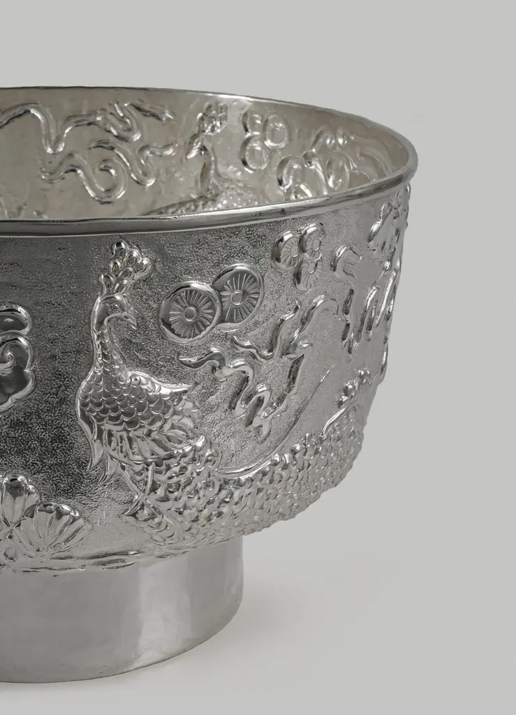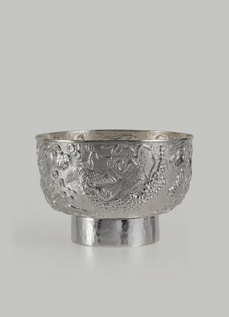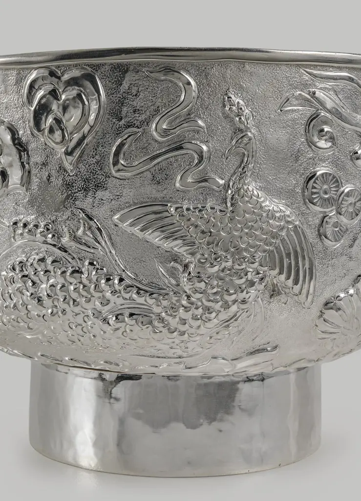 Peacock Paradise Silver Plated Serving Bowl in Brass, Viya by Vikram Goyal"Repoussé involves hammering low-relief designs into malleable metal sheets from the reverse that originated around the 3rd or 4th century B.C., in the Middle East. In India, the technique was traditionally used to make temple doors and ceilings with devotional themes. The studio explores this process through organic abstract patterns and also gives contemporary life to classical themes from the visual decorative arts. In order to achieve this, months are spent experimenting and sampling the detailed, time-consuming technique. The final outcome is a result of the synergy between designer and artisan: a detailed two-dimensional artwork is realised in sheet metal through the intuitive and skilled process of applying the right amount of pressure to elevate the forms."Serving Bowl in brass and silver. Handmade in India.Product DetailsMaterial: BrassSize: 11.25"DIA x 7.75"H 28.6 DIA x 19.7 H cmWeight: 2 kg 4.4 lbsNumber of Pieces: 1 Serving BowlSKU: VBO2703This product has been handcrafted by local artisans. As such, slight variations are a testament to the unique character of a piece made by hand.