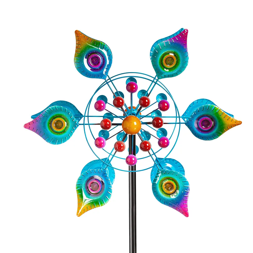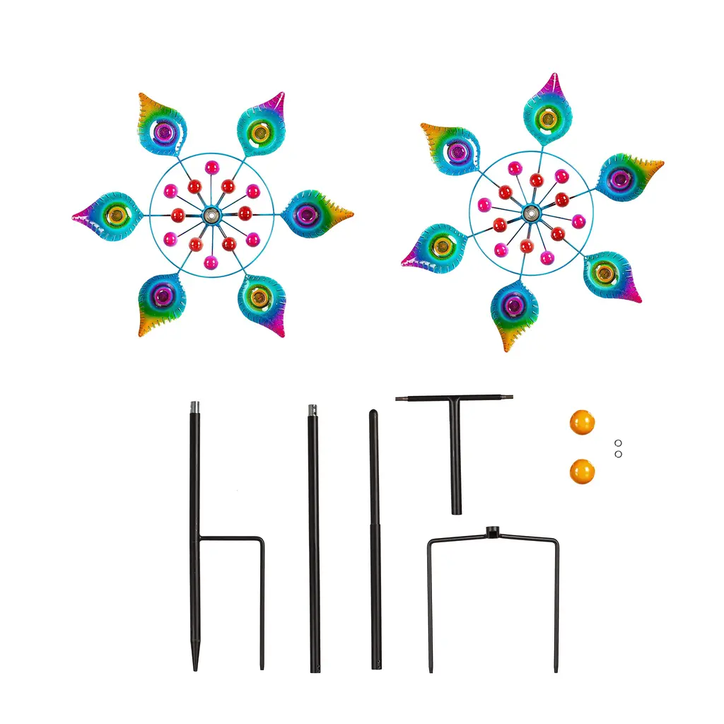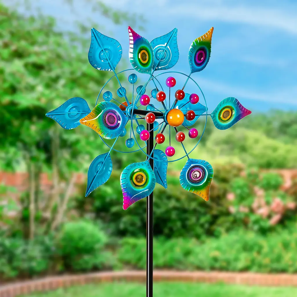 A grand display, our Peacock Tail Wind Spinner catches the breeze from any direction to transform your yard into a whirlwind of color, motion and style. The intricate design adds drama and dimension even when there's no breeze. The gorgeous bright colors contrast beautifully for a fantastic display you'll love. It adds color to your yard in all four seasons. Sit back and watch while the breeze sends the bidirectional rotors into a whirlwind of spin for an amazing display of art in motion. Truly a mesmerizing spectacle to enjoy! Mount this painted metal spinner anywhere in your landscape: garden, front or back yard, flower bed, along a pathway. The sturdy post has a durable three-prong stake for easy, secure installation.
