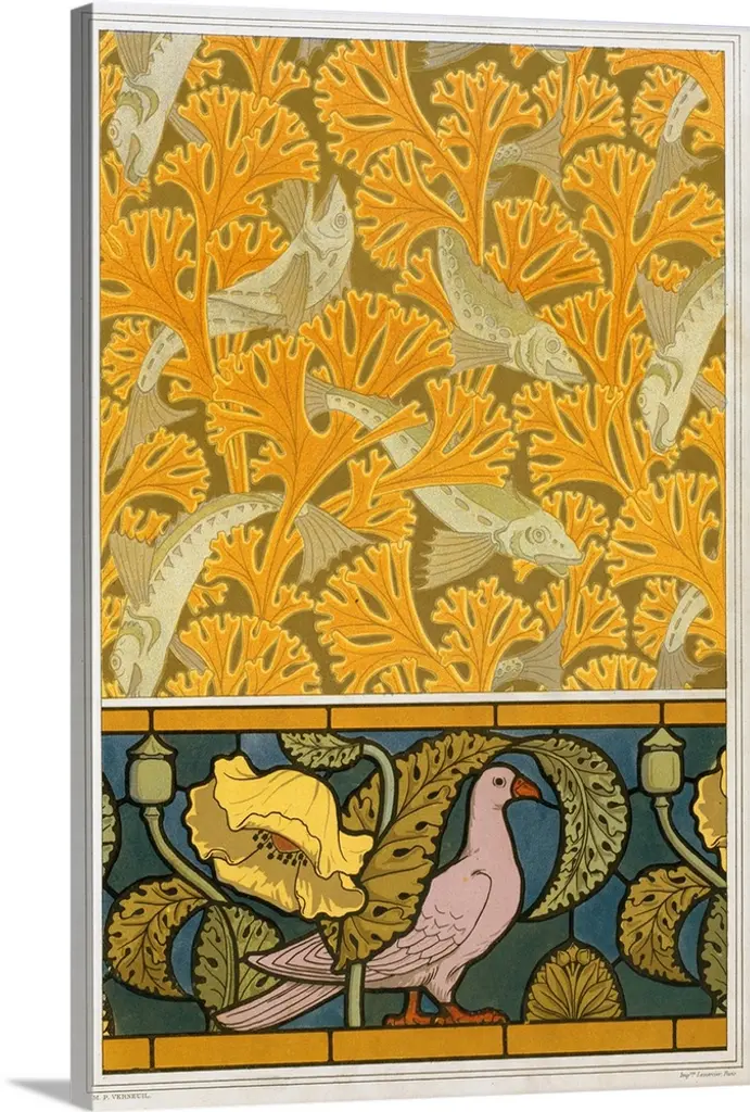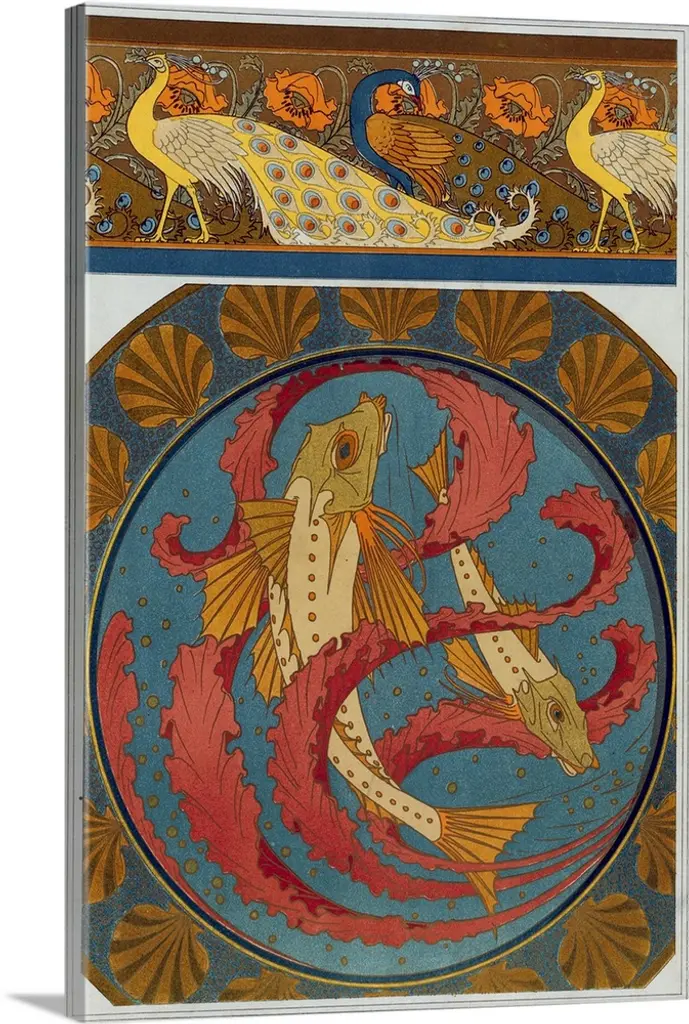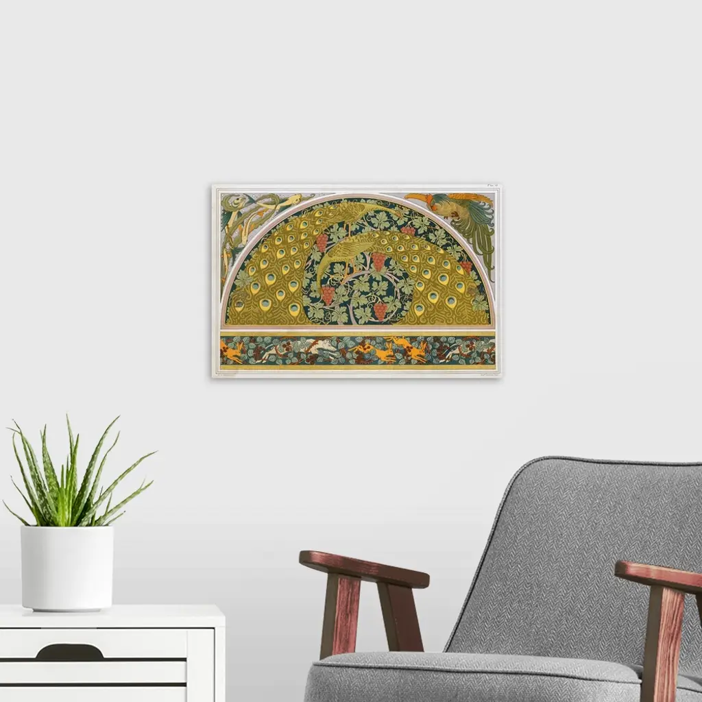 Originally a colour lithograph. Designs For Borders And Corners: "Hares And Dogs In Brambles", Peacocks Amongst Vines With Fish And Seaweed And A Cockerel In The Corners", From 'L'Animal Dans La Decoration' By Maurice Pillard Verneuil, Pub 1897.