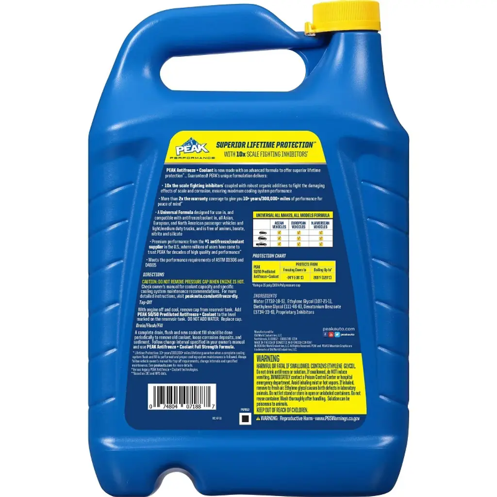 PEAK® All Vehicles provides YEAR-ROUND ENGINE PROTECTION 10+ Years / 300,000 Miles Guaranteed Protection*.PEAK® All Vehicles Antifreeze + Coolant is formulated to protect all cooling system metals, including aluminum. It immediately protects against damaging rust and corrosion and is free of phosphates, borates, nitrites, silicates and amines.*10+ years/300,000 miles guarantee when a complete cooling system flush and fill is performed and proper cooling system maintenance is followed. Always follow vehicle owner’s manual for top-off requirements, change intervals and specified maintenance. See PEAKGuarantee.com for more details.
