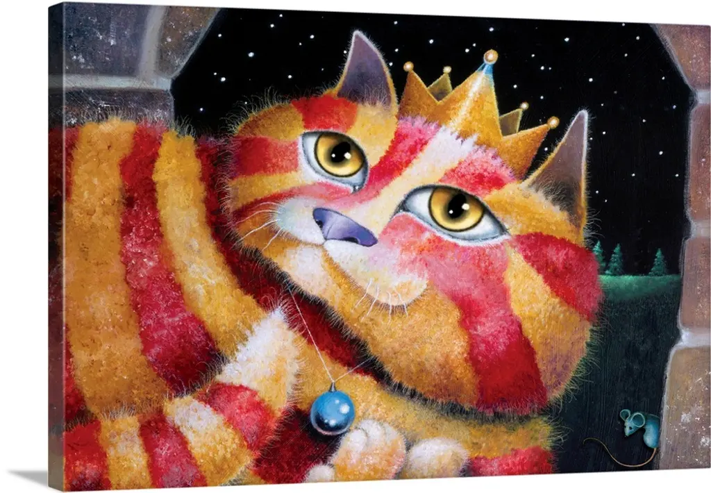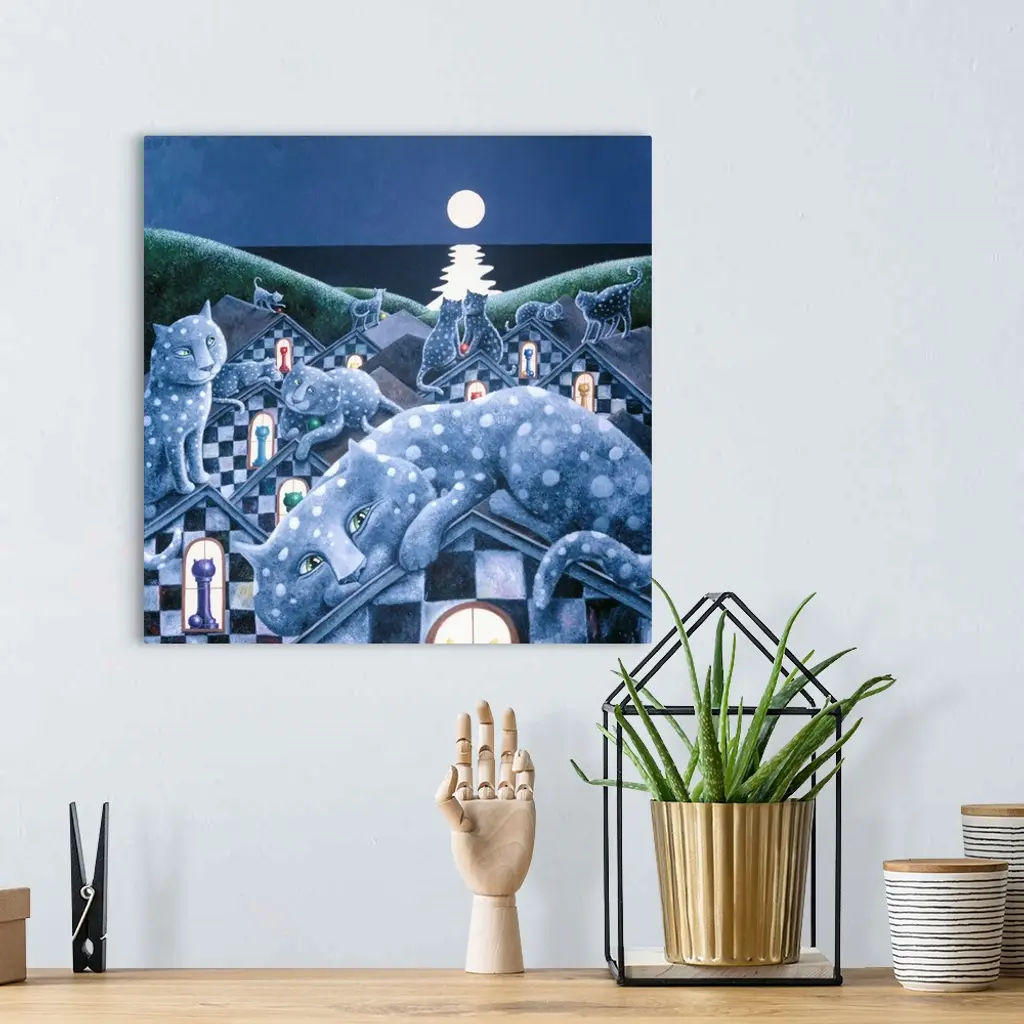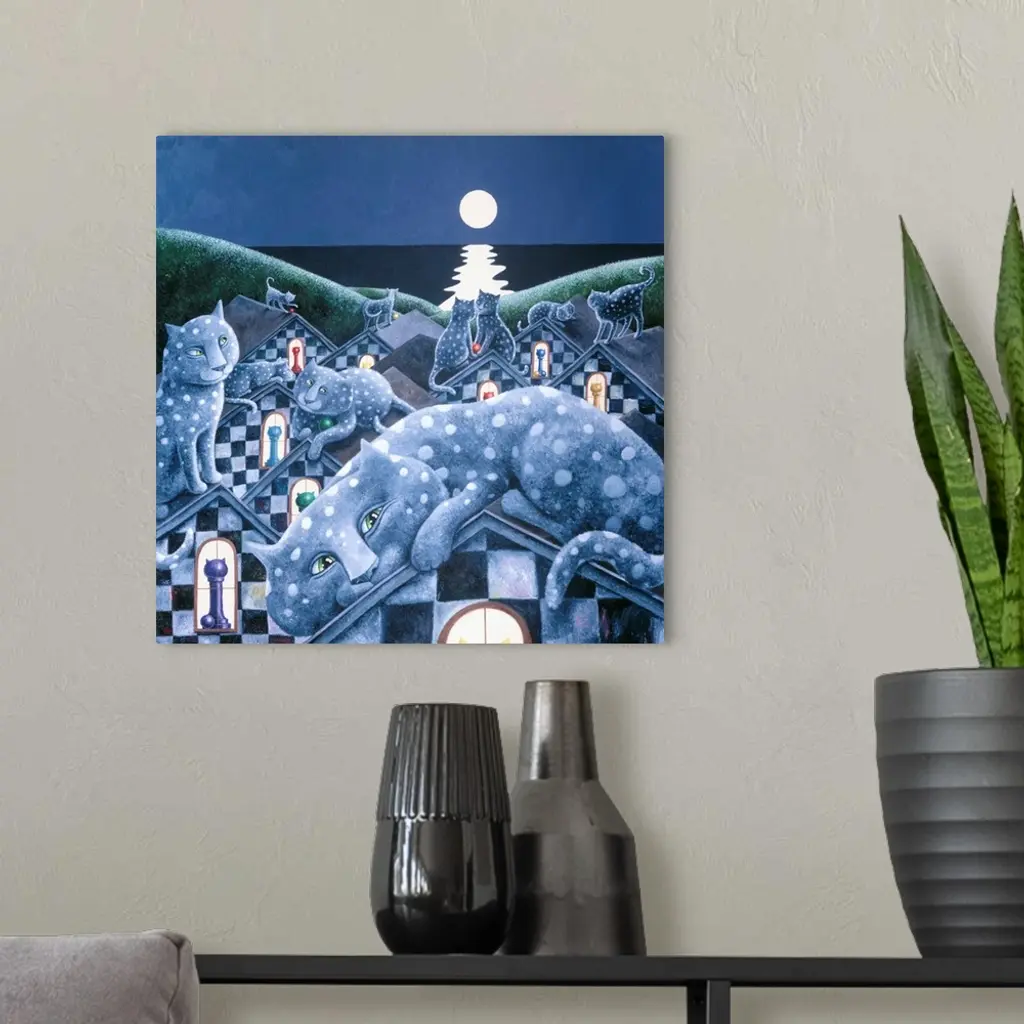Square illustration of polka dotted cats on checkered roof tops with a full moon in the distance.