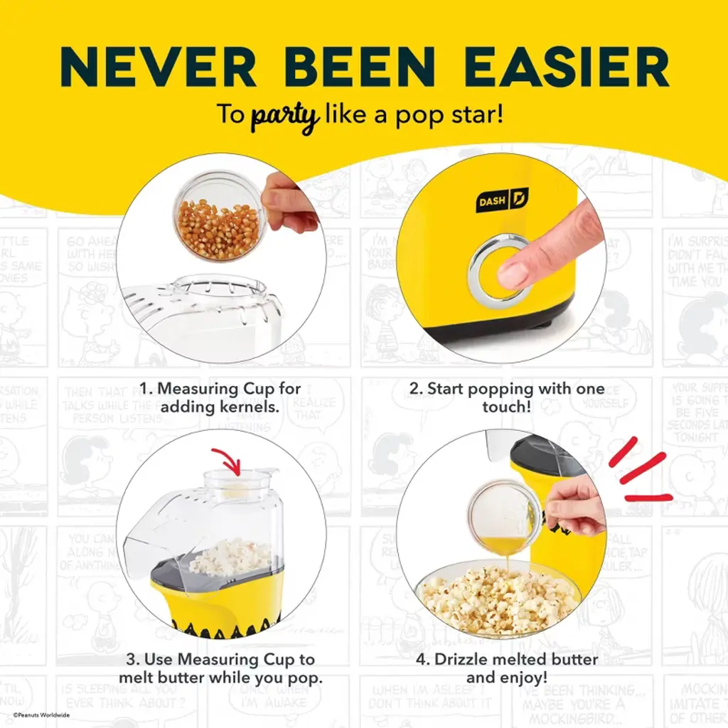Pop it like it’s HOT with the Peanuts® Fresh Pop Popcorn Maker! The Fresh Pop cooks using only hot air for healthier movie night snack without oil or microwave bag additives & preservatives. Pop up to 16 cups of fresh popcorn at one time, the perfect size for snacking solo or for a Peanuts® watch party. The included Measuring Cup ensures perfect portions and doubles as Butter Melting Tray—place on top during cooking to melt butter for easy drizzling! And it’s so easy to use—get poppin’ with just one touch! Cute and compact, it’s the ideal movie night sidekick for smaller spaces. Plus, our Recipe Guide is packed full of fun ideas to keep the Peanuts® party going!