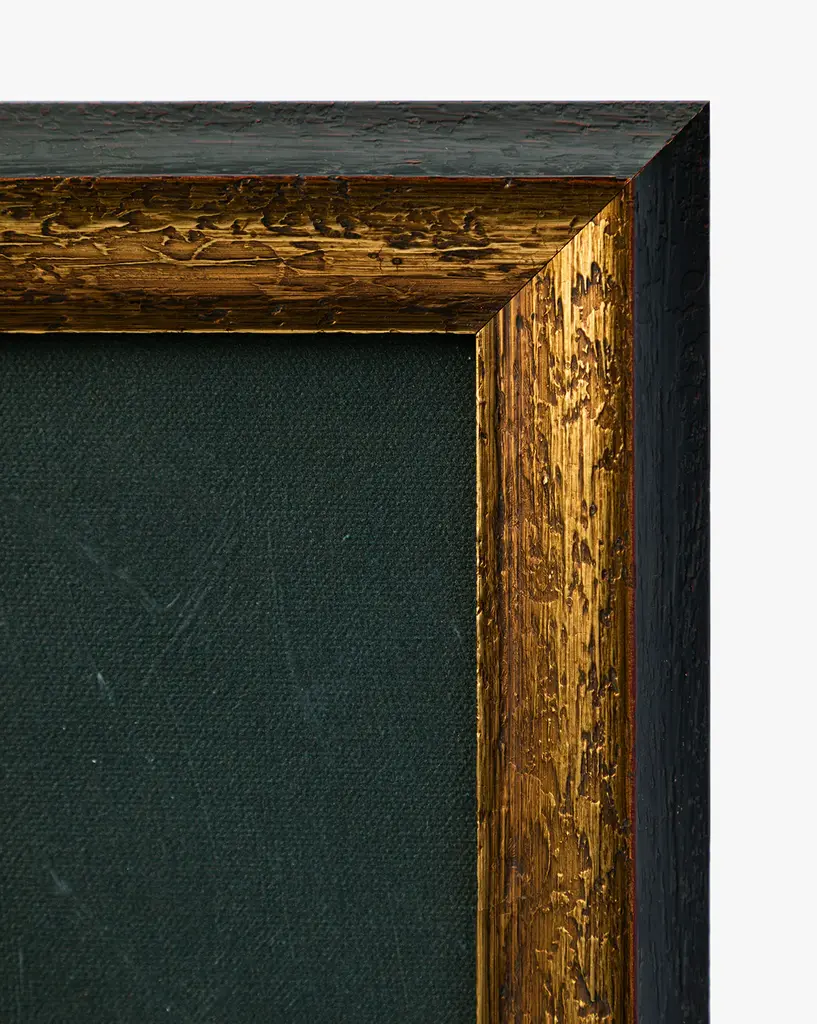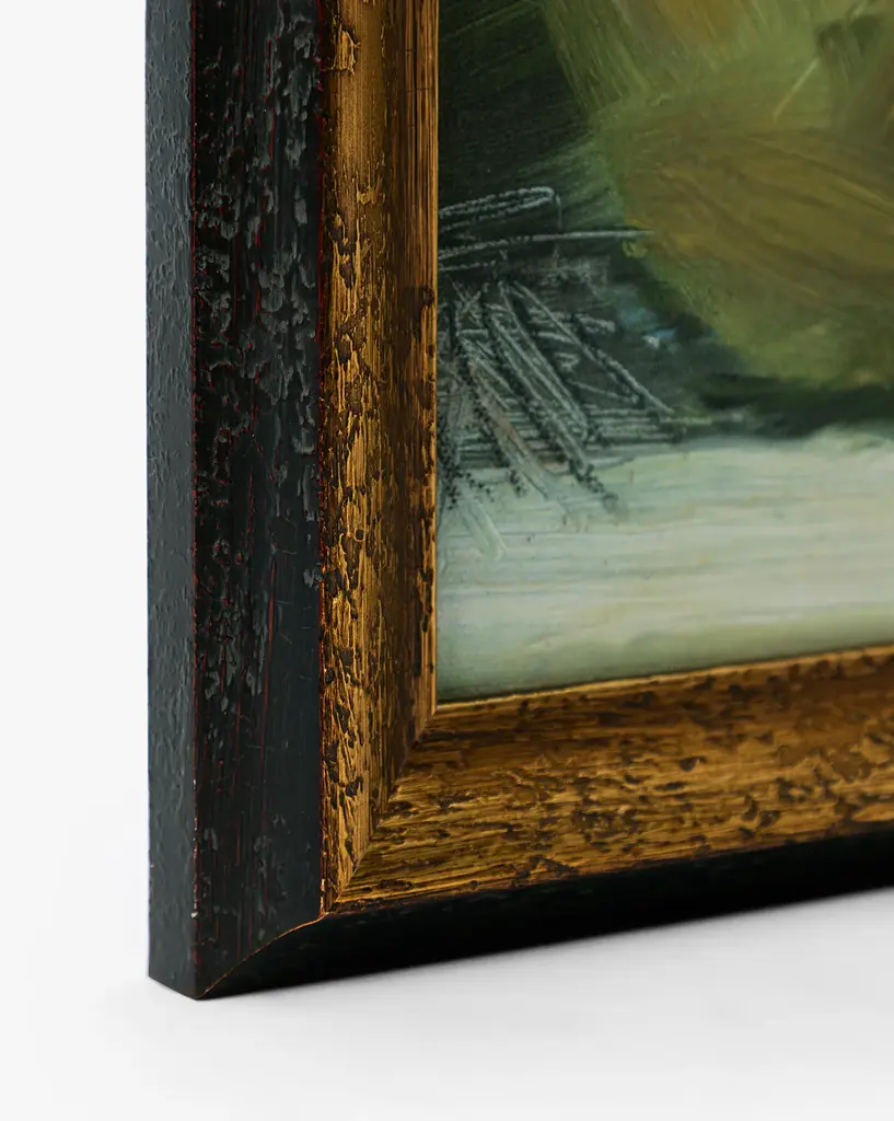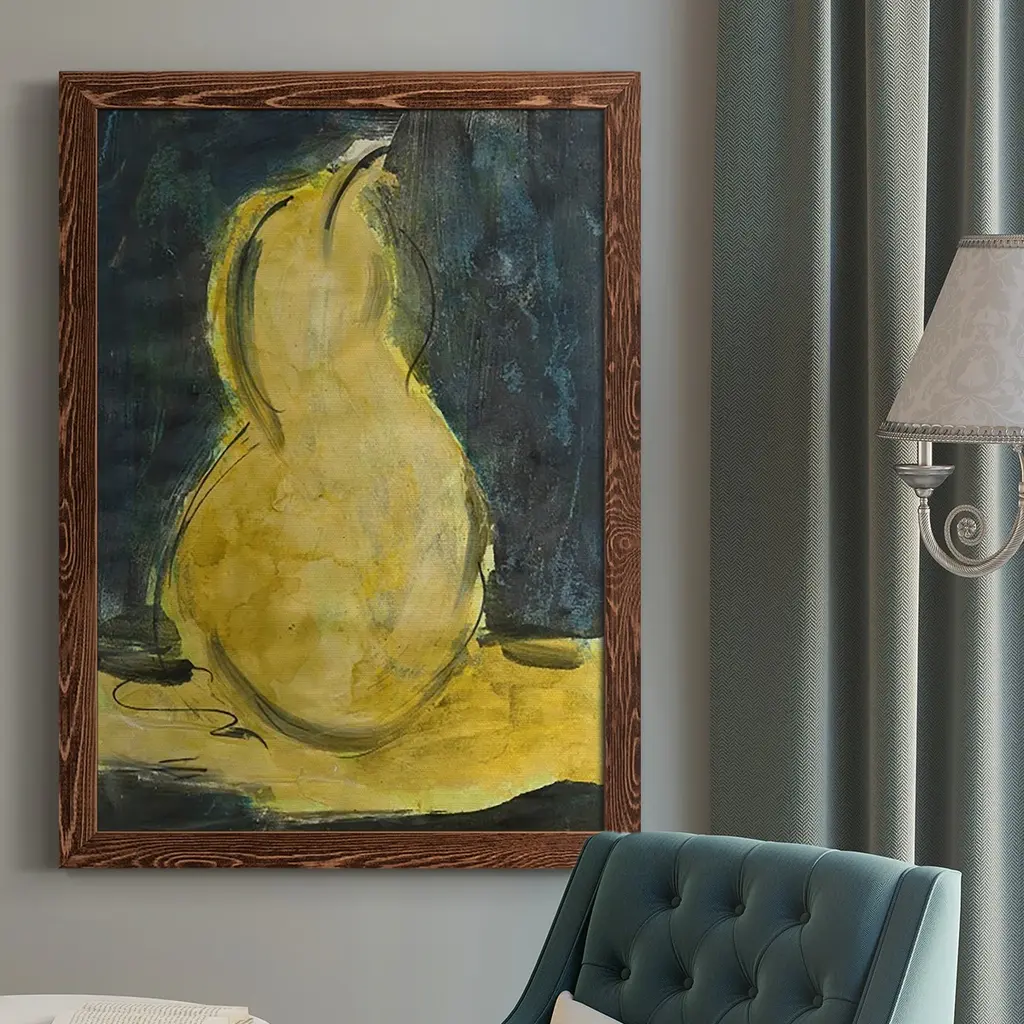 Pear Pictorial brings a simple composition to life with exquisite tone and brush texture. The still life is a giclee print on canvas with textural artist enhancement within a black and gold wood frame.