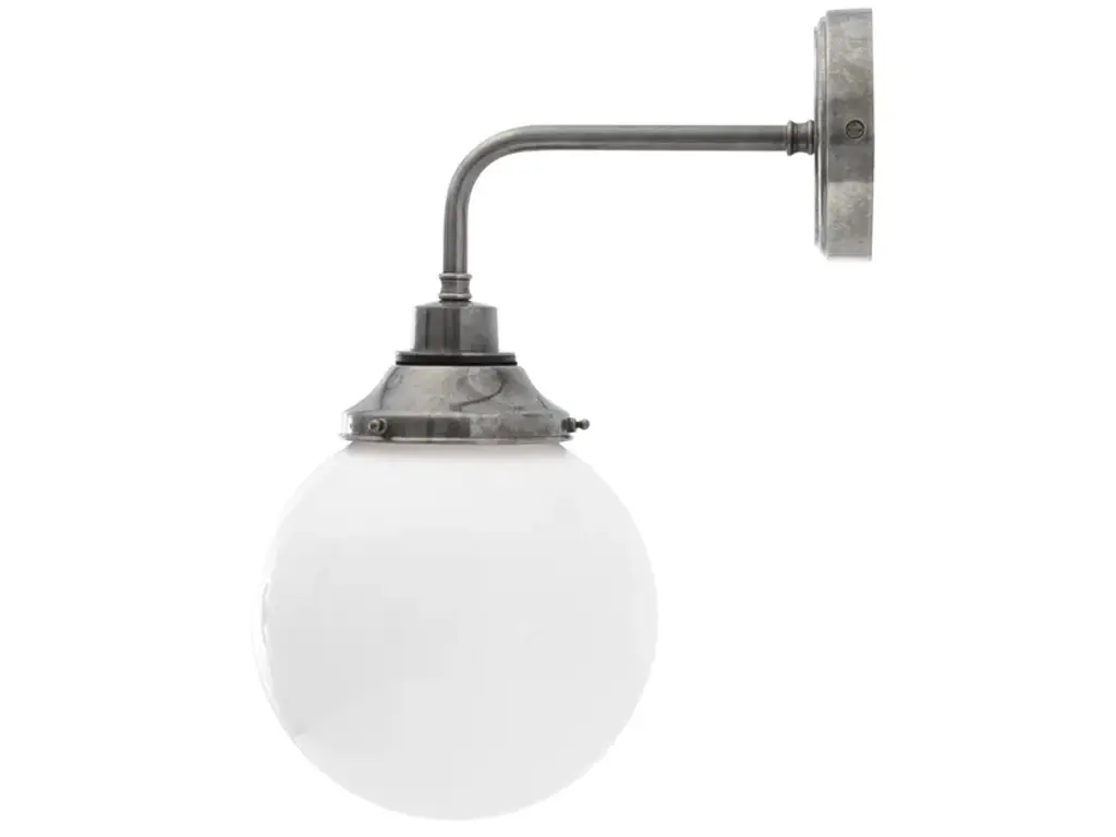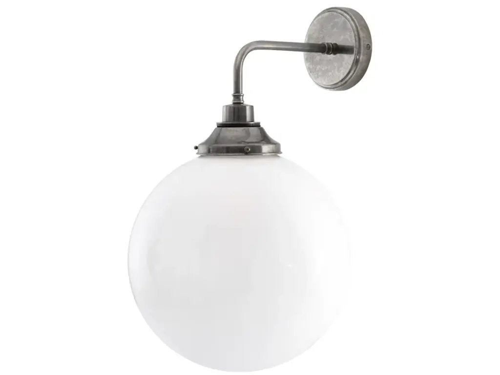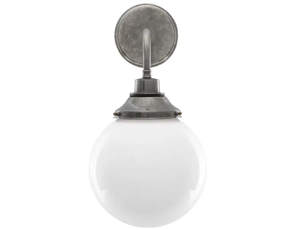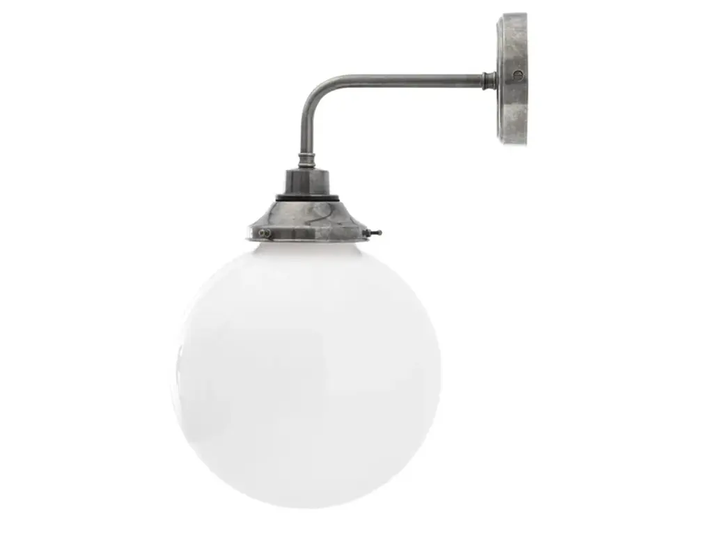 The PELAGIA is a traditional yet contemporary bathroom wall light that features a 20cm opal glass globe shade. The glass ball shade points towards the floor and is anchored in placed by way of a sealed brass gallery and right angled brass sleeve that is securely attached to the supplied wall bracket. The PELAGIA globe wall light is rated IP44. This means that it can be safely installed in most bathroom or outdoor locations, including bathroom zones 1 and 2.The PELAGIA wall light is available in antique brass, antique silver, polished brass, satin brass, and powder-coated matte black or white. It's worth noting that antique silver, polished brass and satin brass finishes can be used indoors only. An E27 LED light bulb is sold separately.Max Wattage: 40WLampholder: E27 | Plastic | ES | Edison Screw | 2 Core CableVoltage: 220V/240VIP Rating: IP44Protection Class: Class IIGlass Code: GL044E