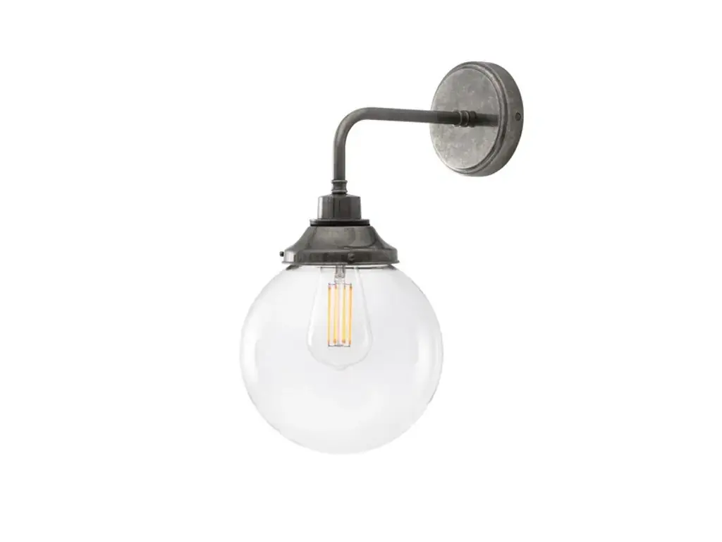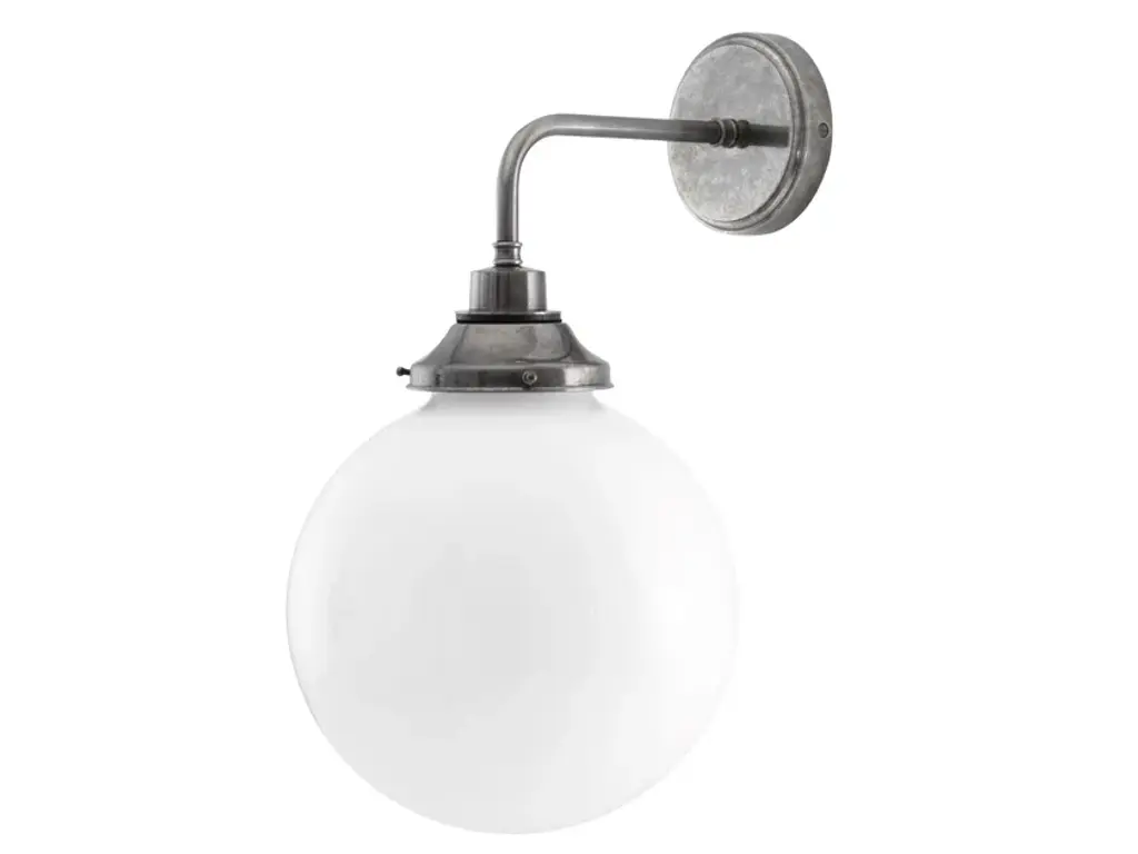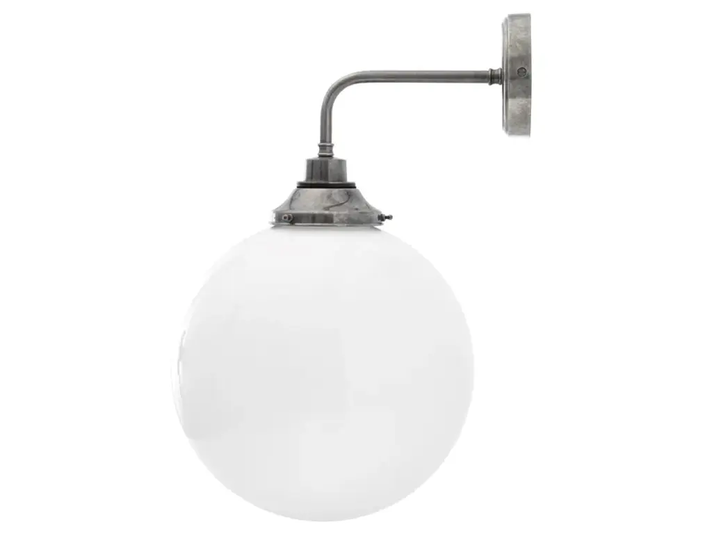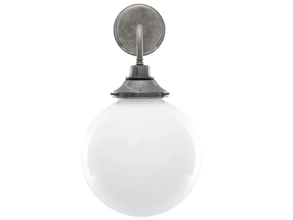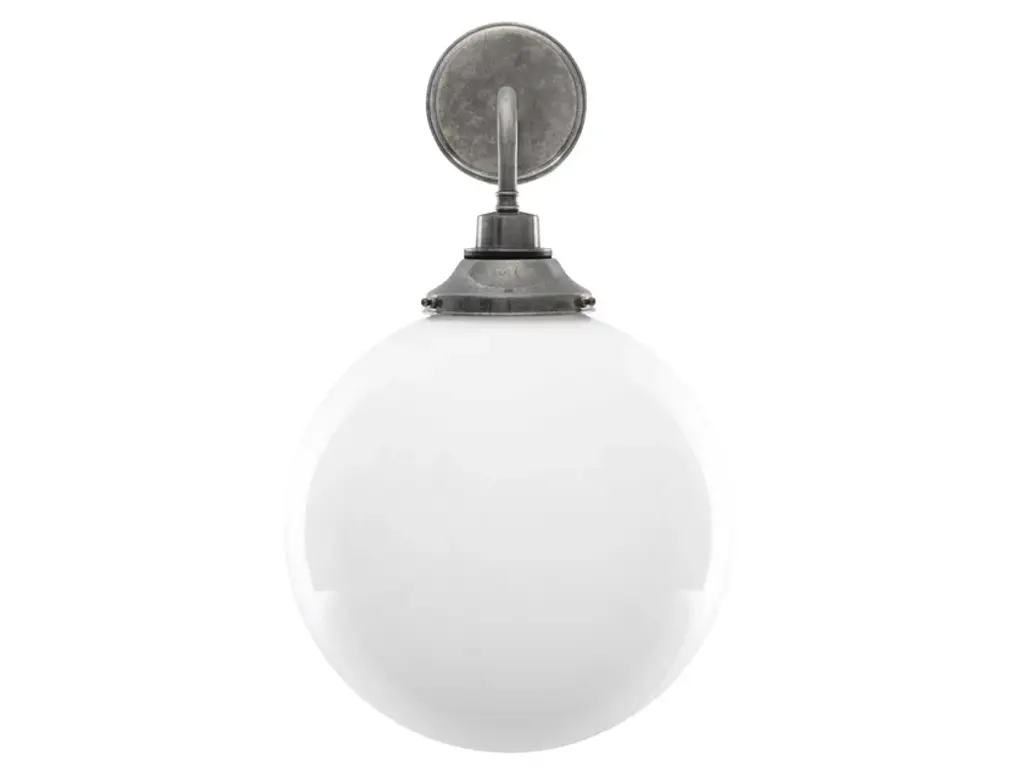 The PELAGIA is a traditional yet contemporary bathroom wall light that features a 20cm opal glass globe shade. The glass ball shade points towards the floor and is anchored in placed by way of a sealed brass gallery and right angled brass sleeve that is securely attached to the supplied wall bracket. The PELAGIA globe wall light is rated IP44. This means that it can be safely installed in most bathroom or outdoor locations, including bathroom zones 1 and 2.The PELAGIA wall light is available in antique brass, antique silver, polished brass, satin brass, and powder-coated matte black or white. It's worth noting that antique silver, polished brass and satin brass finishes can be used indoors only. An E27 LED light bulb is sold separately.Max Wattage: 40WLampholder: E27 | Plastic | ES | Edison Screw | 2 Core CableVoltage: 220V/240VIP Rating: IP44Protection Class: Class IIGlass Code: GL044E