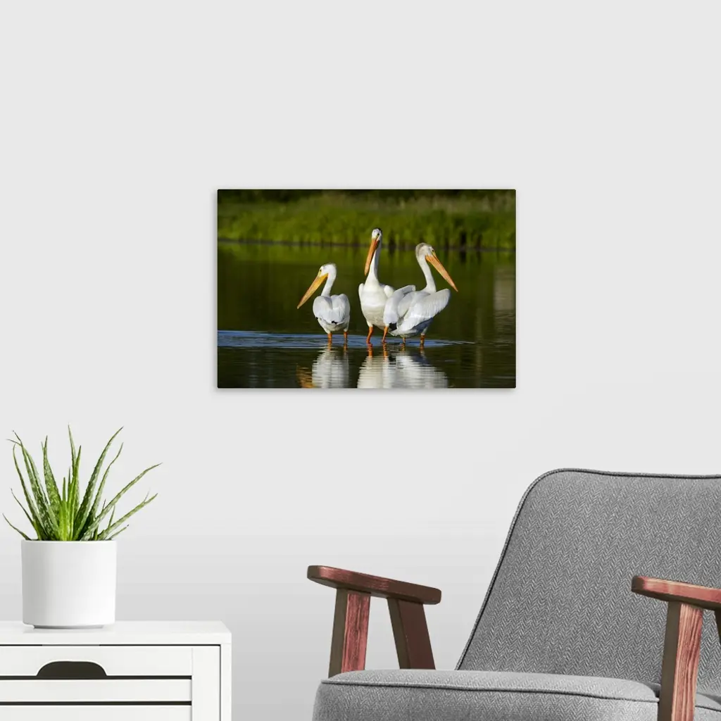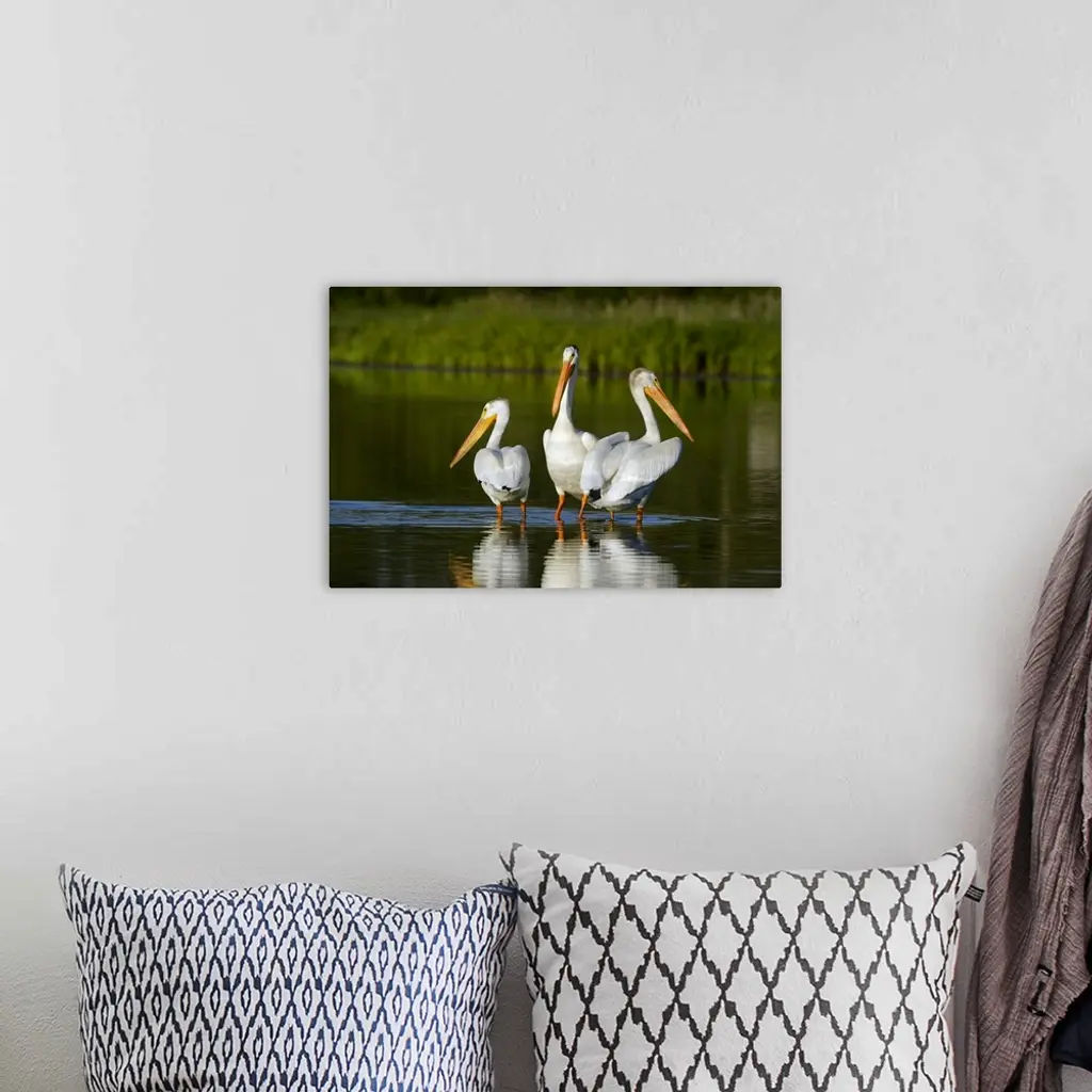 Pelicans In The Water wall art for home and office decor. Discover canvas art prints, photos, mural, big canvas art and framed wall art in GreatBigCanvas.com's varied collections.
