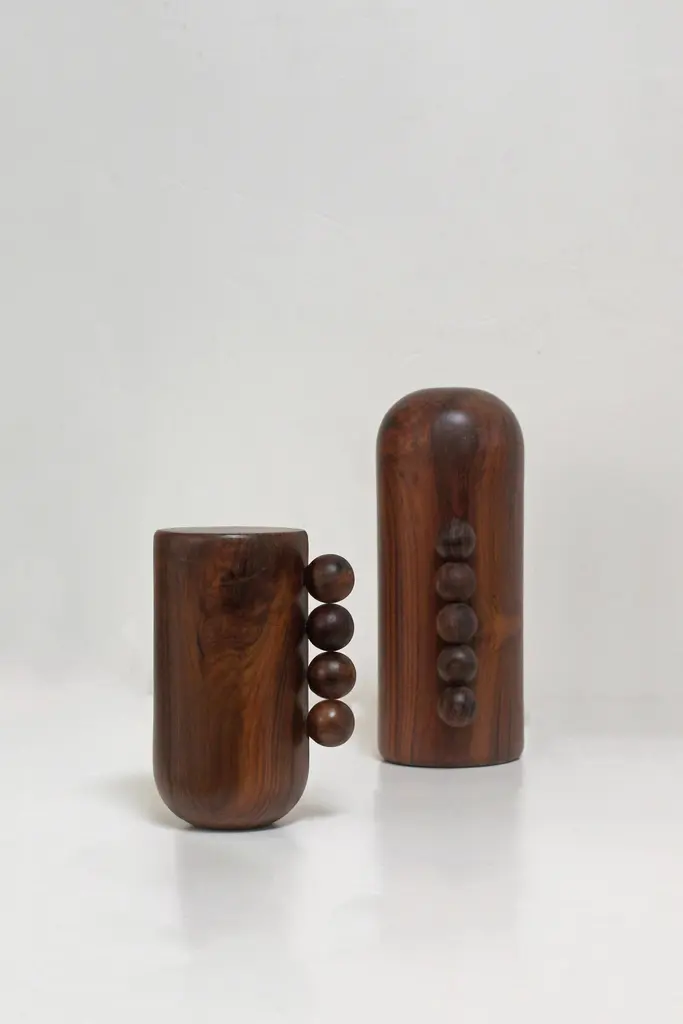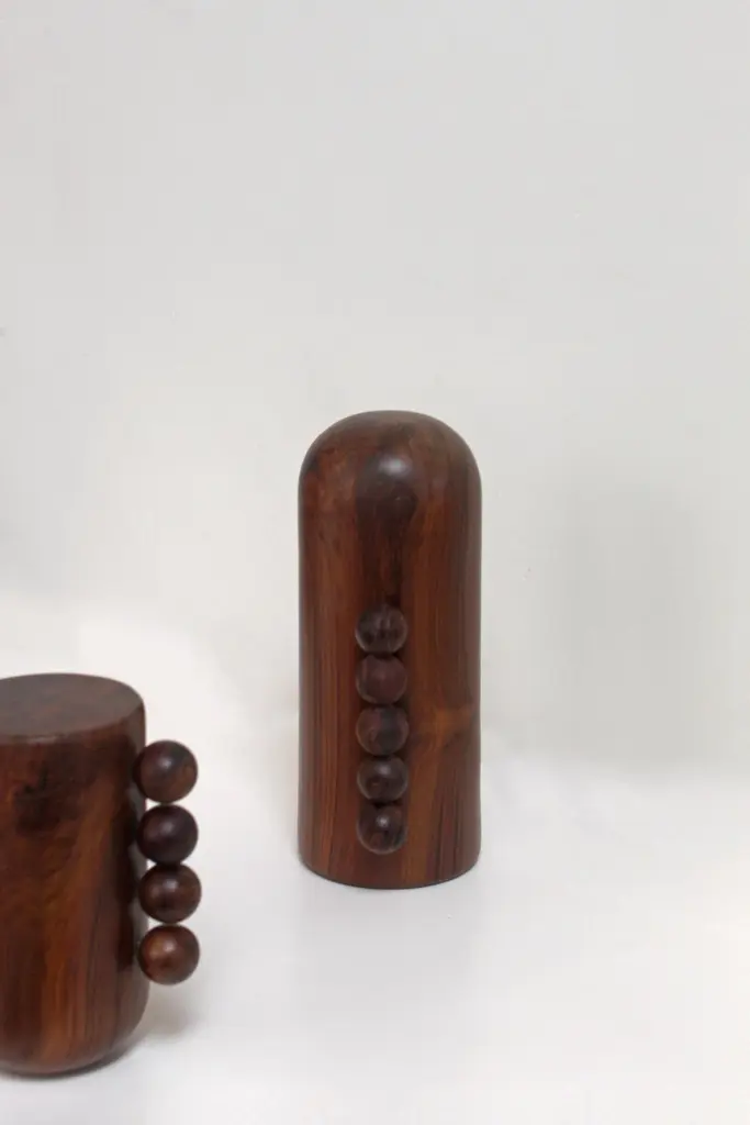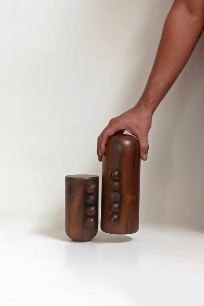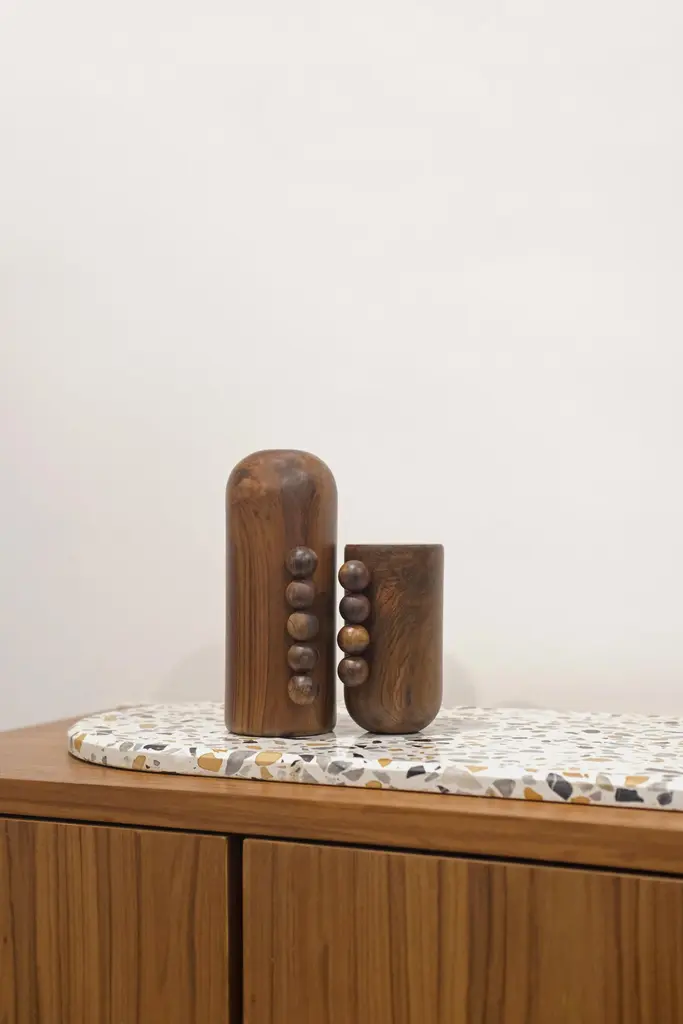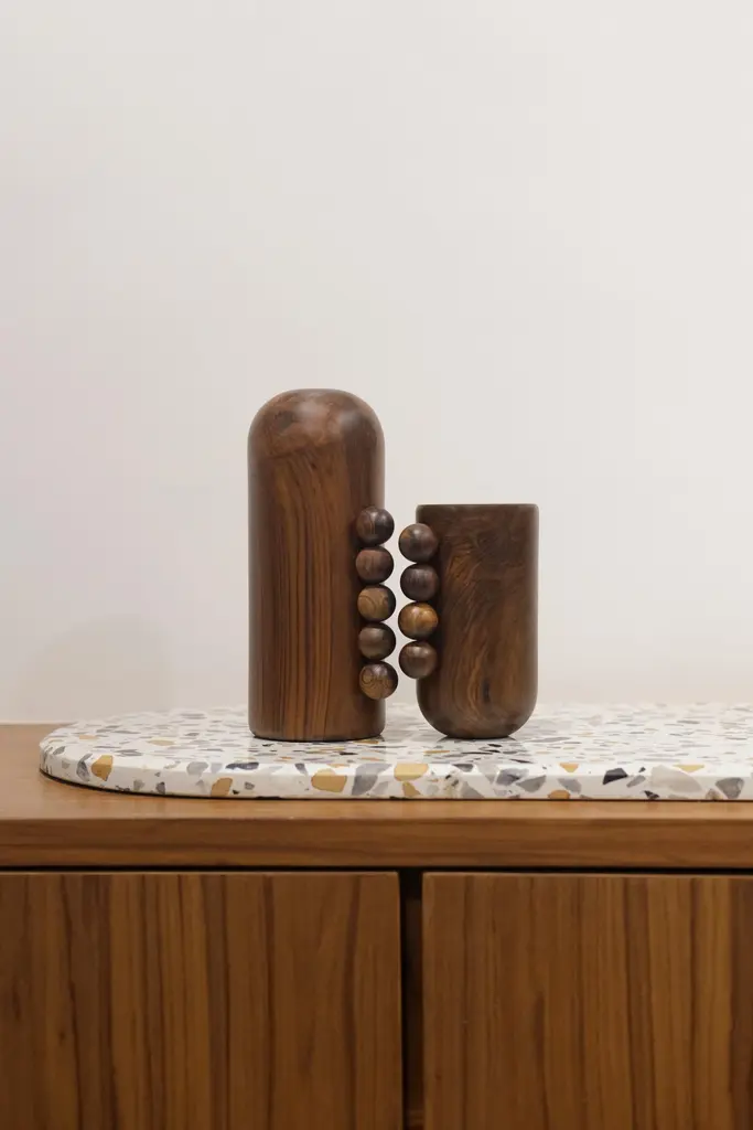 Pelotas Decor Objects by Studio IndigeneDimensions: D 10.16 x W 7.62 x H 15.24 cm D 11.43 x W 8.89 x H 22.86 cmMaterials: Reclaimed Teak Wood.Colors Brown, Natural Wooden Finish. The Pelotas duo stand in their simple silhouette, adorned by the woodengrain unique to each piece. The Pelotas will elevate your space with the warmth and charm of their handcrafted form.Studio Indigene looks at objects of varied scale and functionality; objects of decor and daily use. All the designs incline toward achieving clean lines and curves.The designs are minimalistic, with a keen experimentation of volumetric configuration and combining one or two materials with a base material, our favourite - wood.The studio is a medium of projecting our design sensibilities onto objects of utility and décor, trying to achieve visually appealing ratio and proportion. Our designs are realised by skilful handcrafting of our woodworkers; the process behind the making of each product is artful. Well-seasoned wood, finishing materials of the best quality are also attributes that transfigure our products; give them a premium form. Each product is singular, in the realest sense, at our studio.Studio Indigene is the brainchild of two architects - Tanvi Deolekar & Shubham Mestry. Meet our founders, who form the small team at Studio Indigene.