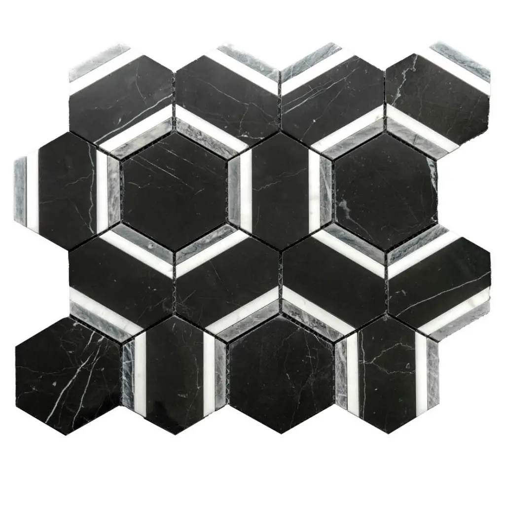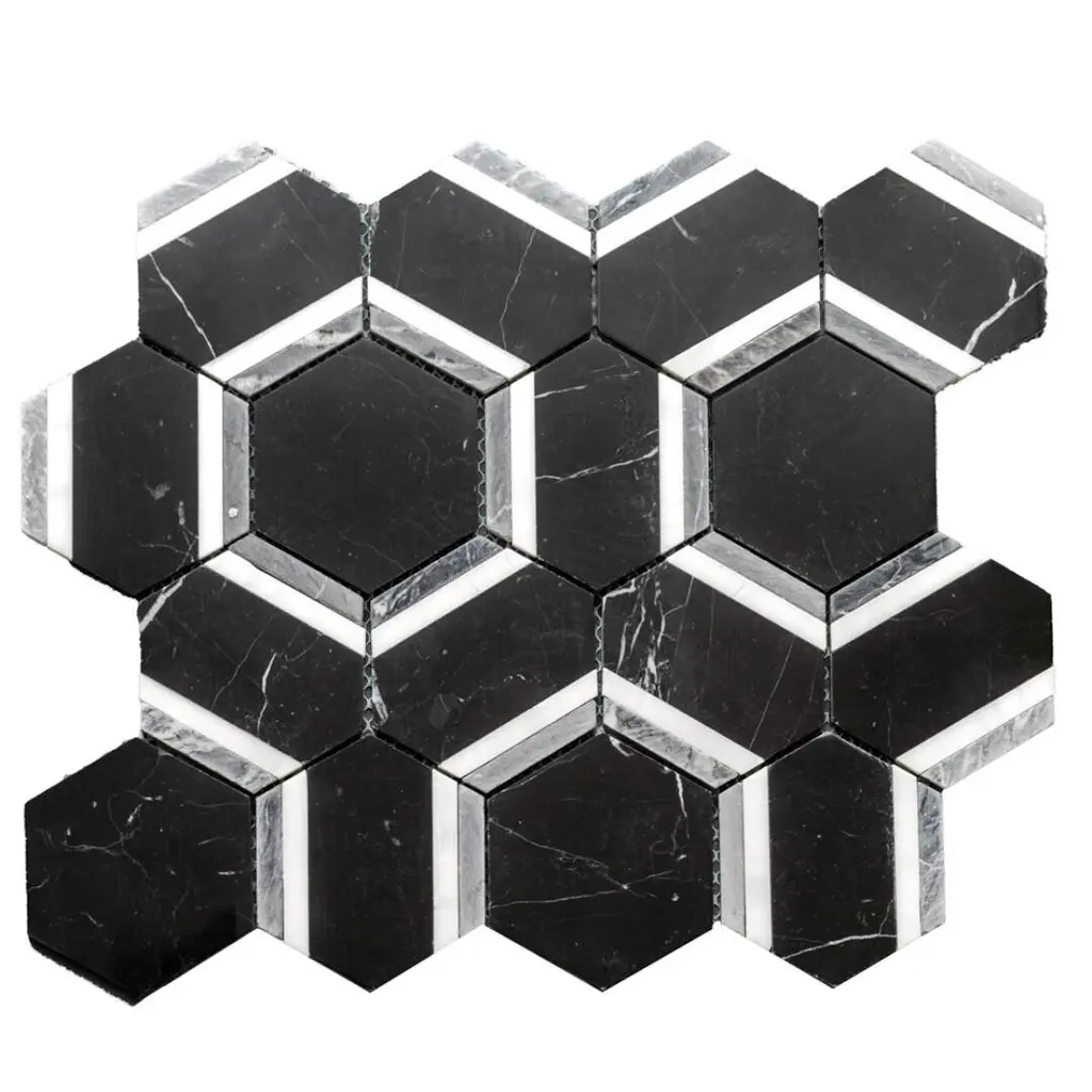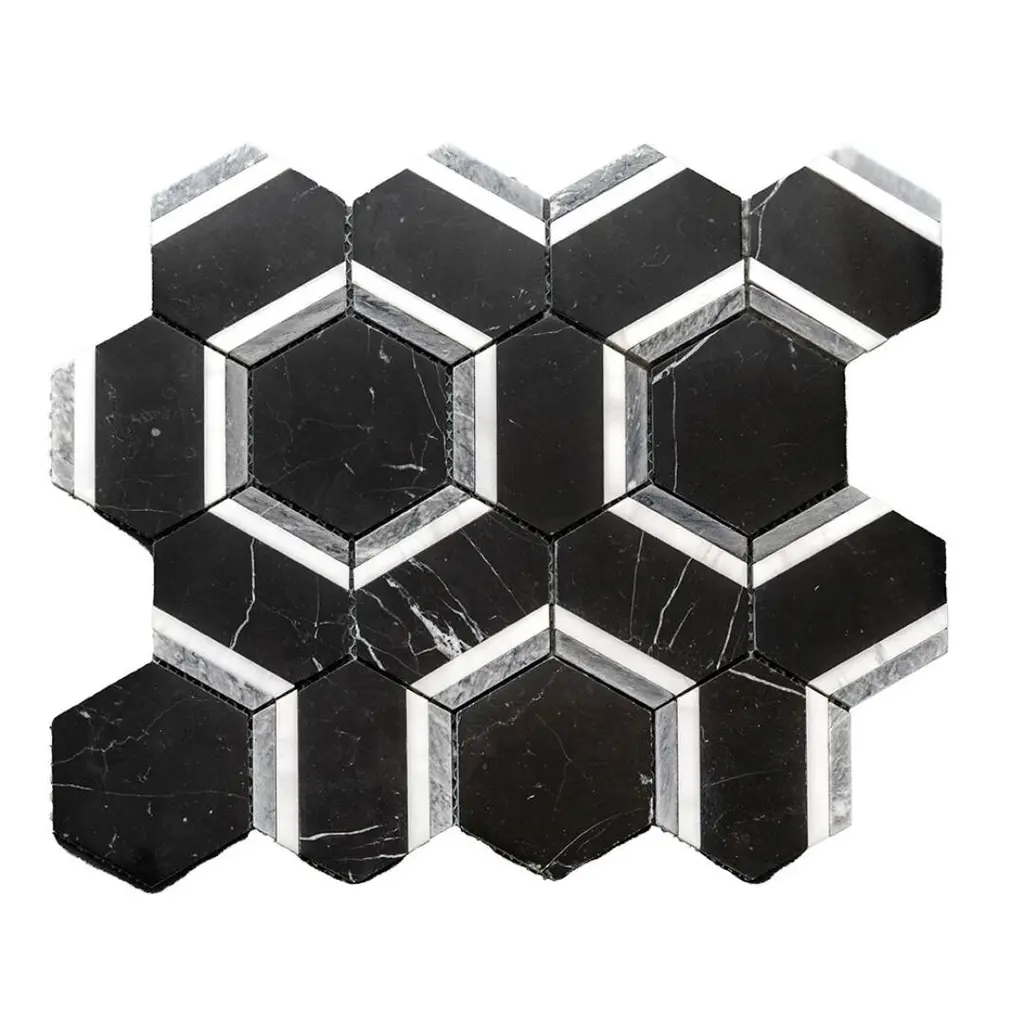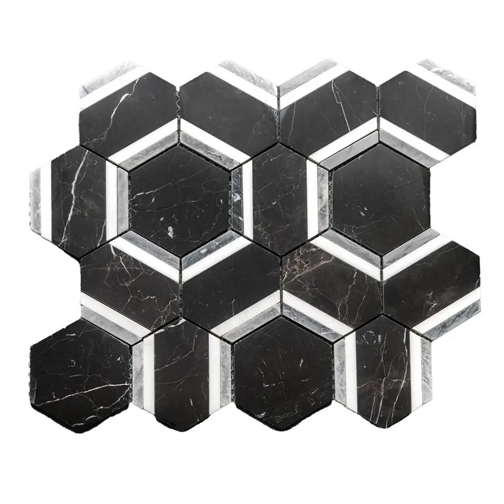 Introducing the Pelta Orb Mosaics Collection: a striking trio of hexagon-shaped tiles crafted from durable polished porcelain. Featuring a modern color palette and a fresh take on the classic hexagon motif, each tile showcases intricate geometric patterns that create a subtle yet captivating focal point. Ideal for both floors and walls, Pelta Orb brings a sleek, sophisticated edge to any space. FEATURES: Each mosaic sheet covers 0.84 square foot (approx.) Marble, meshed backed, hexagon, mosaic, polished, rectified edge tile for floor and wall use Impervious and waterproof; Not suitable for outdoor use but are resistant to most elements Polished finish with a shade 1 rating/ variation - V1 uniform appearance Distinctive art-deco-inspired marble mosaic Shiny polished finish Mesh-mounted, creating a seamless pattern and easy installation Perfect for interior wall or floor installations Great for backsplashes, kitchens, bathrooms, or feature walls Easy to install 13" x 11" decorative porcelain mosaic floor and wall tiles Available in three colors: Blanco Blend, Nero Blend, and Wooden Blend DIMENSIONS: Mosaic sheet: 13 inches L x 11 inches W Surface area per piece: 0.84 square feet