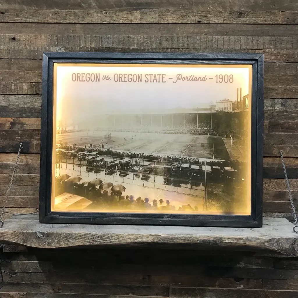 Showcase a part of Oregon's past with the Pendleton Parade, presented in a back lit frame made of distressed wood.