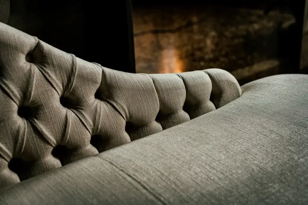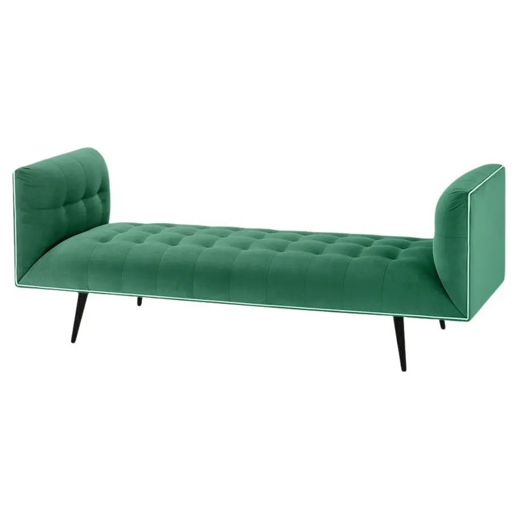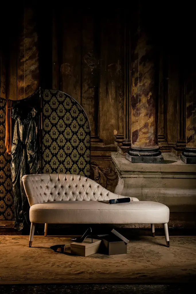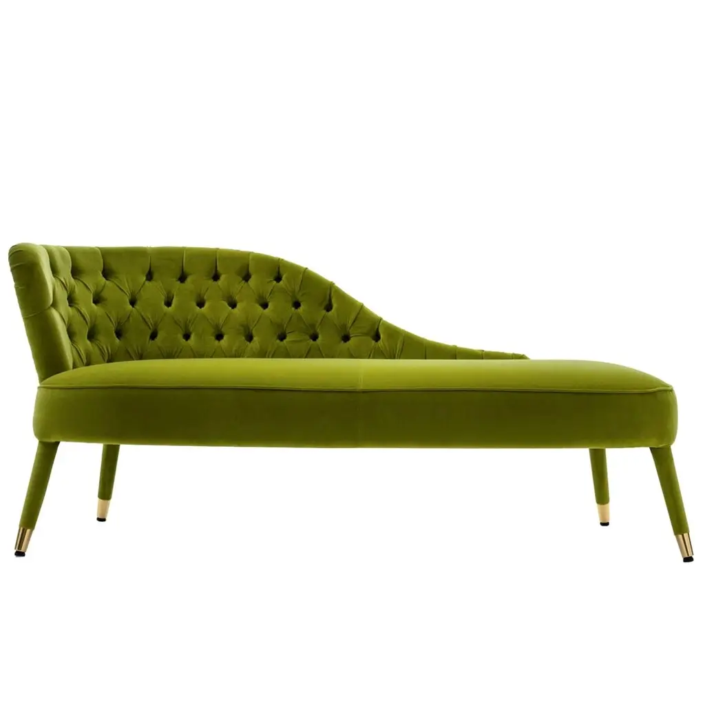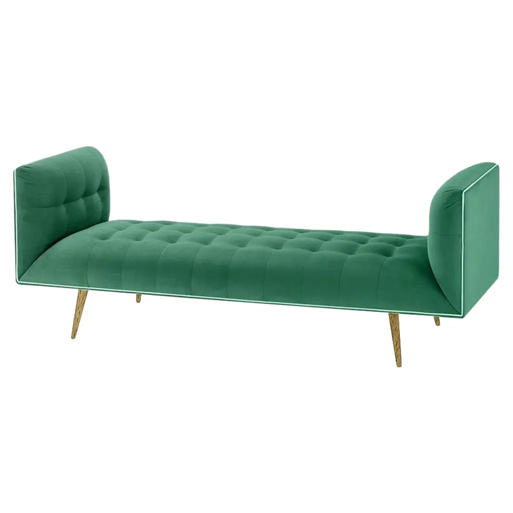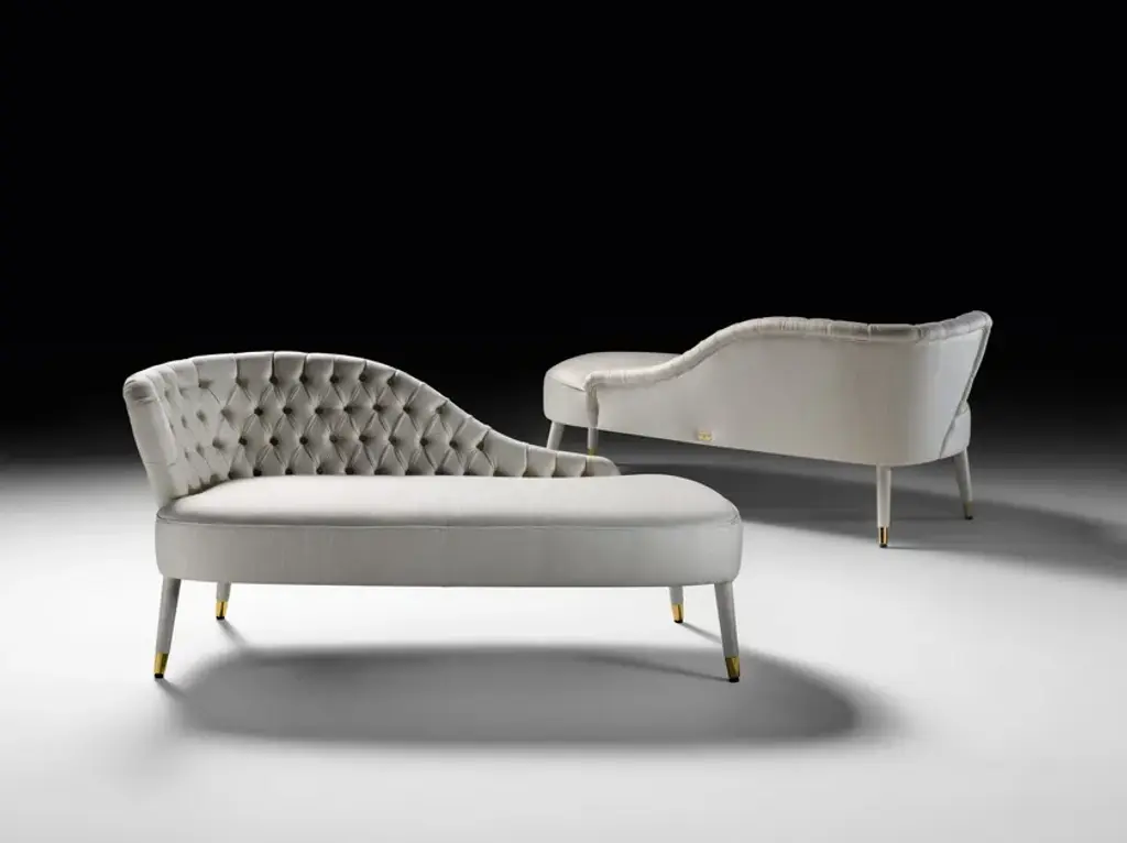 Penelope is a tufted fabric day bed. Three options available: fabric City Velvet col. 039; fabric Hot Madison col. 071; fabric easy Rider col. 073.Structure in beech wood, seat and back in fire-resistant expanded polyurethane. Tufted back. Feet upholstered with gold metal glides. Non-removable cover.Penelope expresses sinuous feminine elegance. The backrest, hand-made with capitonné quilting, gently follows the shape towards the comfortable seat, available with custom finishes. Another essential feature is the gold support: an elegantly refined Black Tie detail.