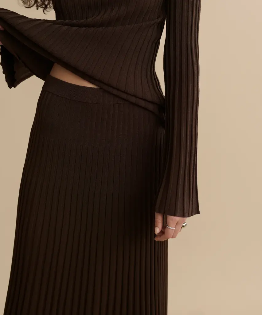 Penelope Skirt Chocolate A sculpted rib skirt with a slight sheen and pleated effect, the Penelope Skirt gives you effortless movement with every step. Seamlessly pairs with the matching Dara Top for an effortlessly polished ensemble.
