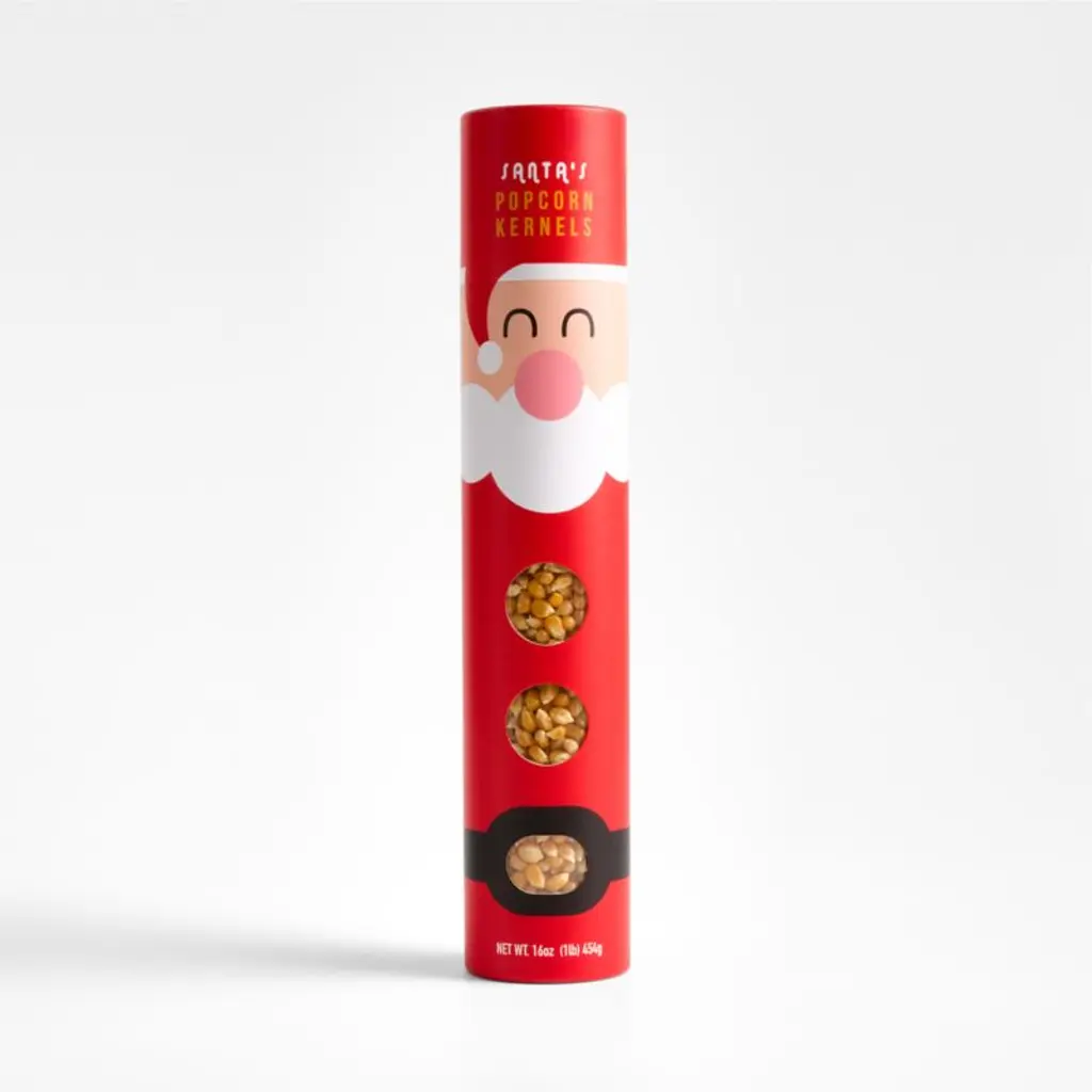 Whimsically decorated like Santa Claus, this tube of popcorn was made for stuffing a stocking. St. Nick is festively dressed for the holidays in his classic ensemble, the clear buttons and belt buckles revealing the golden yellow kernels within. Once popped, the pound of popcorn boasts impeccable fluffiness and flavor. Keep a few tubes on hand for grab-and-go gifting.