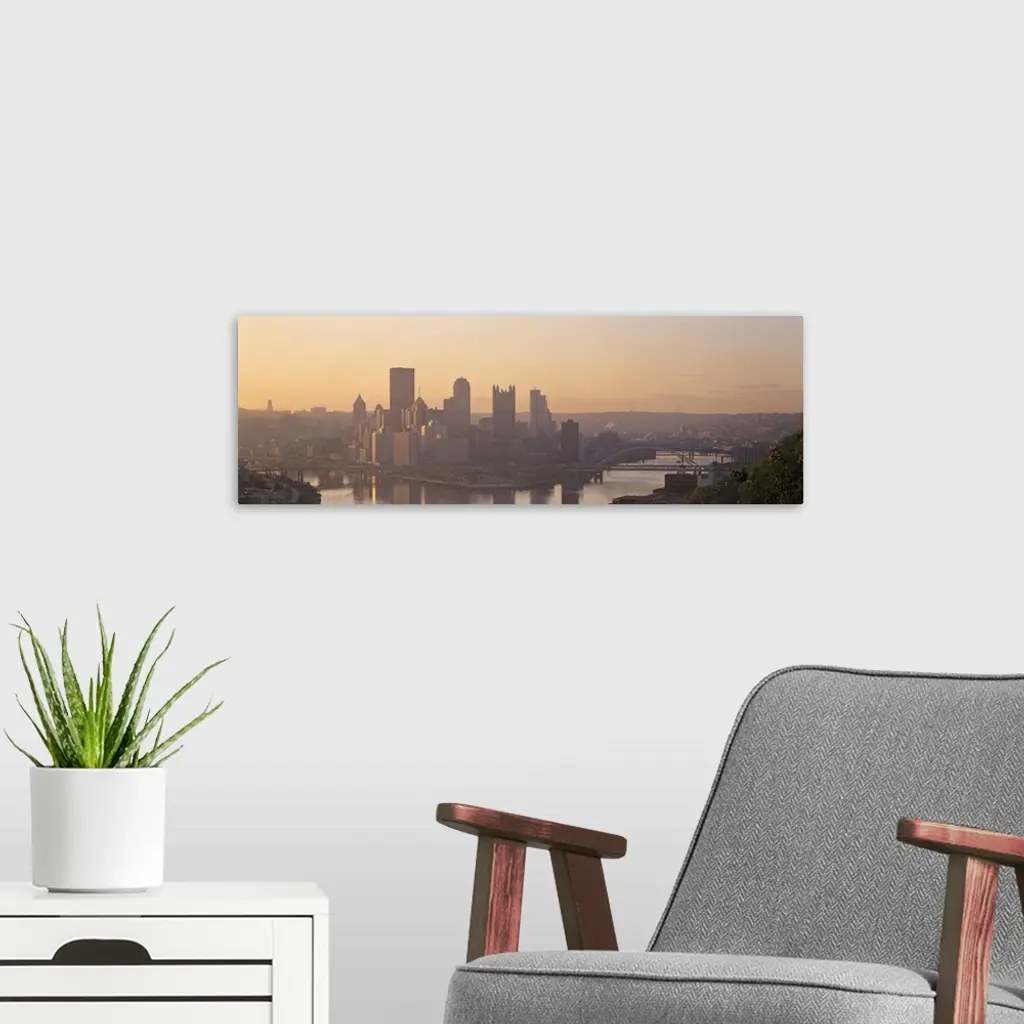 This is a panoramic photograph of the city skyline between two rivers becoming silhouetted in the late afternoon light.
