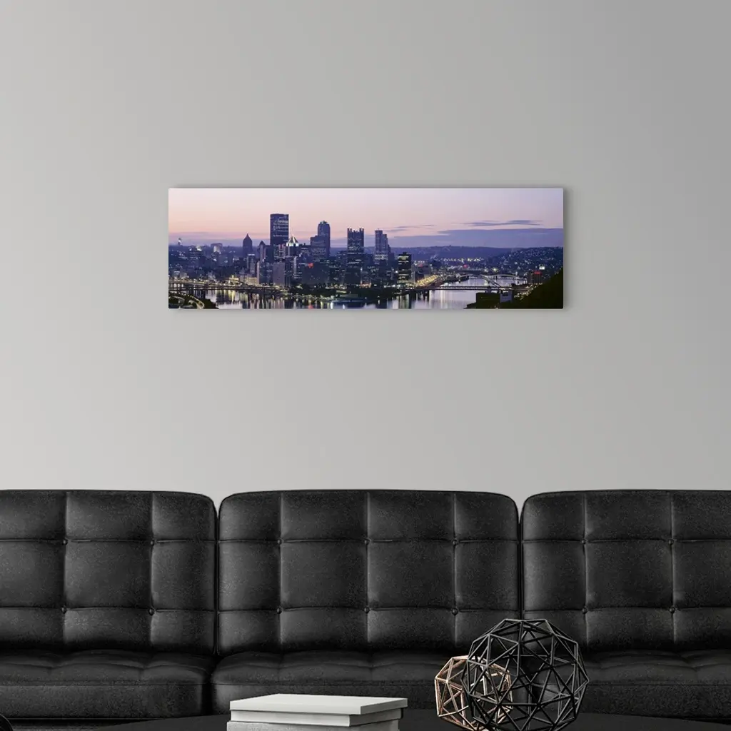 Panoramic photograph of skyline and waterfront lit up at sunset.