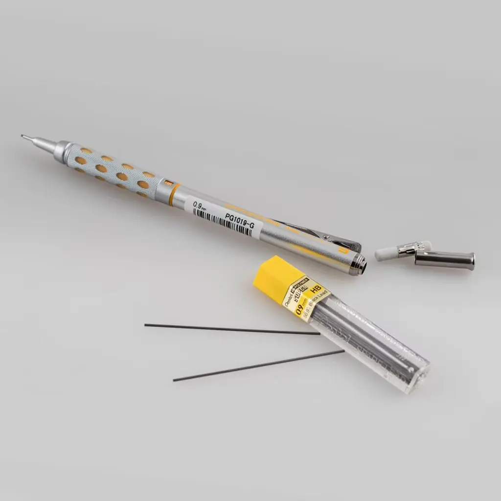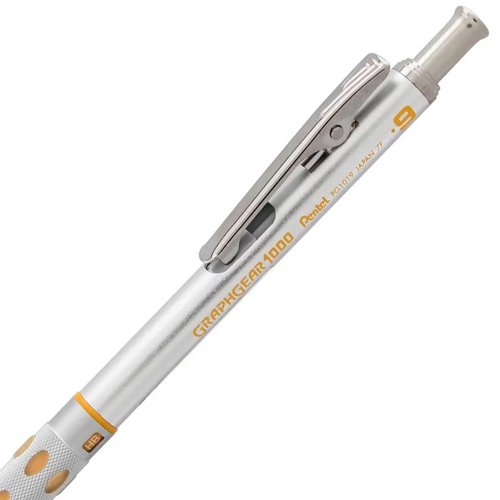 Pentel Arts GraphGear 1000 Automatic Drafting Pencil (0.9mm), Yellow Accents | The Pentel® GraphGear 1000 mechanical pencil is a top-tier drafting tool, perfect for professionals such as architects and draftsmen, as well as artists and enthusiasts. Its unique 4mm tip design is ideal for use with rulers and templates, making it a versatile addition to any drafting or drawing kit. One of its standout features is a dual-action retractor that advances and retracts the pencil tip, ensuring the lead is protected from breakage. This mechanical pencil also includes a built-in lead hardness indicator, allowing users to easily identify their lead type. Pre-loaded with Super Hi-Polymer® HB lead, this pencil delivers clear, dark lines and never requires sharpening. The GraphGear 1000 is designed for comfort, featuring a finely chiseled metallic grip inlaid with soft, latex-free pads for extended writing and drawing sessions. Backed by Pentel’s Limited Lifetime Warranty, this mechanical pencil is a reliable tool for all your drafting needs.