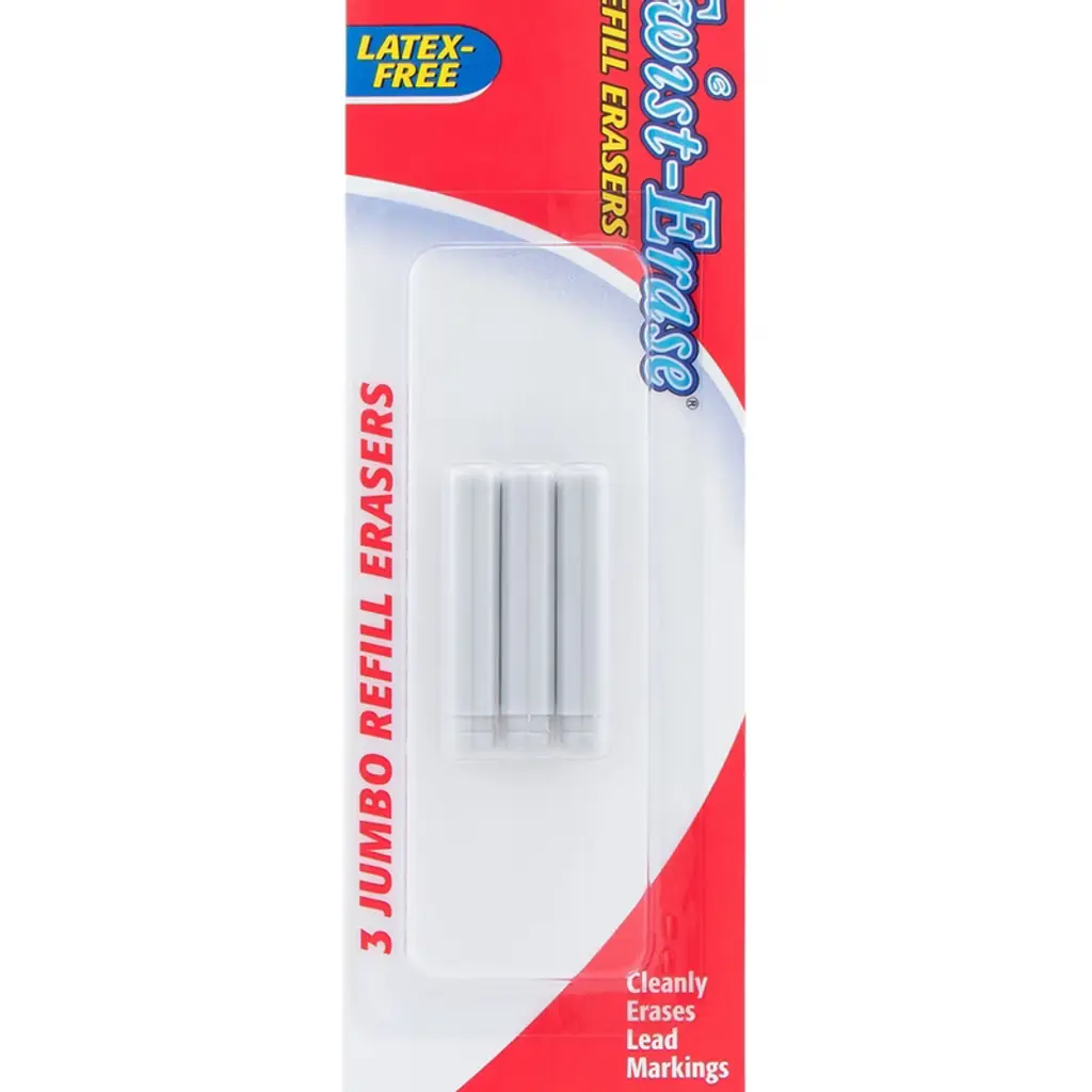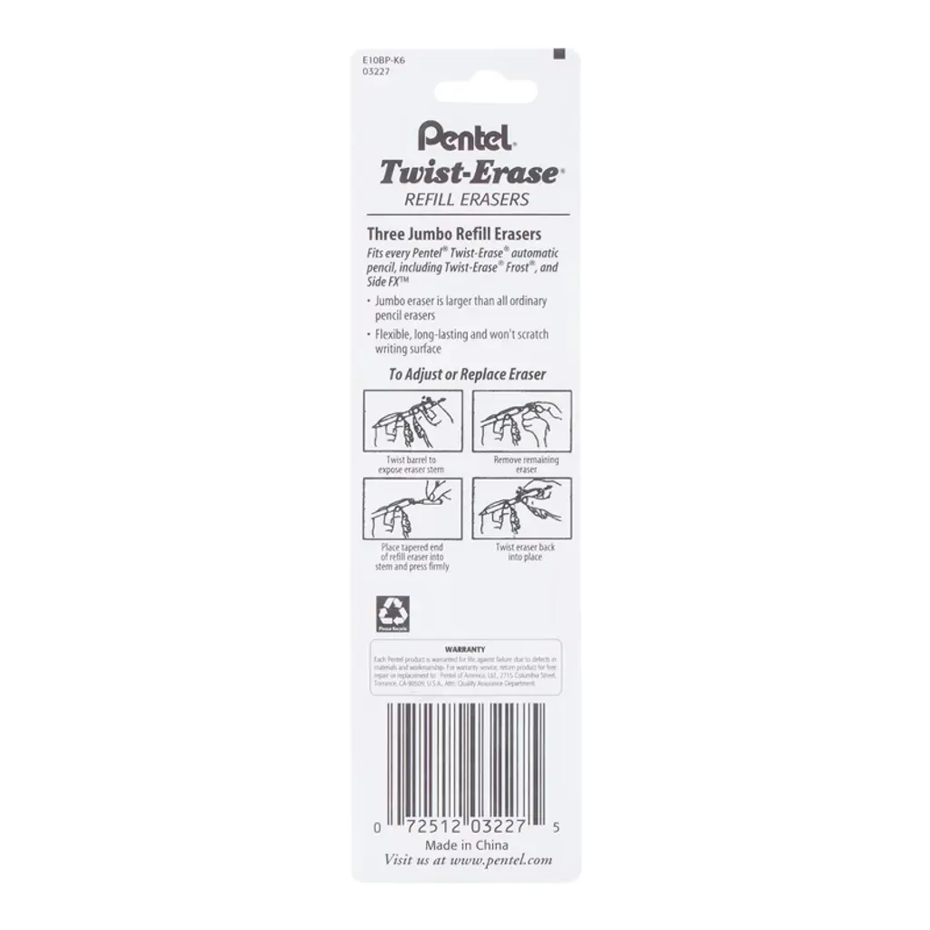 Pentel® Refill Eraser For Pentel Twist-Erase Series Pencils, 3 Per Pack, 6 Packs | Refill eraser fits all Twist-Erase Series mechanical pencils. Jumbo non-abrasive refill erasers are larger than all ordinary pencil erasers. Cleanly lifts graphite lead markings off paper without scratching, tearing, or ghosting. Refill for the following pencils: Side FX, Twist-Erase CLICK, Twist-Erase EXPRESS, and Twist-Erase III. Each pack includes 3 erasers. Sold as 6 packs for a total of 18 eraser refills.