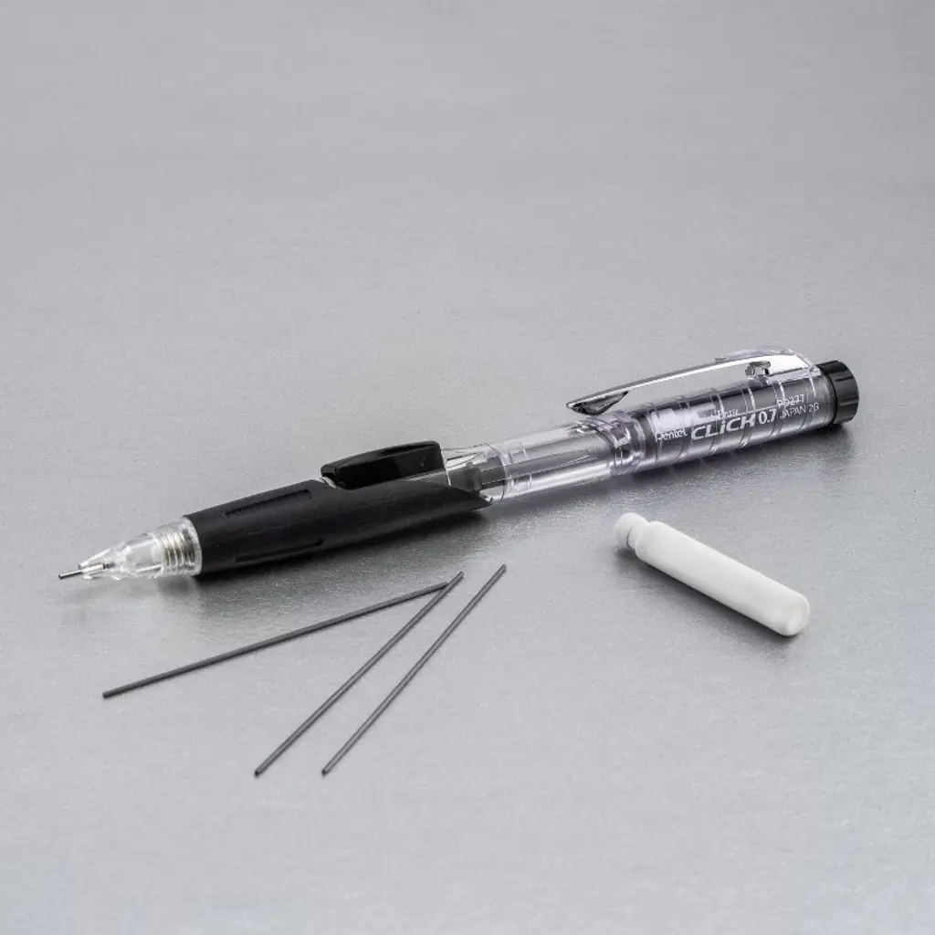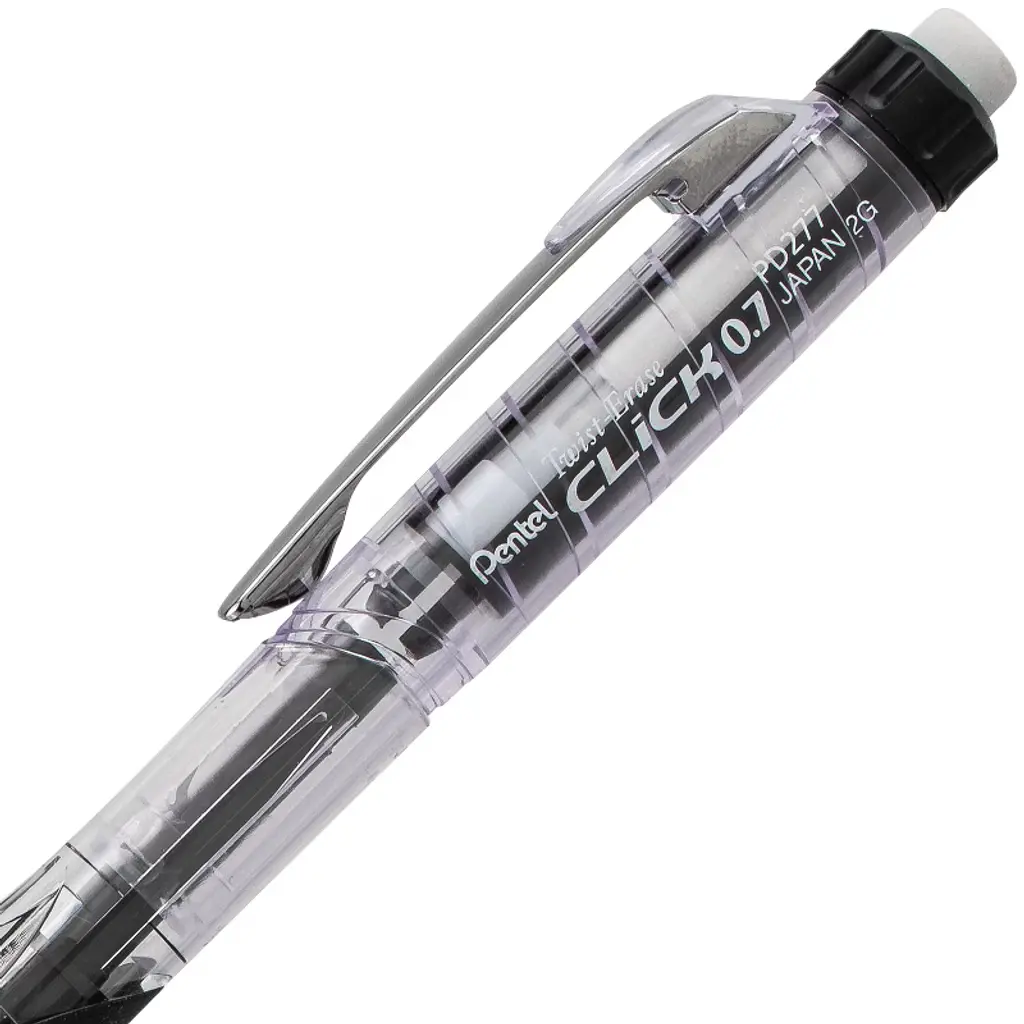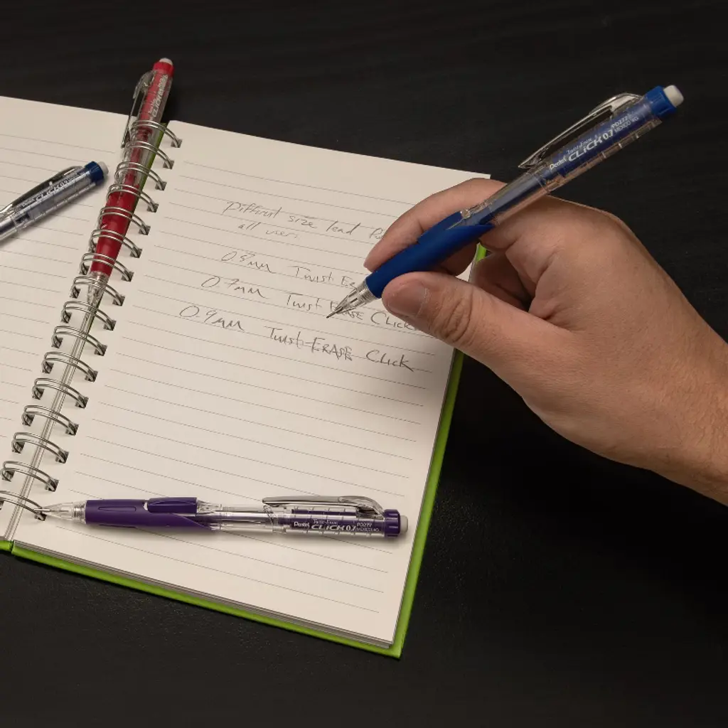 Pentel's Twist-Erase® Click's clear barrels with color accents also have an extended, latex-free, comfort grip. Mistakes are no match for the long lasting twist-up eraser. The quick-click side button advances lead without interrupting your writing.