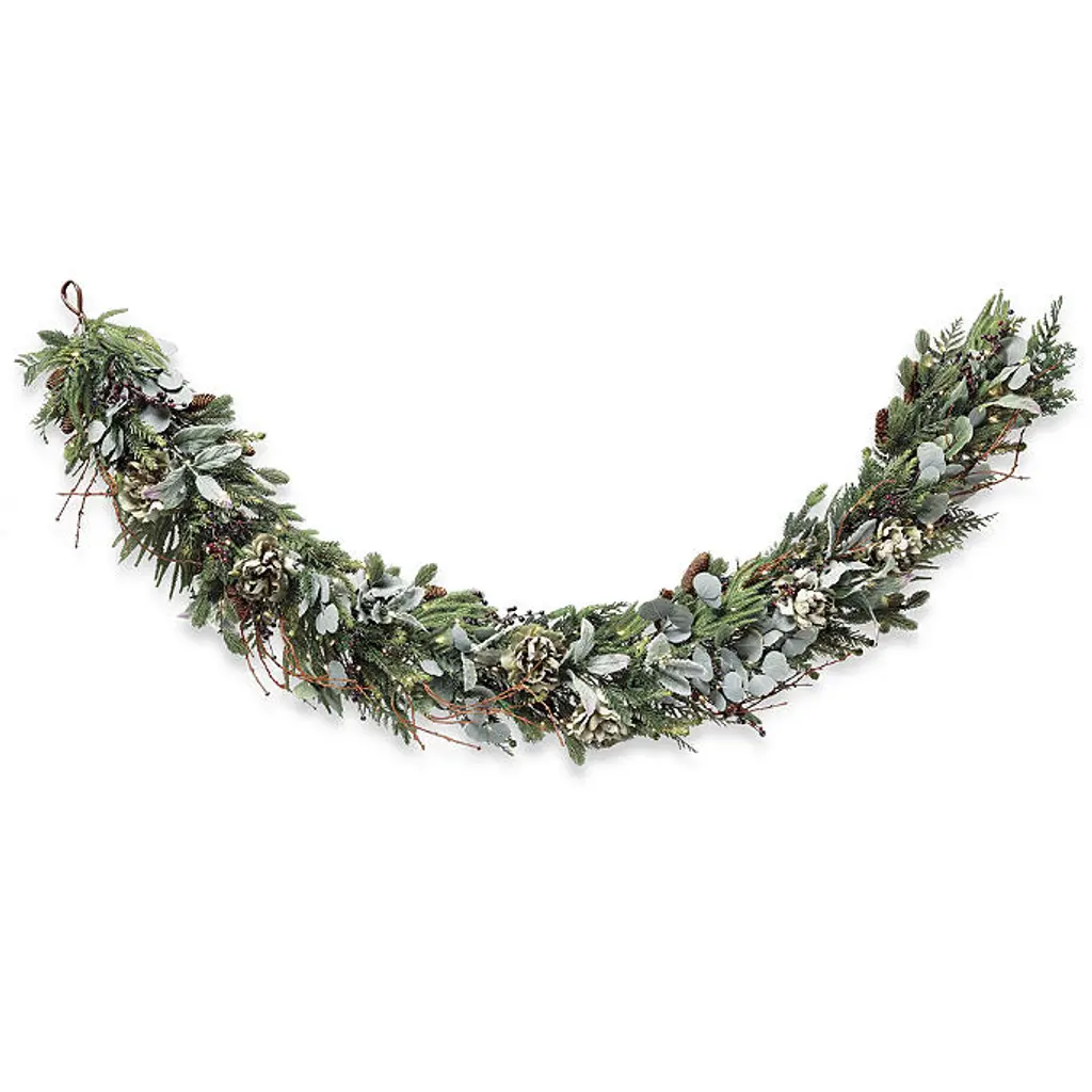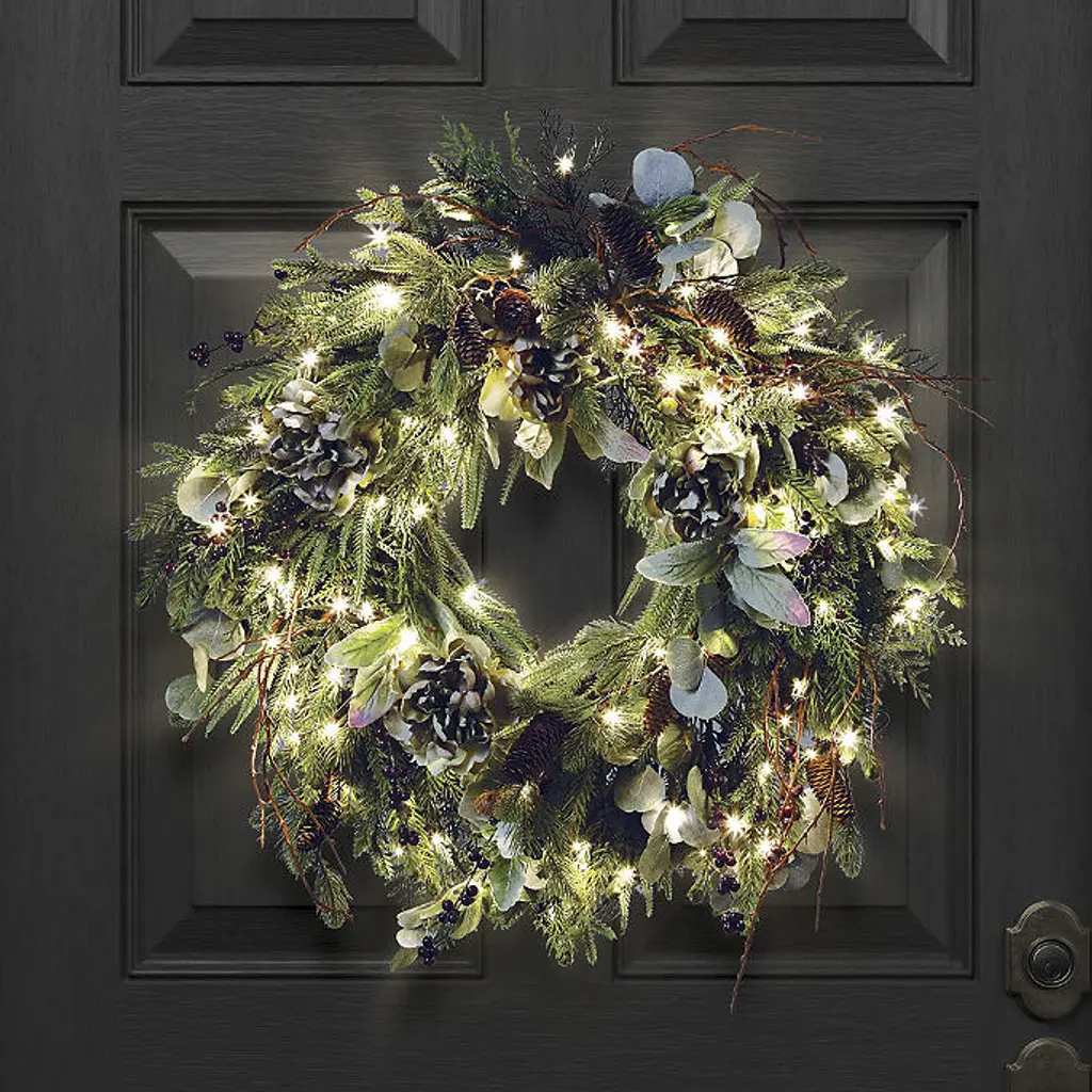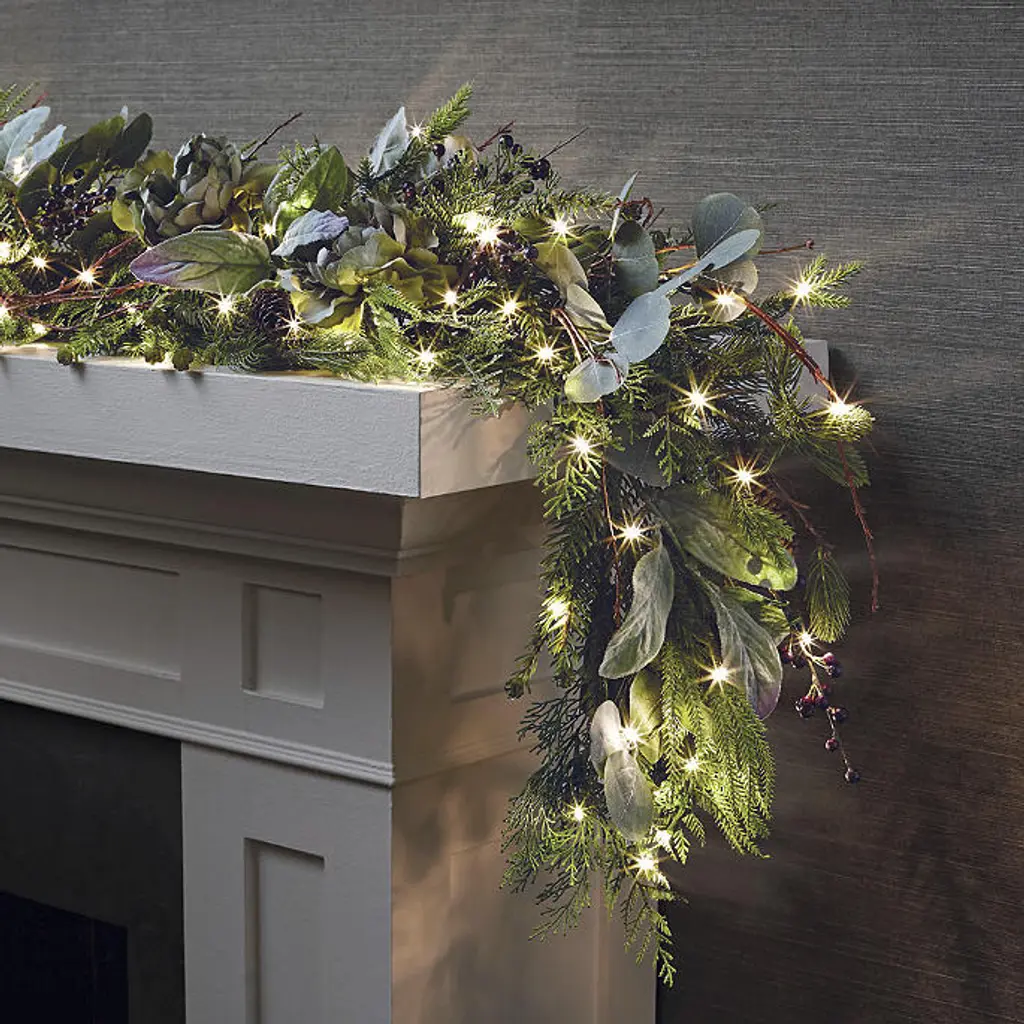 A blend of lifelike cypress, cedar, black spruce, white spruce, silver dollar eucalyptus, lamb's ears and peony blooms display a beautiful variation of green tones, accented by red berries and pine cones. This carefully crafted composition is illuminated by warm white LED lights for enjoyment day or night. Lifelike foliage Warm white LED lights Swag has 50 lights Wreath has 100 lights 6 ft. Garland has 100 lights 9 ft. Garland has 150 lights Use the built-in timer option to automatically turn the lights on for 8 hours and off for 16 hours Requires three C batteries (not included) Three-wire system provides even lighting exposure and reduces fading UV treated to prevent fading Fluff and shape greenery after unpacking To maximize the life of your greenery, we recommend a limit of 3 months of outdoor exposure per year Wipe clean with a soft, dry cloth or duster For indoor or outdoor use Imported At Frontgate, our primary focus is quality. We guarantee that every product we sell will stand up to the supreme test â our customers' satisfaction. To learn more about our policies, visit our Shipping & Processing, Returns & Exchanges and Warranty & Price Guarantee pages. A blend of lifelike cypress, cedar, black spruce, white spruce, silver dollar eucalyptus, lamb's ears and peony blooms display a beautiful variation of green tones, accented by red berries and pine cones. This carefully crafted composition is illuminated by warm white LED lights for enjoyment day or night. Lifelike foliage Warm white LED lights Swag has 50 lights Wreath has 100 lights 6 ft. Garland has 100 lights 9 ft. Garland has 150 lights Use the built-in timer option to automatically turn the lights on for 8 hours and off for 16 hours Requires three C batteries (not included) Three-wire system provides even lighting exposure and reduces fading UV treated to prevent fading Fluff and shape greenery after unpacking To maximize the life of your greenery, we recommend a limit of 3 months of outdoor exposure per year Wipe clean with a soft, dry cloth or duster For indoor or outdoor use Imported At Frontgate, our primary focus is quality. We guarantee that every product we sell will stand up to the supreme test â our customers' satisfaction. To learn more about our policies, visit our Shipping & Processing, Returns & Exchanges and Warranty & Price Guarantee pages.