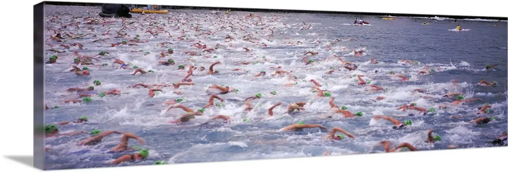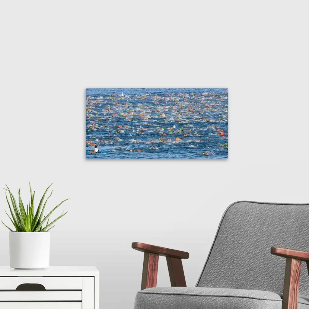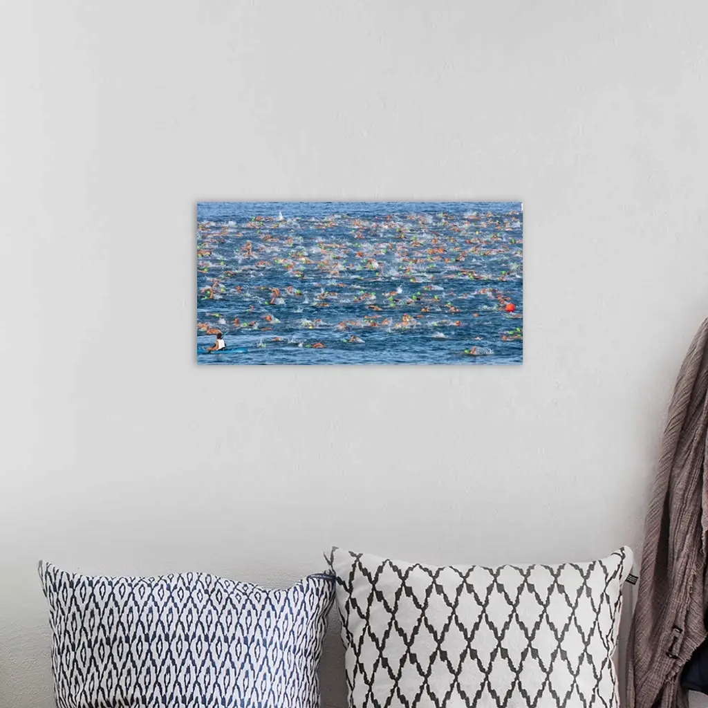 Horizontal photo on canvas of triathletes swimming in the ocean during the Ironman Kona race.