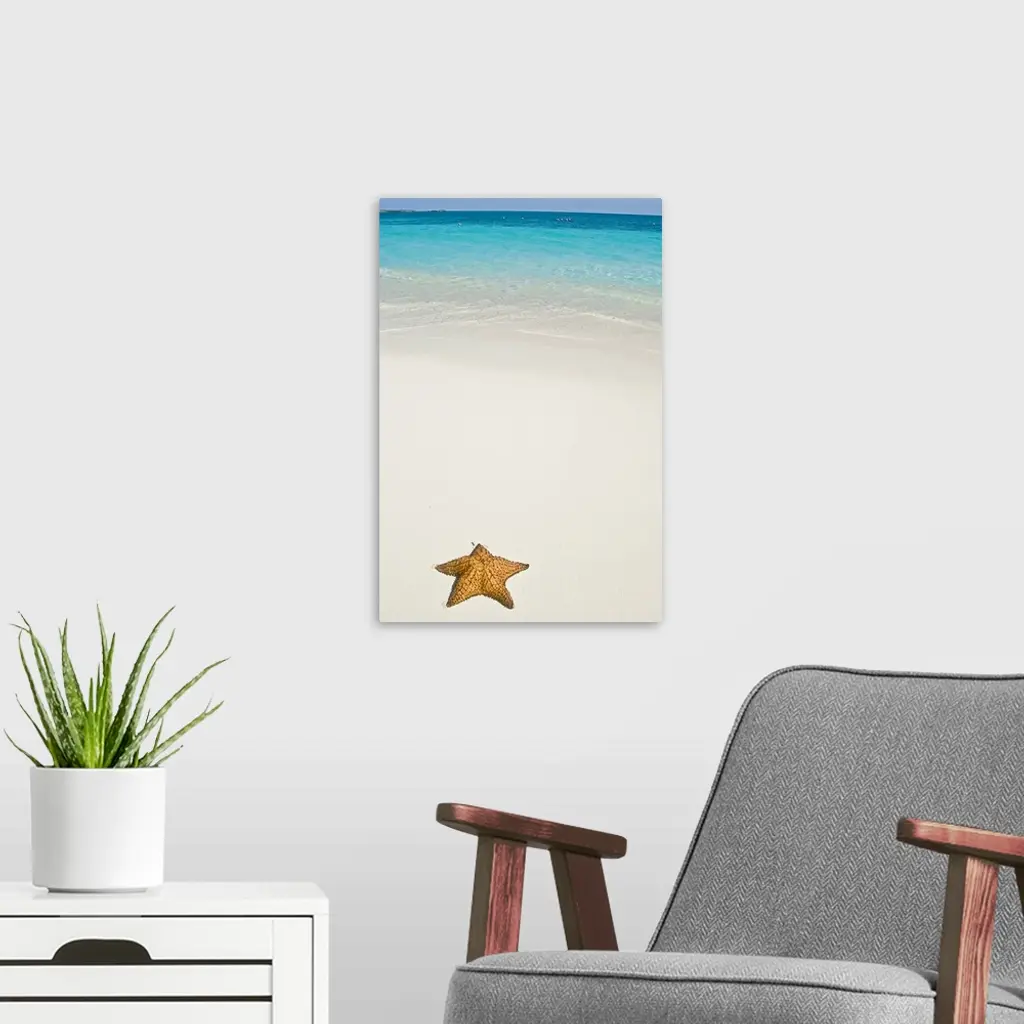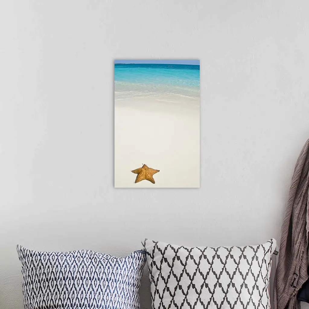 Vertical panoramic photograph of starfish in the sand with the ocean in the distance under a cloudy sky.