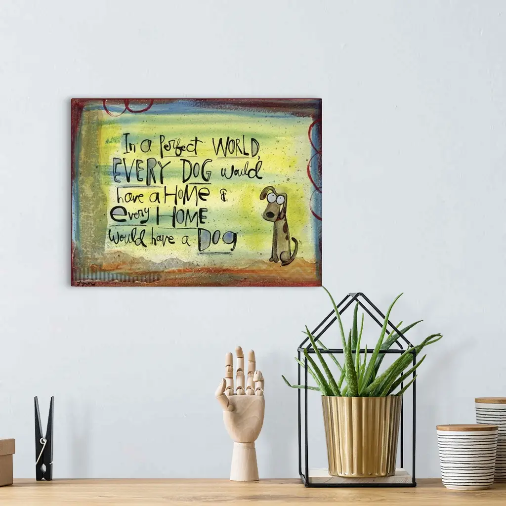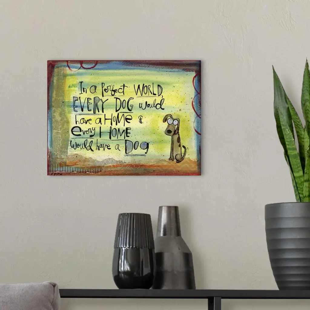 "In a perfect world, every dog would have a home and every home would have a dog" written in fun lettering with a cute illustration of a dog.
