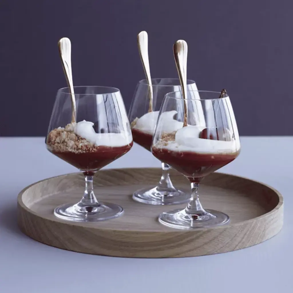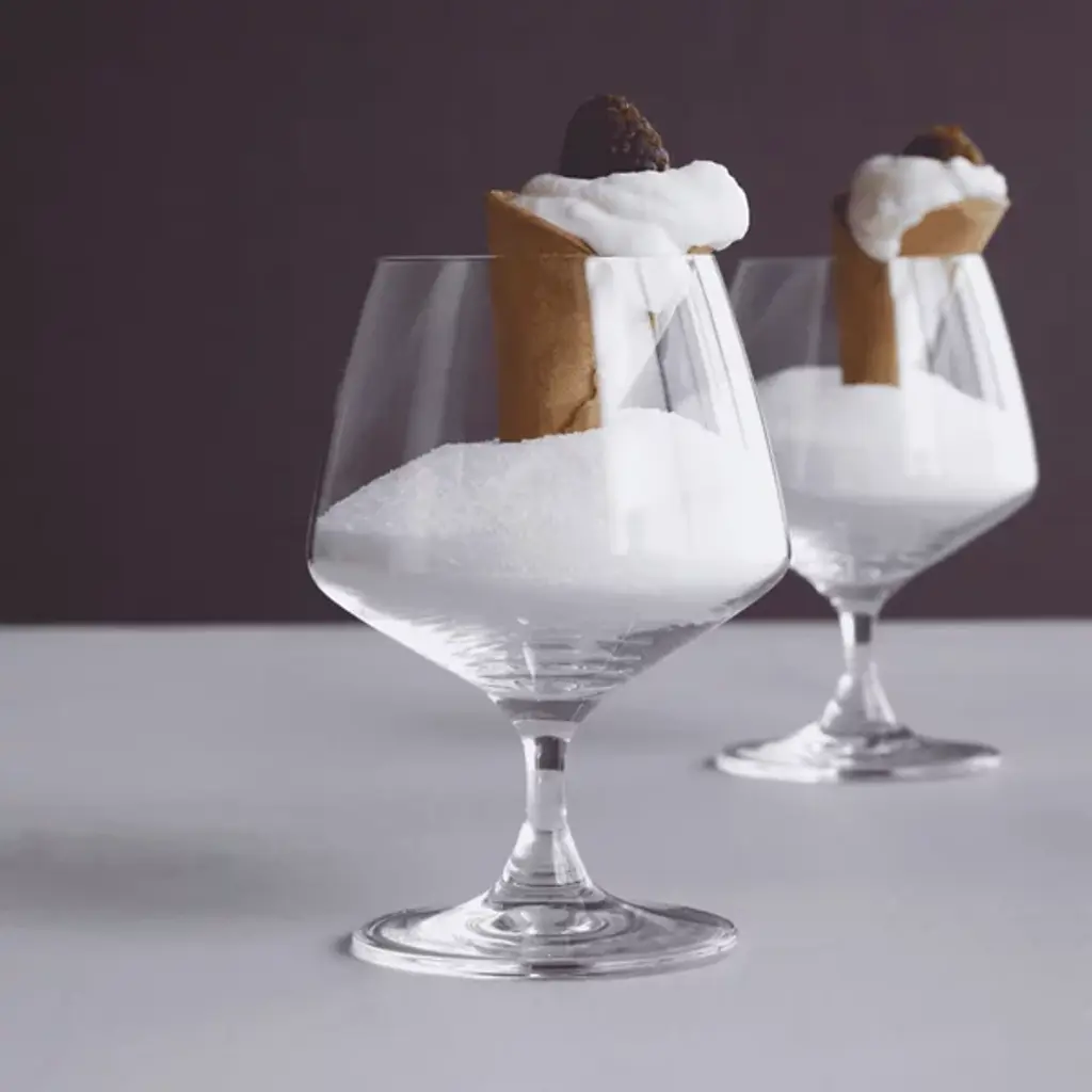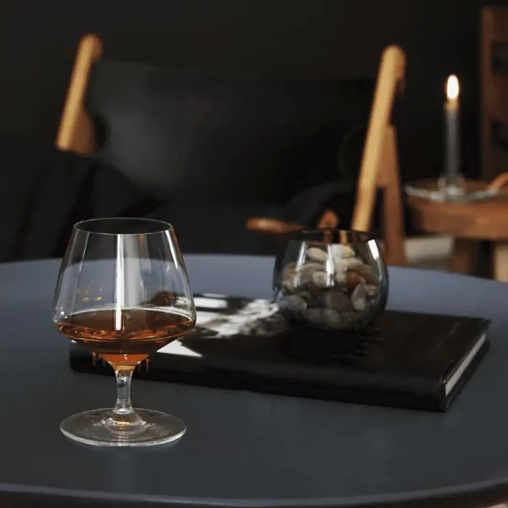 The Perfection Brandy Glass, Set of 6 from Holmegaard features a deliberately shortened stem that brings the bowl closer to your hand. This intentional design allows gentle warming from palm contact, gradually bringing brandy to its optimal tasting temperature. The generous bowl creates ample space for swirling and aromatic concentration. Tom Nybroe incorporated the collection's signature etched line here as both a functional marker and decorative accent. The clear glass construction ensures nothing interferes with appreciating the spirit's rich color and clarity.