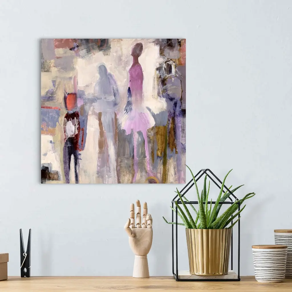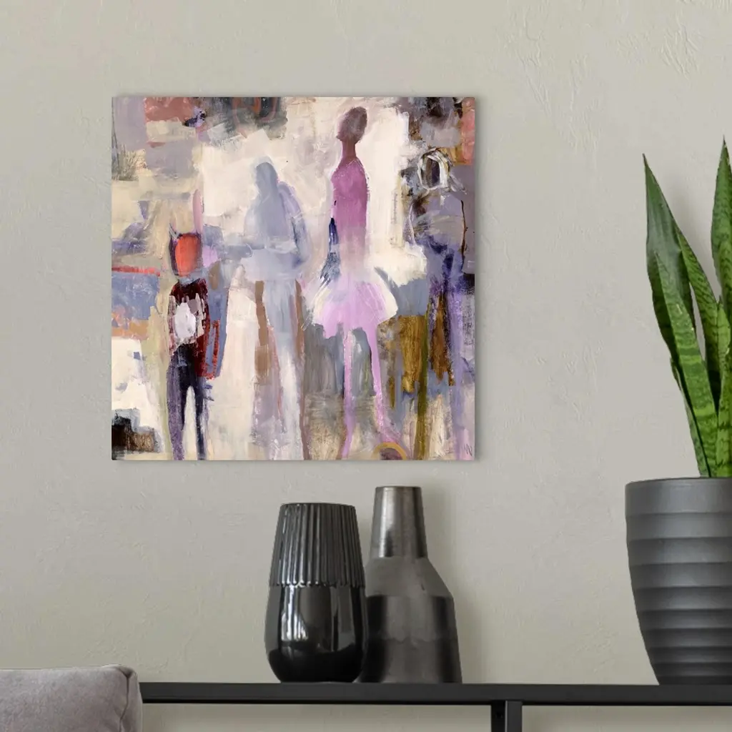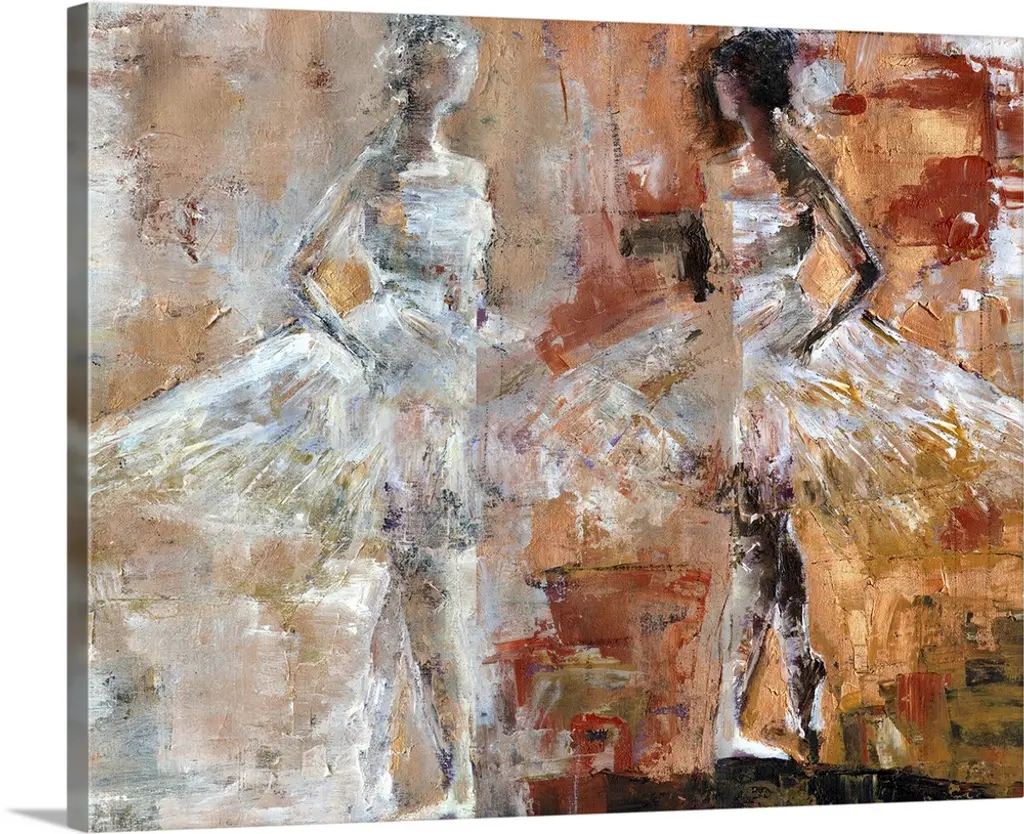 Abstract modern art depicting dancers in colorful neutral streaks of color creating a rough texture.