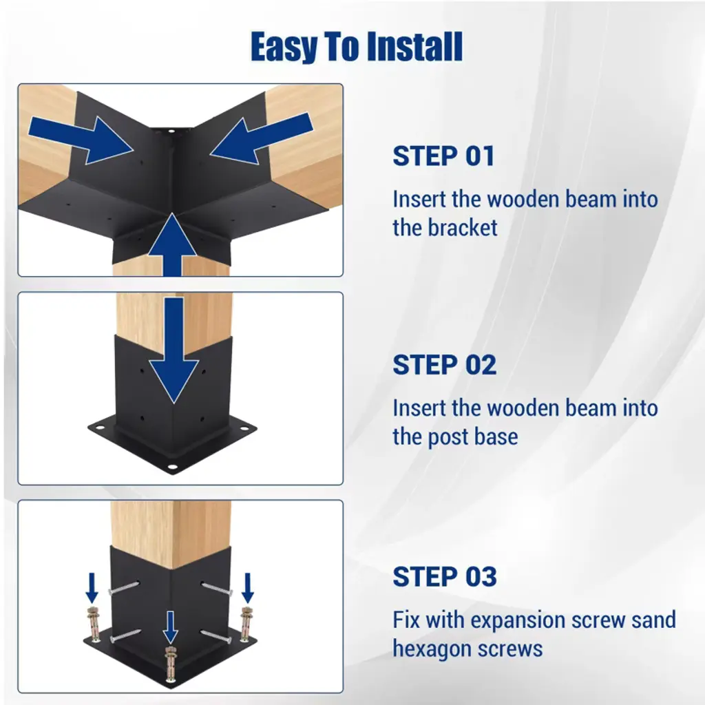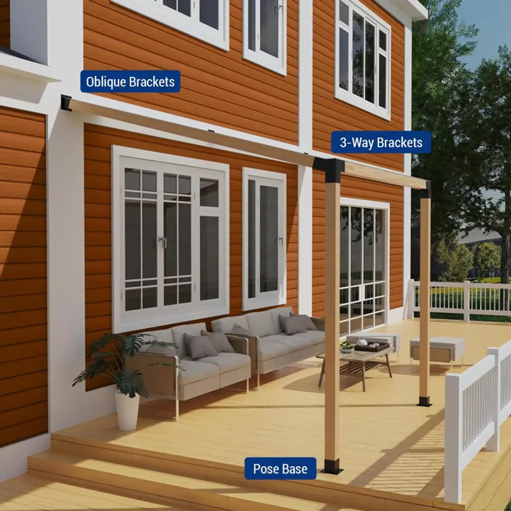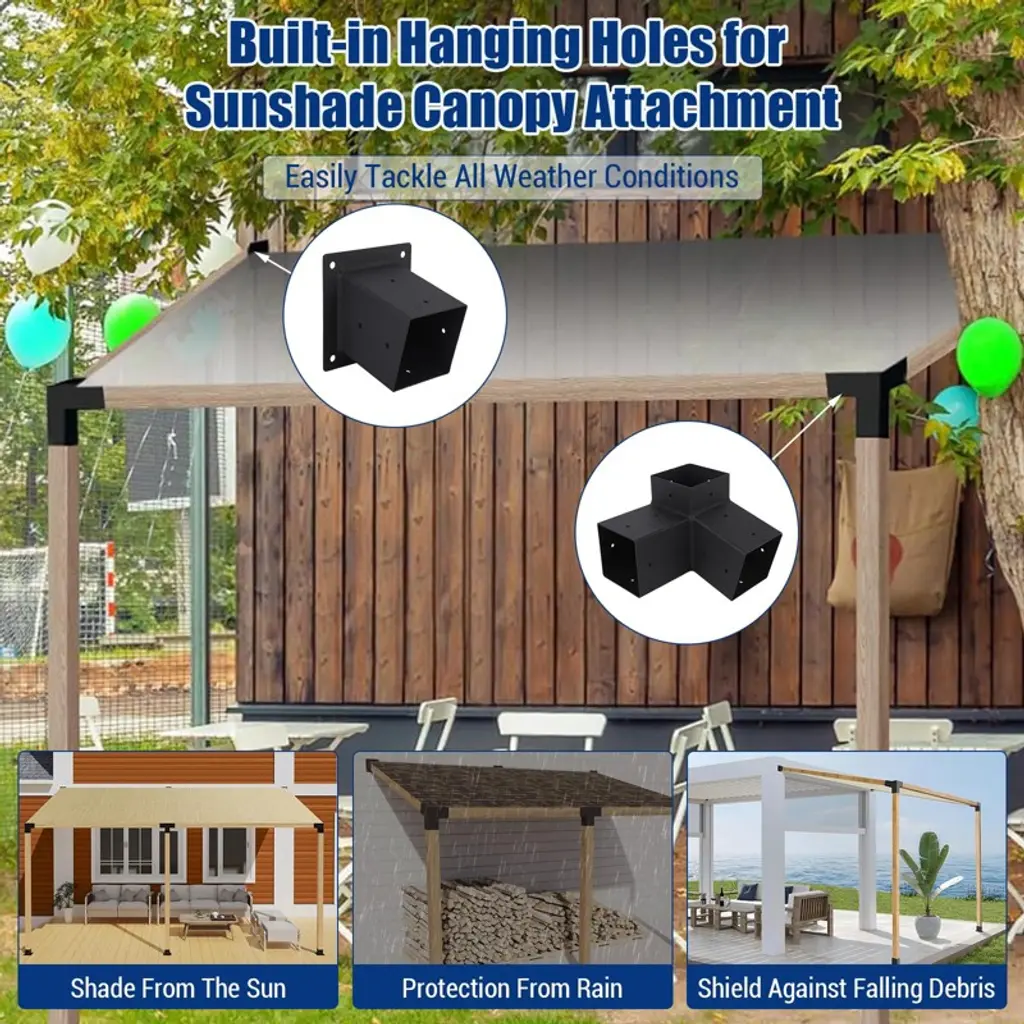 With a built-in hanging hole, our brackets facilitate the easy installation of a sunshade sail, efficiently blocking sunlight and rain while safeguarding the interior against rain .The assembly process is straightforward: simply cut the wood to the desired lengths, insert it into the brackets, and secure. This user-friendly kit is perfect for DIY enthusiasts of all skill levels.
