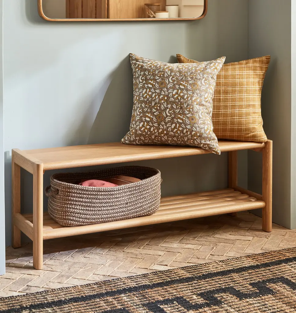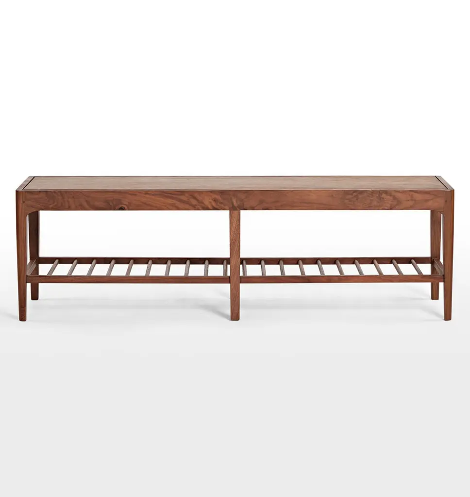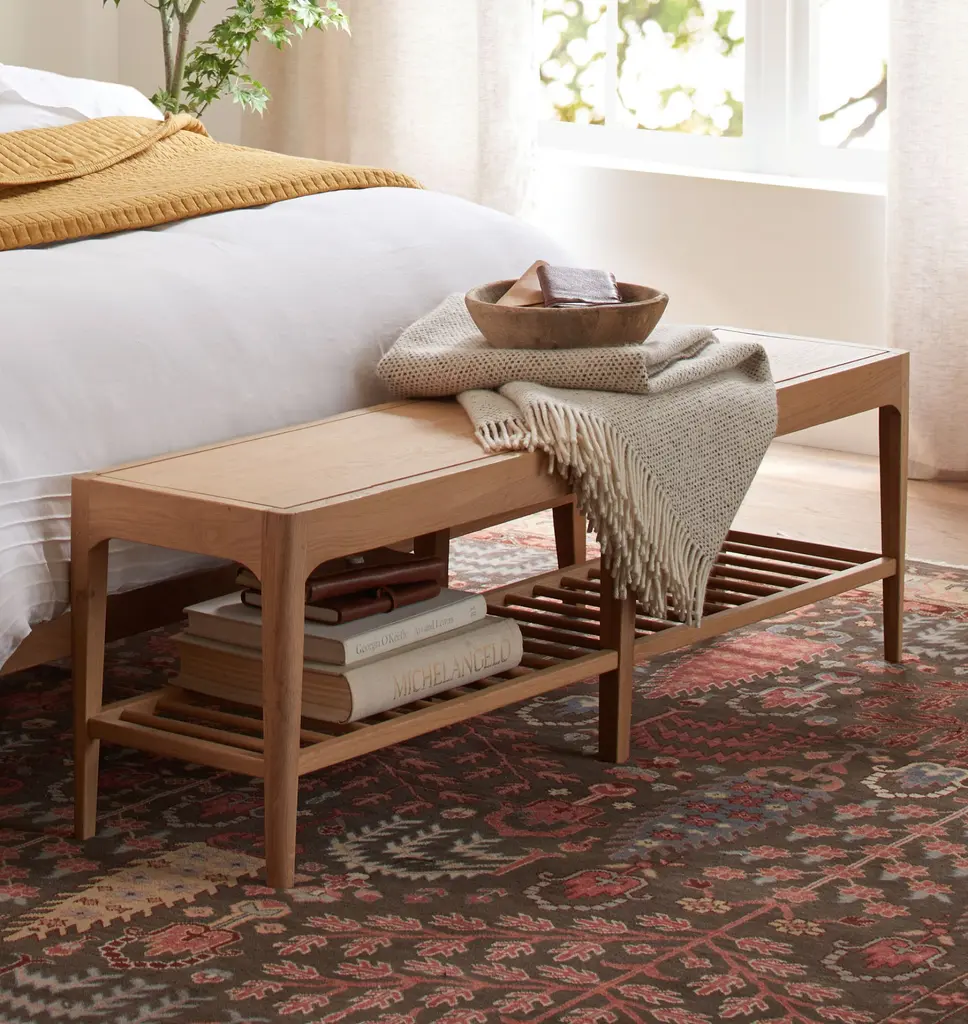 Crafted with solid walnut or white oak, our Perkins Spindle Bench makes a timeless and functional addition to any space, offering extra seating and added storage with the built-in spindle shelf below.
