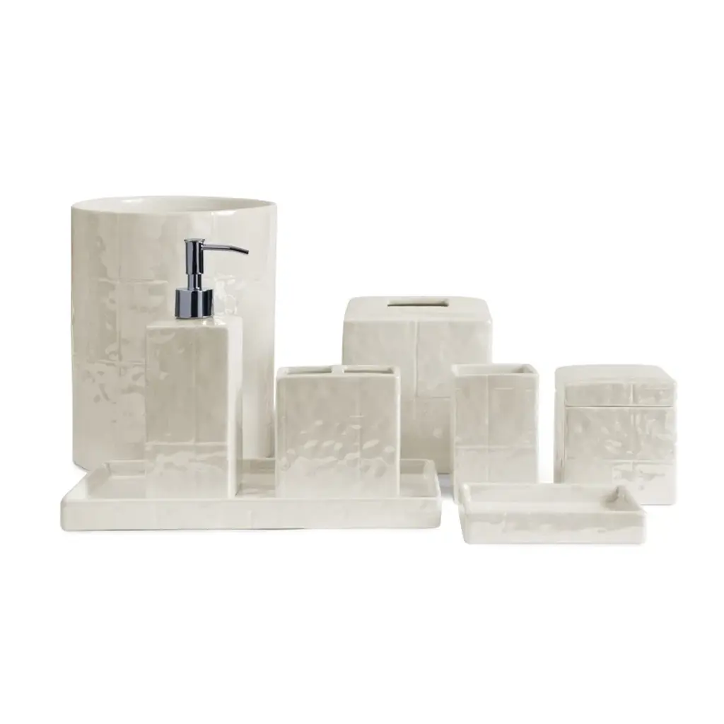 Made from high-quality ceramic and porcelain, this accessory set features a stunning iridescent glaze, reminiscent of classic bathroom tiles, adding a touch of timeless elegance.