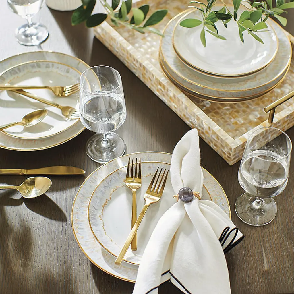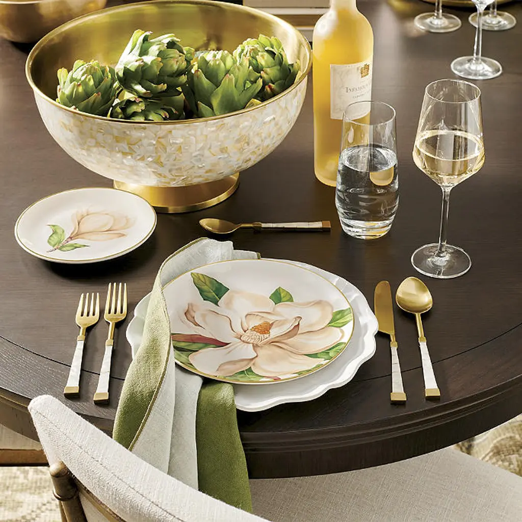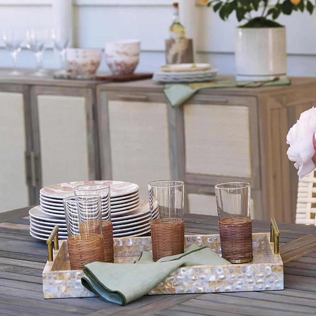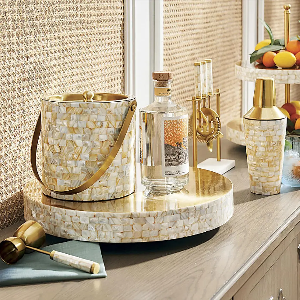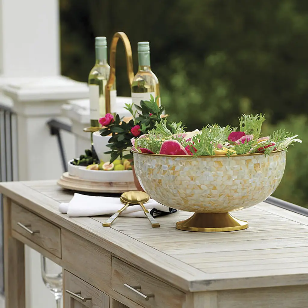 Constructed of a mother of pearl inlay paired with brass finish metal, this neutral, yet elegant serving collection is sure to elevate any dinner party. Mother of pearl inlay Brass metal finish Handwash only All pieces are food safe Not microwave or dishwasher safe BPA free Wipe clean with a dry cloth A Frontgate exclusive. At Frontgate, our primary focus is quality. We guarantee that every product we sell will stand up to the supreme test – our customers' satisfaction. To learn more about our policies, visit our Shipping & Processing, Returns & Exchanges and Warranty & Price Guarantee pages.