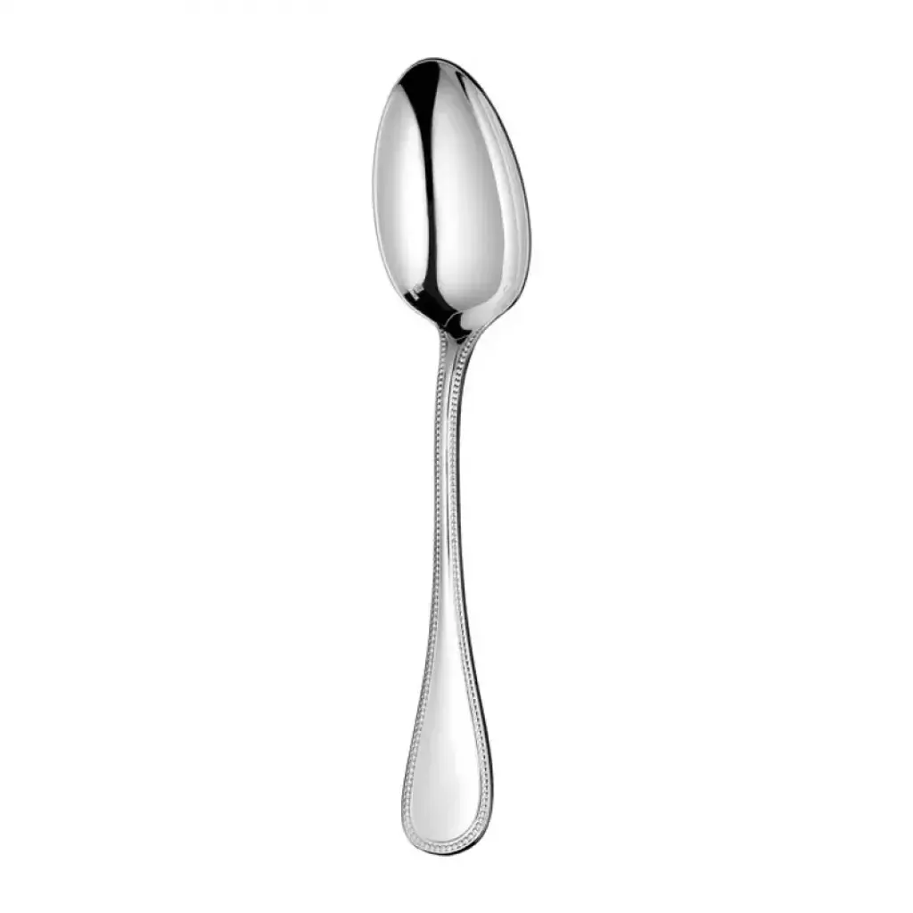 The silver plated steak knife in the Perles pattern is the same size as the dinner knife but has a pointed and serrated blade suited for cutting meat. The Louis XVI-style Perles pattern, which features a single delicate line of beading reminiscent of a classic pearl necklace, was introduced in 1876. Launched in 1890, this pattern is inspired by the beaded ornamentation typical of the Louis XVI style. Thanks to its creations in silver, Christofle is a symbol of luxury and elegance. Since its founding in the mid-19th century, it has been a continous innovative force and has infused each era with a new art of living. Thus, over time, this prestigious company has revolutionized styles, techniques, and methods for the production and distribution of silver plate and the decorative arts. A player in and privileged witness to the evolution of taste, customs, and traditions, Christofle has always seen its name associated with major creative trends, renowned artists such as Man Ray or Jean Cocteau, avant-garde architects such as Gio Ponti, and modernist silversmiths such as Lino Sabattini and Christian Fjerdingsatd, as well as present-day designers such as Andrée Putman, Martin Szekely or Ora ïto. Today, as in the past, whether gracing the tables of emperors, princes, or maharajas, in palaces, on board the Trans-Siberian Railway, Orient Express, or transatlantic ocean liners, or in the contemporary restaurants, Christofle continues to make an impression.