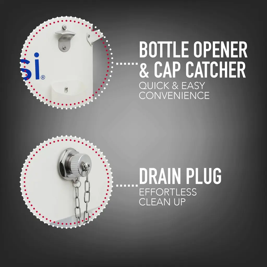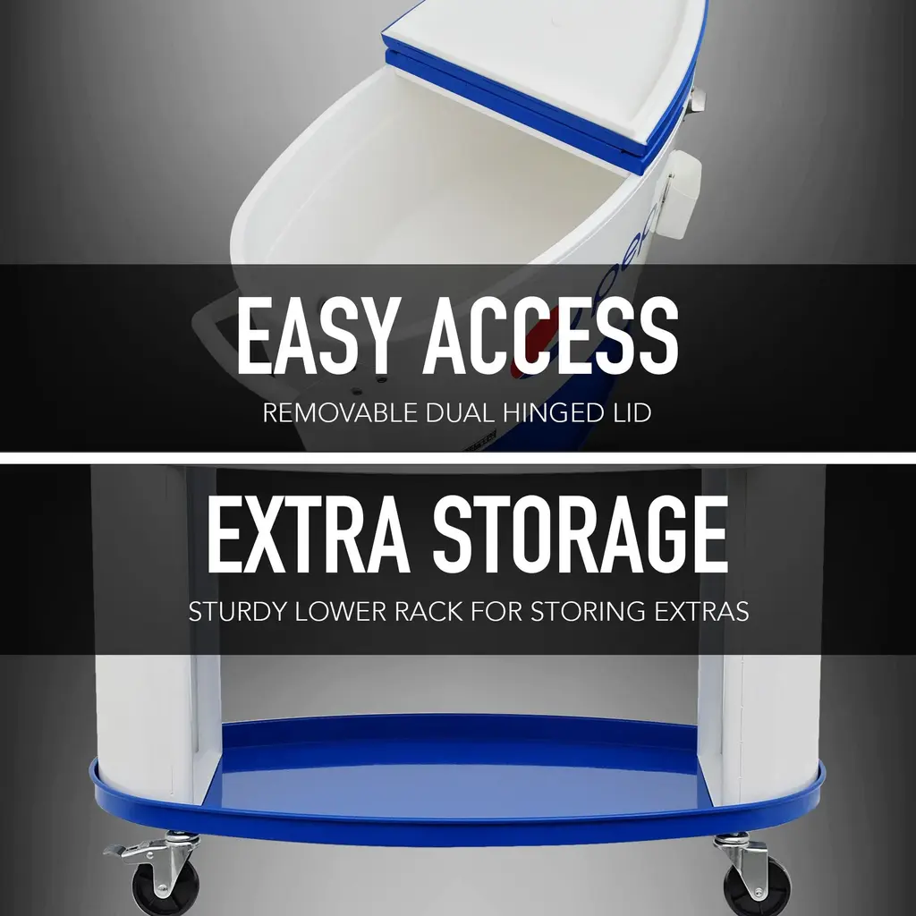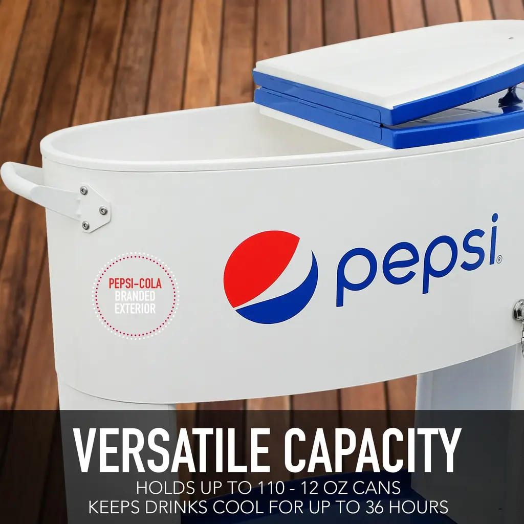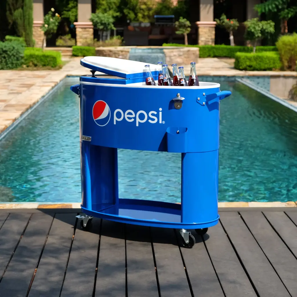 The Permasteel 80-Qt Sporty Oval Rolling Patio Cooler Cart with Pepsi Logo adds a touch of elegance to any backyard or outdoor patio. Entertain your guests with this stylish powder-coated steel cooler cart, featuring an insulated basin that keeps your beverages cold for hours with its injected molded insulation technology. It holds up to 110 12-ounce cans, with plenty of room for ice.The cooler's powder-coated finish ensures long-lasting durability, and the split double lid provides easy access to cold drinks. Once you have your preferred beverage, you can conveniently remove the cap with the built-in bottle opener and cap catcher. This patio cooler includes four heavy-duty casters for easy mobility, with two locking casters for stability once in place. You can effortlessly roll this cooler to any location where the party is happening.After use, simply pull the plug to drain. The convenient lower shelf provides extra space for additional beverages or other items. Feel confident that the Permasteel patio cooler will meet all your patio cooling needs.