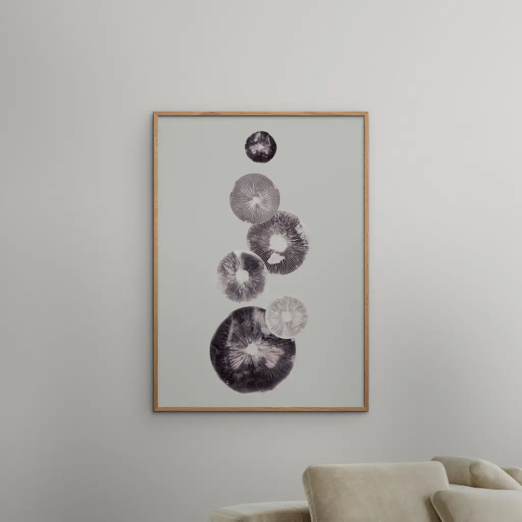 Discover “Mushroom – 4 Grey” by Pernille Folcarelli. Featuring an arrangement of various sized mushrooms, this captivating work showcases the woodland staple’s intricate gill patterns and unique textures. The monochromatic palette enhances the natural beauty of these fungi, inviting viewers to explore their complex structures. A striking piece, perfect for avant-garde interiors. Unframed. Available in three sizes.