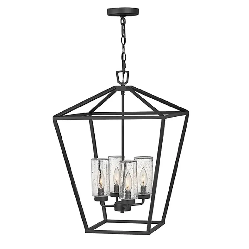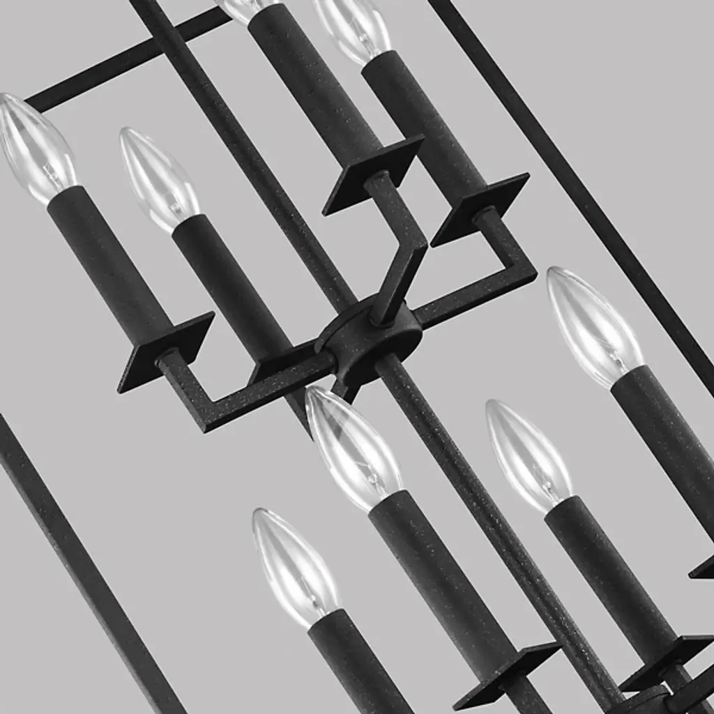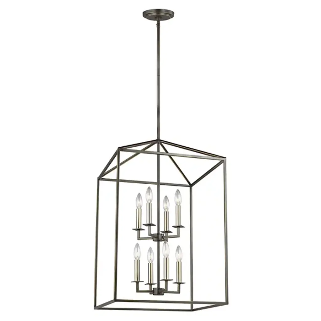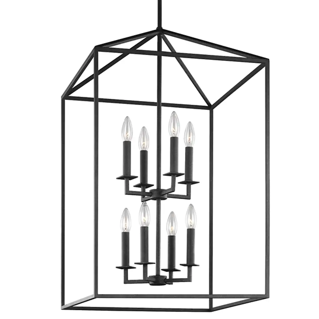 Inspired by stately, carriage lanterns, the Perryton Two-Tier Foyer Pendant by Generation Lighting, formerly known as Sea Gull Lighting, brings an alluring ambiance to your home décor. Its open frame, formed by square steel tubing, is constructed around two inner candelabras with exposed lamping. When on, its warm light radiates off the frame and into the surrounding space for an illumination that is both pleasant and useful.