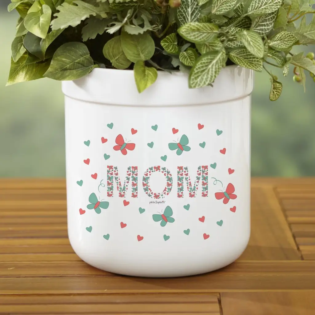 Brighten mom’s day with this delightful ceramic flower pot, featuring a playful “MOM” design surrounded by fluttering butterflies and tiny hearts. With soft shades of pink, red, and teal, this charming pot captures the warmth and joy a mother brings to every day. Perfect for fresh blooms, greenery, or even as a decorative piece, this flower pot is a sweet and simple way to show your appreciation. Whether it’s for Mother’s Day, a birthday, or just because, this pot is a heartwarming gift that’s sure to make her smile.
