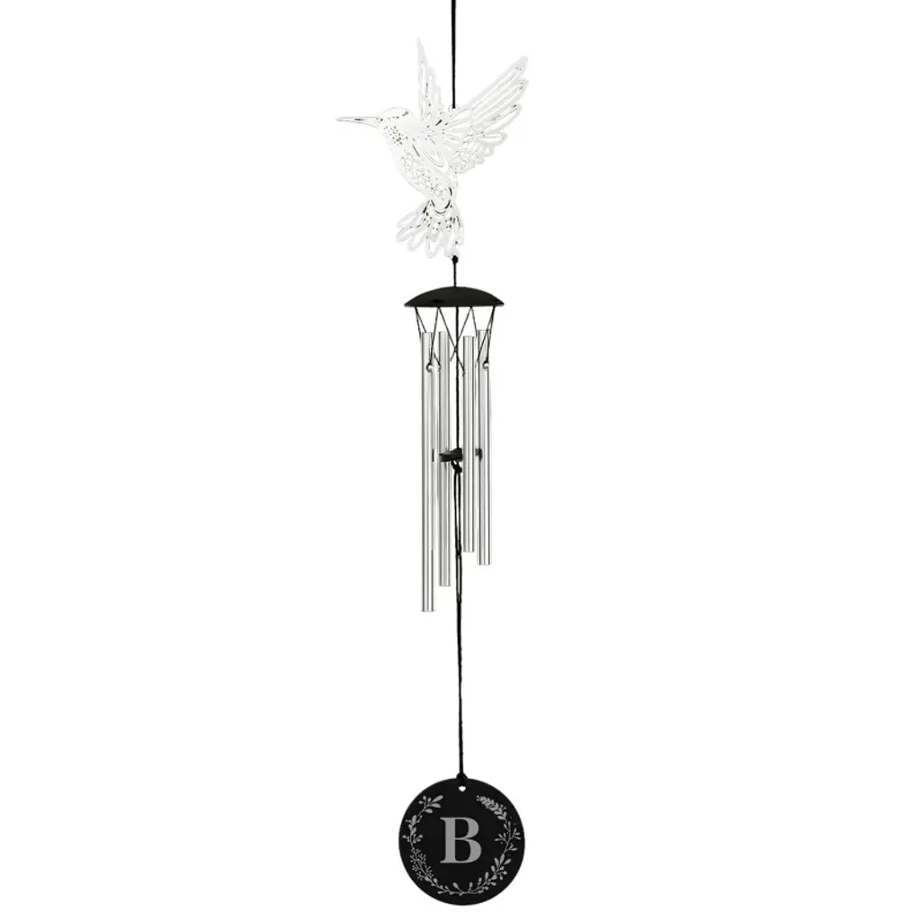 Adorn your outdoor sanctuary with the Hummingbird Initial Plaque Wind Chimes. Featuring a delicate metal hummingbird ornament and aluminum chimes, these chimes will add a soothing melody when the wind blows. The hanging metal circle is engraved with a first or last initial, adding a personalized touch to your porch, garden, or outdoor space. These custom windchimes also make a wonderful gift for anyone who enjoys relaxing outdoors.