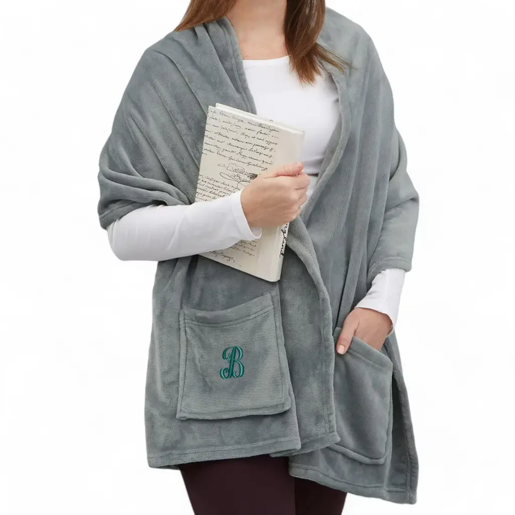 Keep yourself warm and cozy while relaxing in bed, watching TV or working at your desk with our Stylish Name Cuddle Wrap. This wrap has two pockets for increased functionality and features your embroidered initial on the right pocket.